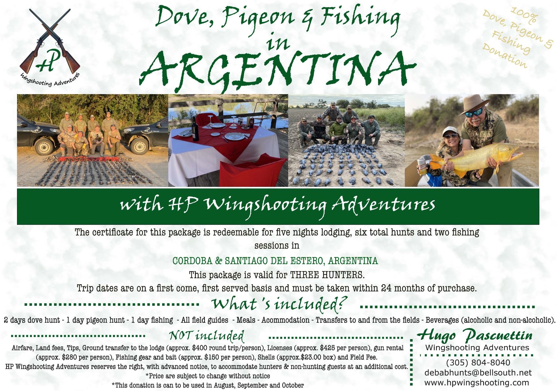 Not included: Airfare to Cordoba Airport (airport code: COR); Shells $23/box (subject to change – pay what you use); Gun rental $280/person (Bredas & Benelli's 20 ga & 12 ga); hunting license $425/person; Fishing license/gear/bait - $150; Airport round trip transfer $400/person; Transfer between lodges - $200; Field Service Fee $200/person;