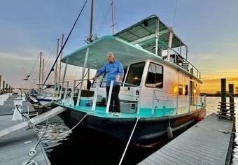 You'll stay aboard the stunning Cajun Queen, a 1961 remodeled tugboat turned liveaboard lodging with 2 bedrooms, 3-4 beds, full galley, dining space, and upper-level party deck.