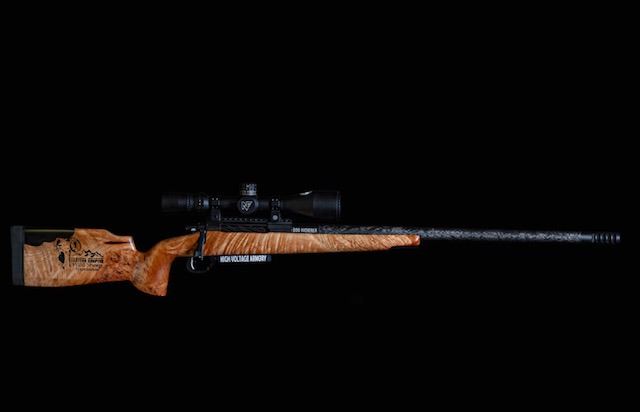 Build details: This firearm was custom built for the ECWSF and to celebrate our 35th Anniversary EXPO. Built off the High Voltage Armory action with a 26-inch proof research carbon barrel, bedded into a custom made maple wood stock cloned to the HVA carbon stock with the ECWSF logo engraved into the stock. The rifle is set-up with a Nightforce NX8 4-32X50 mm moa reticle rifle scope and 100 rounds of custom ammo.