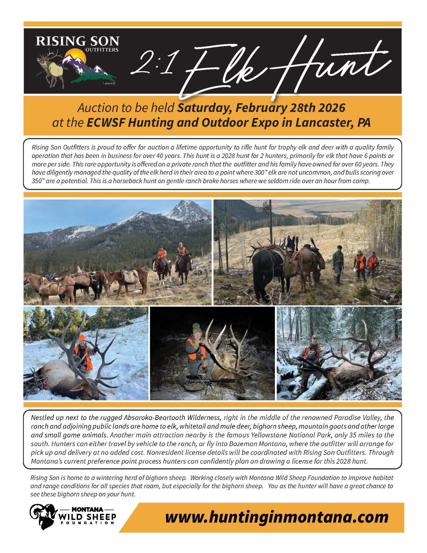 Hunt details: 2 hunters, private land, horseback, fair chase, combo elk/deer (whitetail/mule deer), 5 day hunt, October 30th-November 3rd, 2028, hunt location is south central Montana on the Petrich Ranch in Paradise Valley – 35 miles north of Yellowstone, lodging in cabins with meals provided.