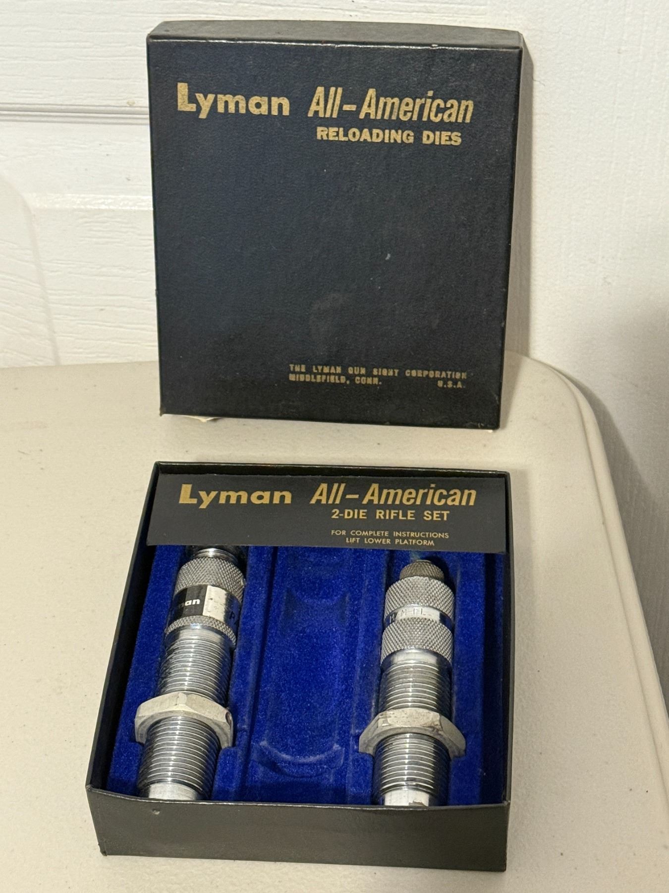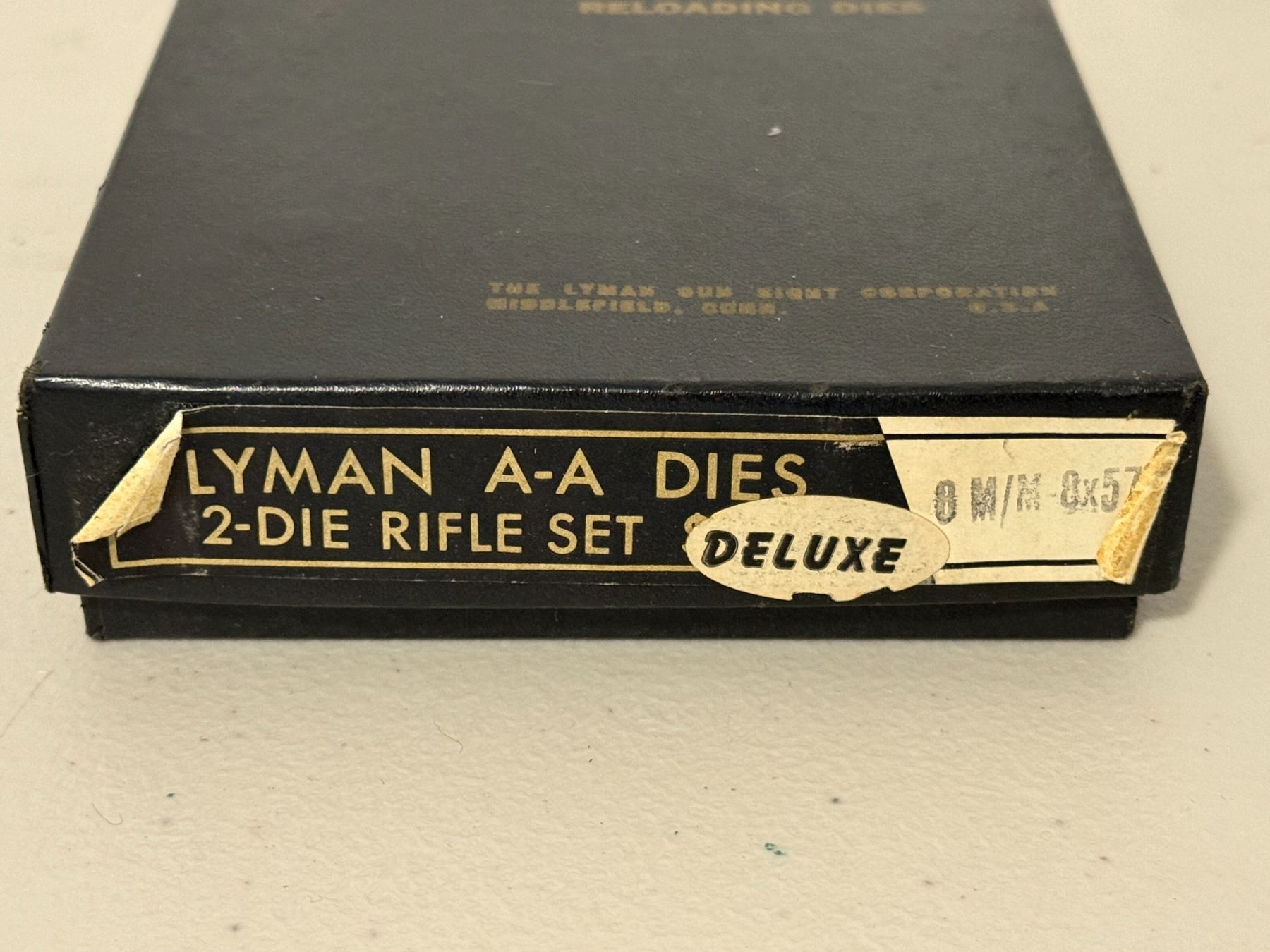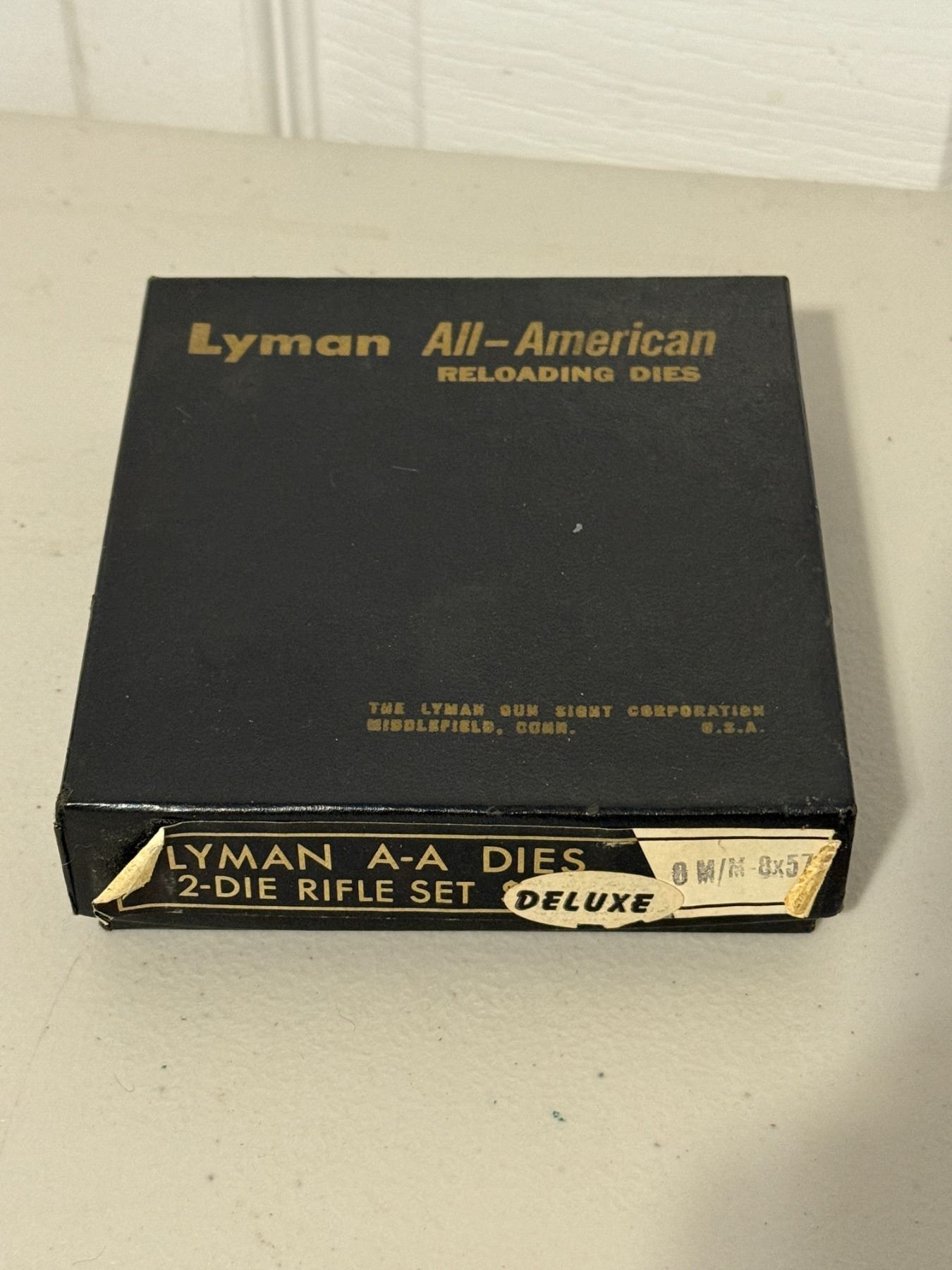 Vintage Lyman All-American (A-A) Deluxe 2-die rifle set in 8mm, complete with original box. Dies appear clean and well cared for. A great addition for reloaders or collectors of classic Lyman equipment. Condition as shown in photos.