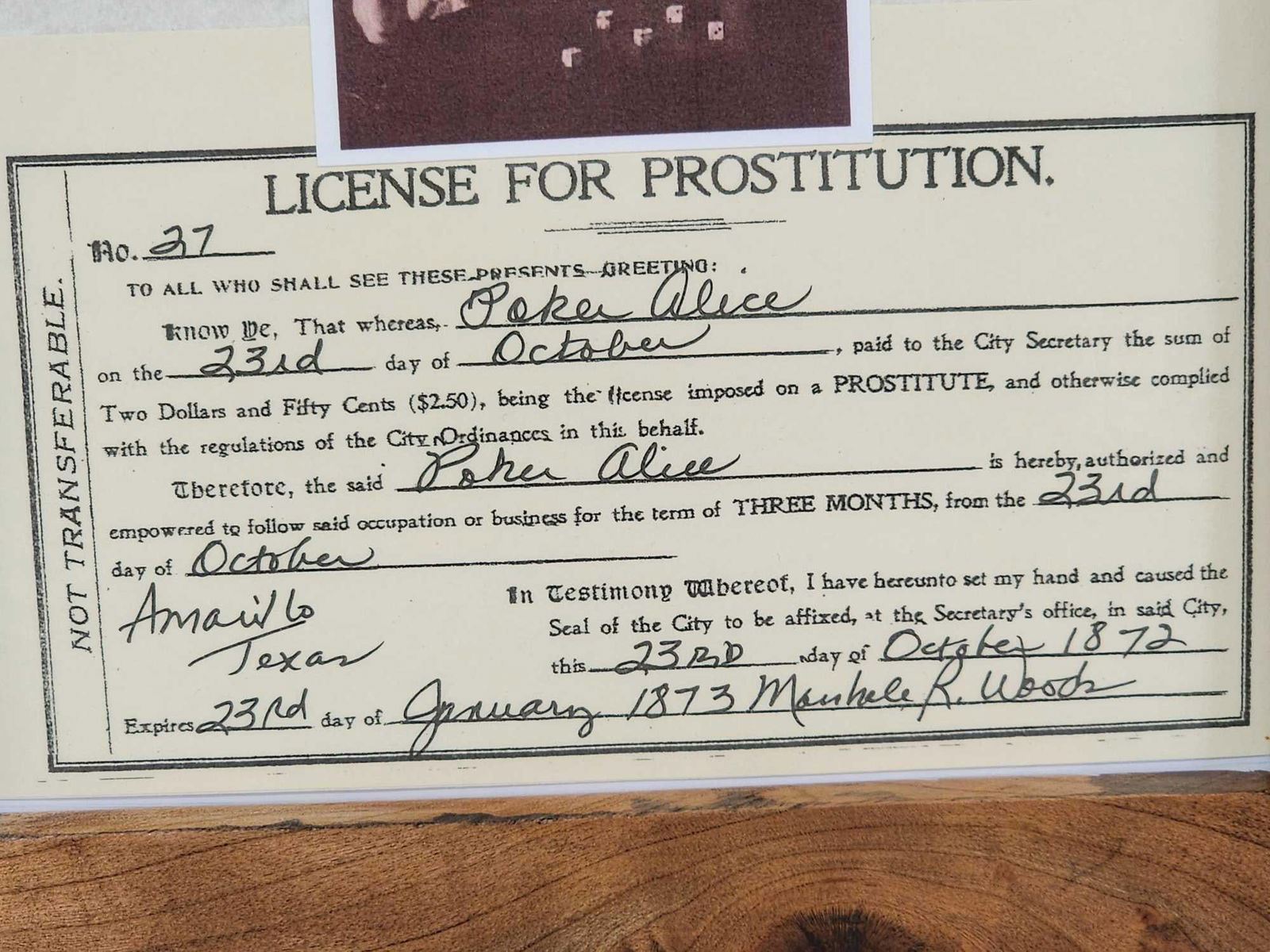 Lot 14A Copy Of 1873 Amarillo Texas Prostitution License