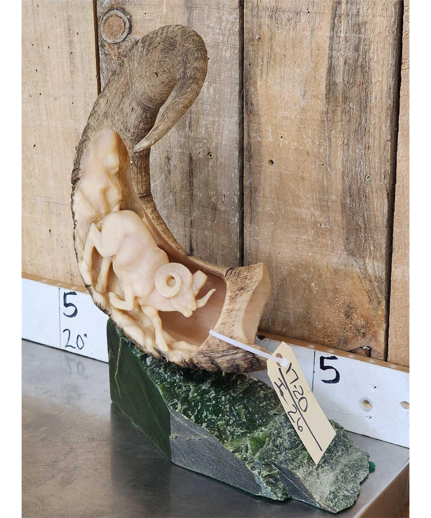 17.20 Awesome detail 3 dimensional carving of a stone Sheep in authentic horn mounted on Canadian Jade stone base