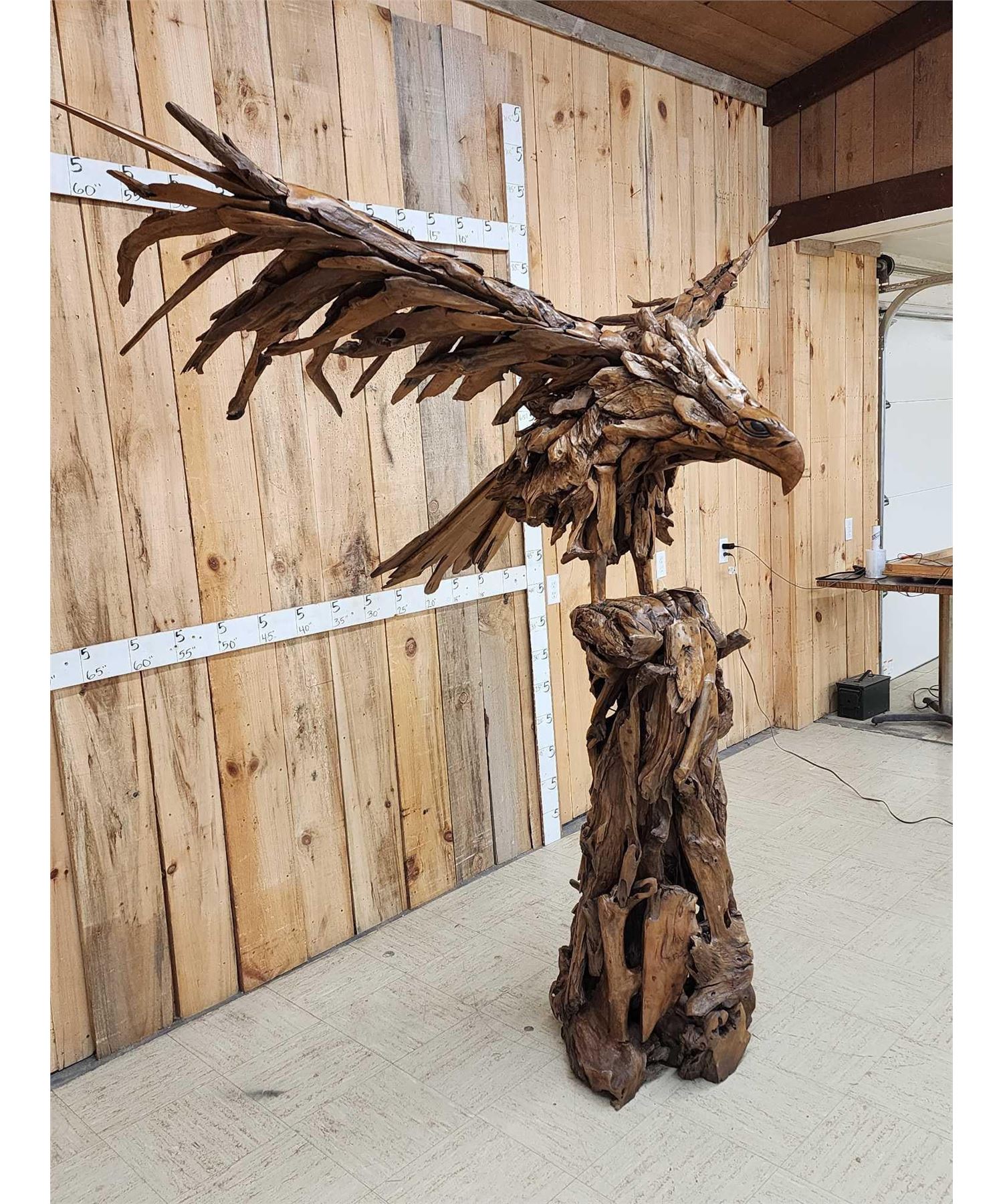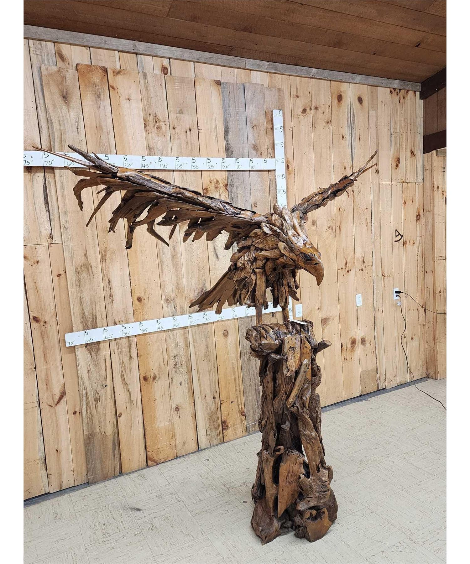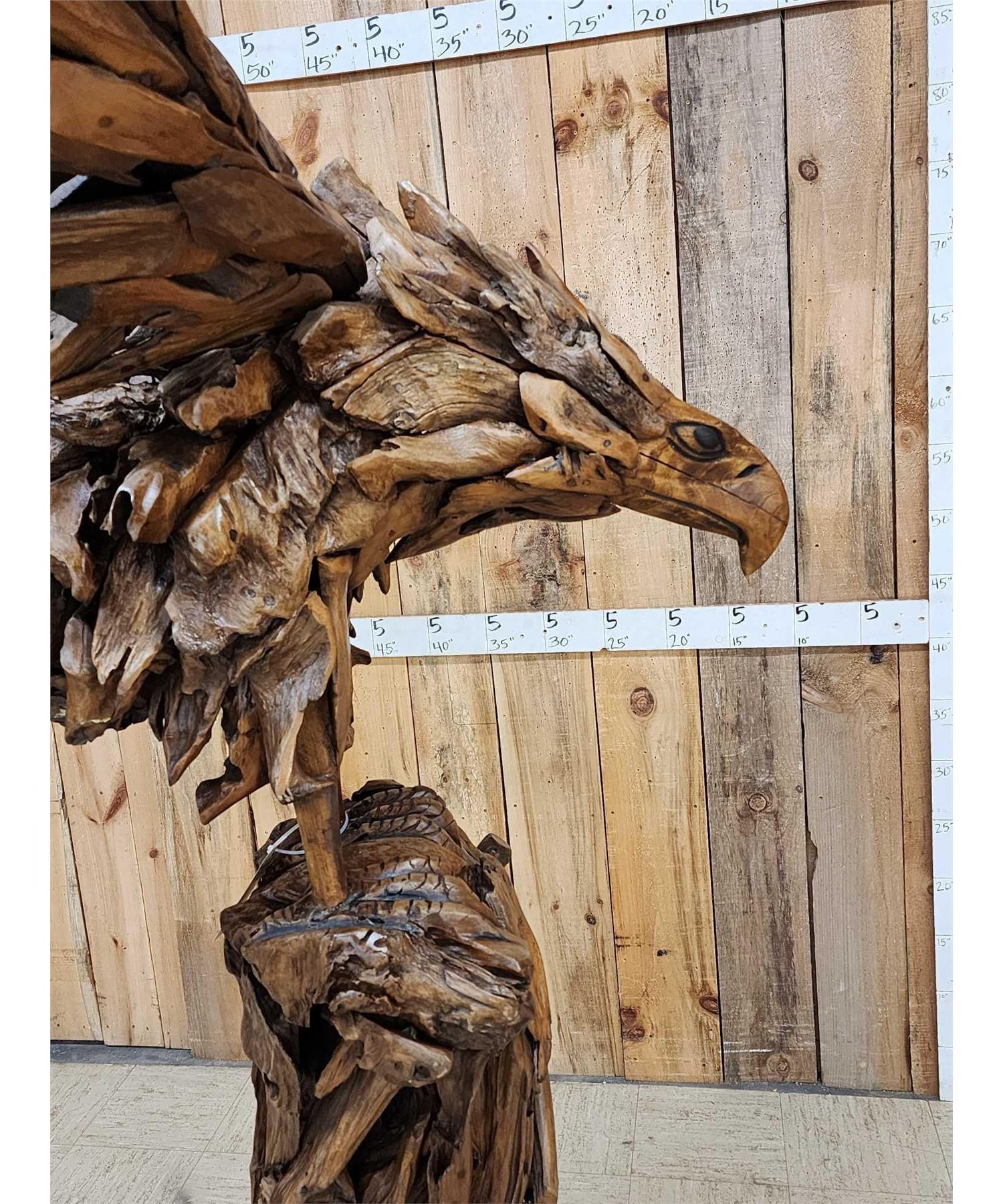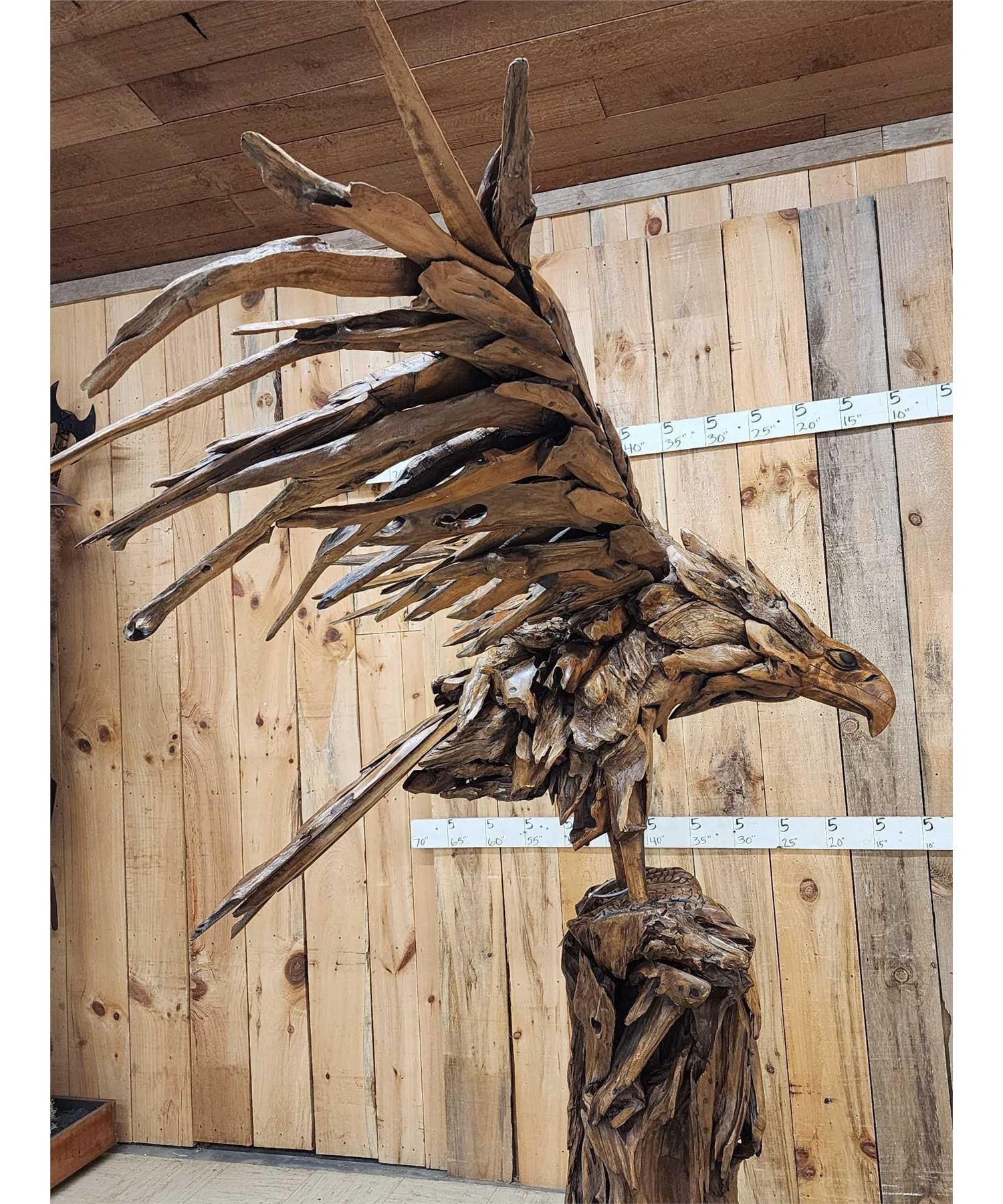 1.1 Made with applied hand selected driftwood pieces on a wooden armature with hand Carved detail awesome look detachable wings for easy transport overall dimensions about 93" wide x 48" from beak to tail x 86" tall