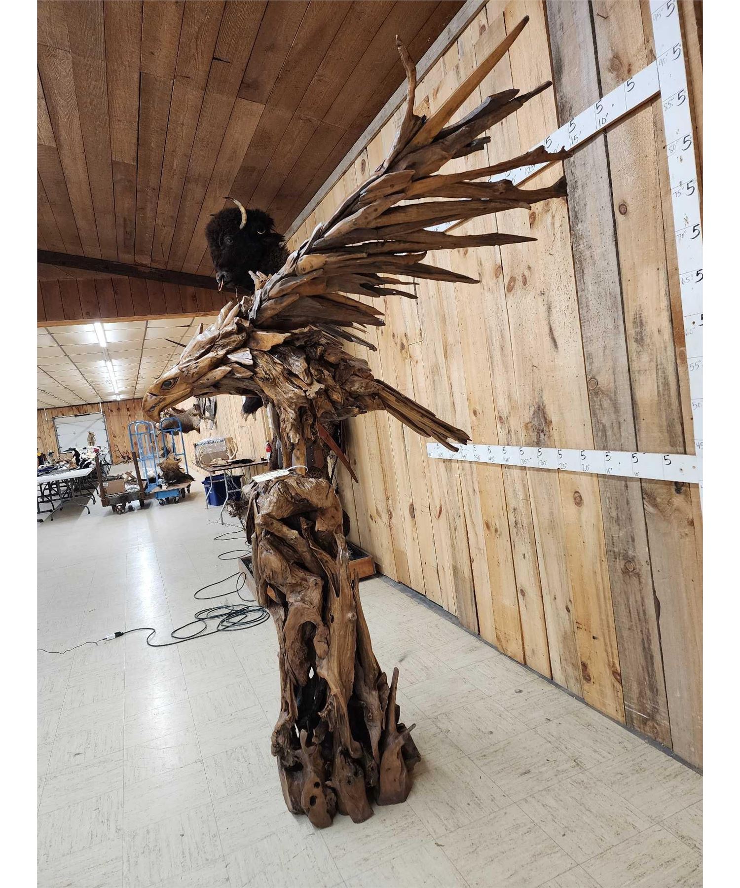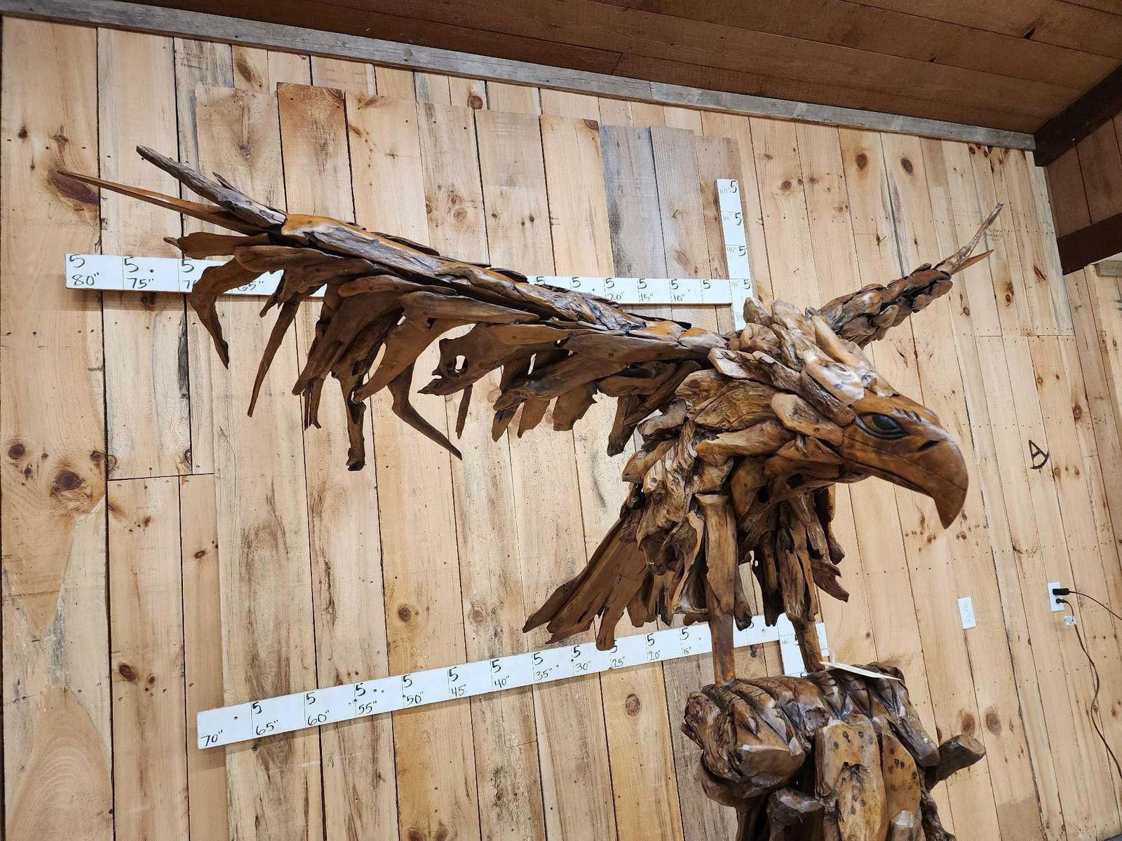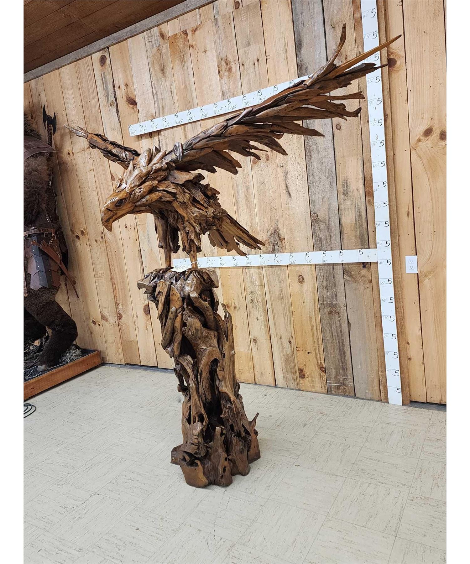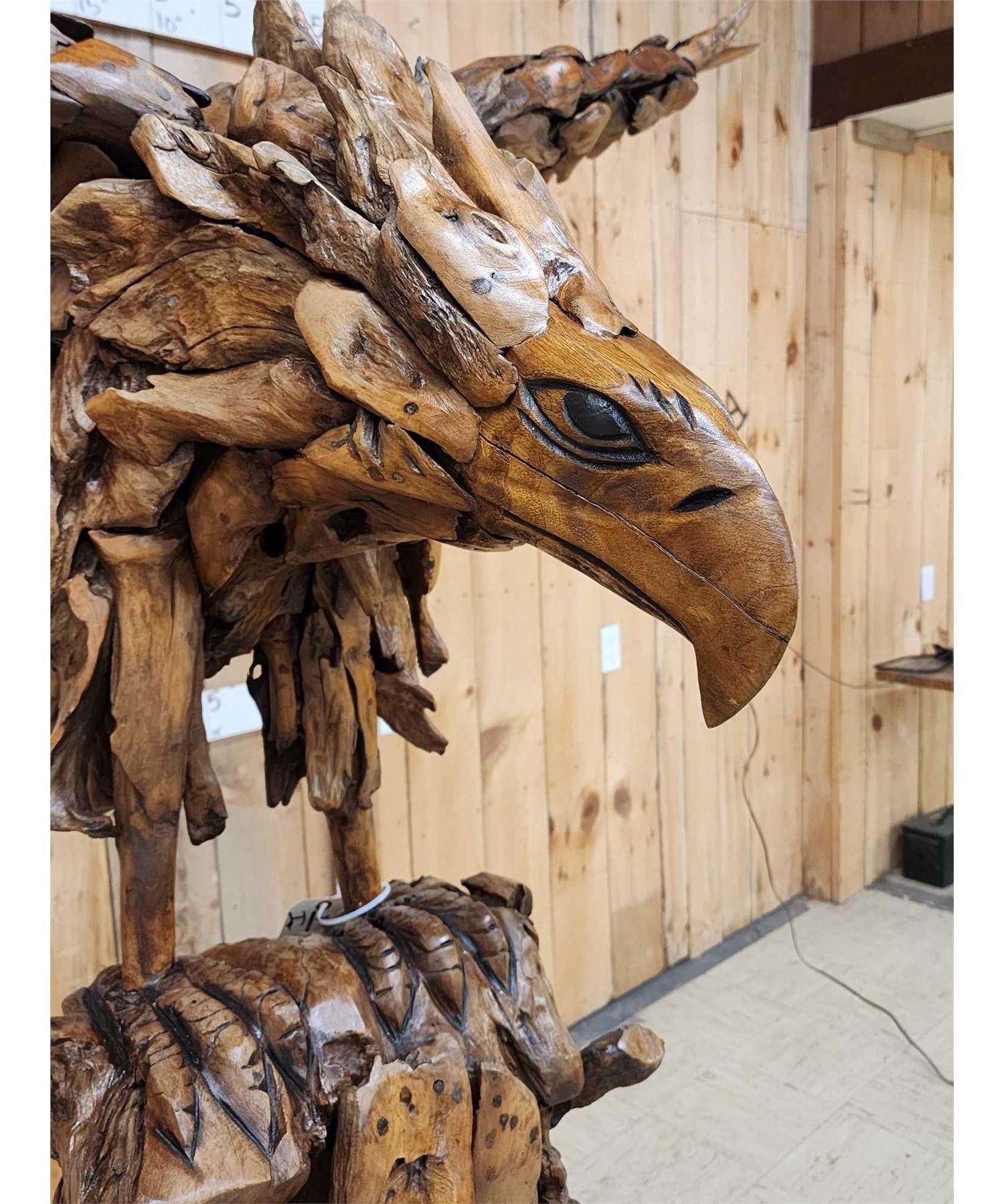 1.1 Made with applied hand selected driftwood pieces on a wooden armature with hand Carved detail awesome look detachable wings for easy transport overall dimensions about 93" wide x 48" from beak to tail x 86" tall