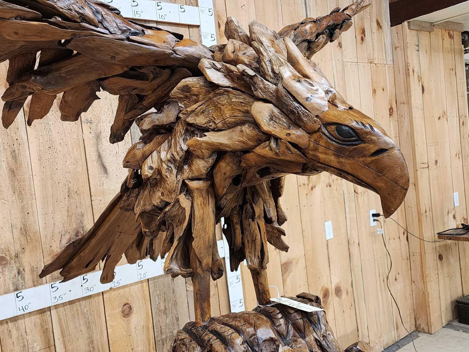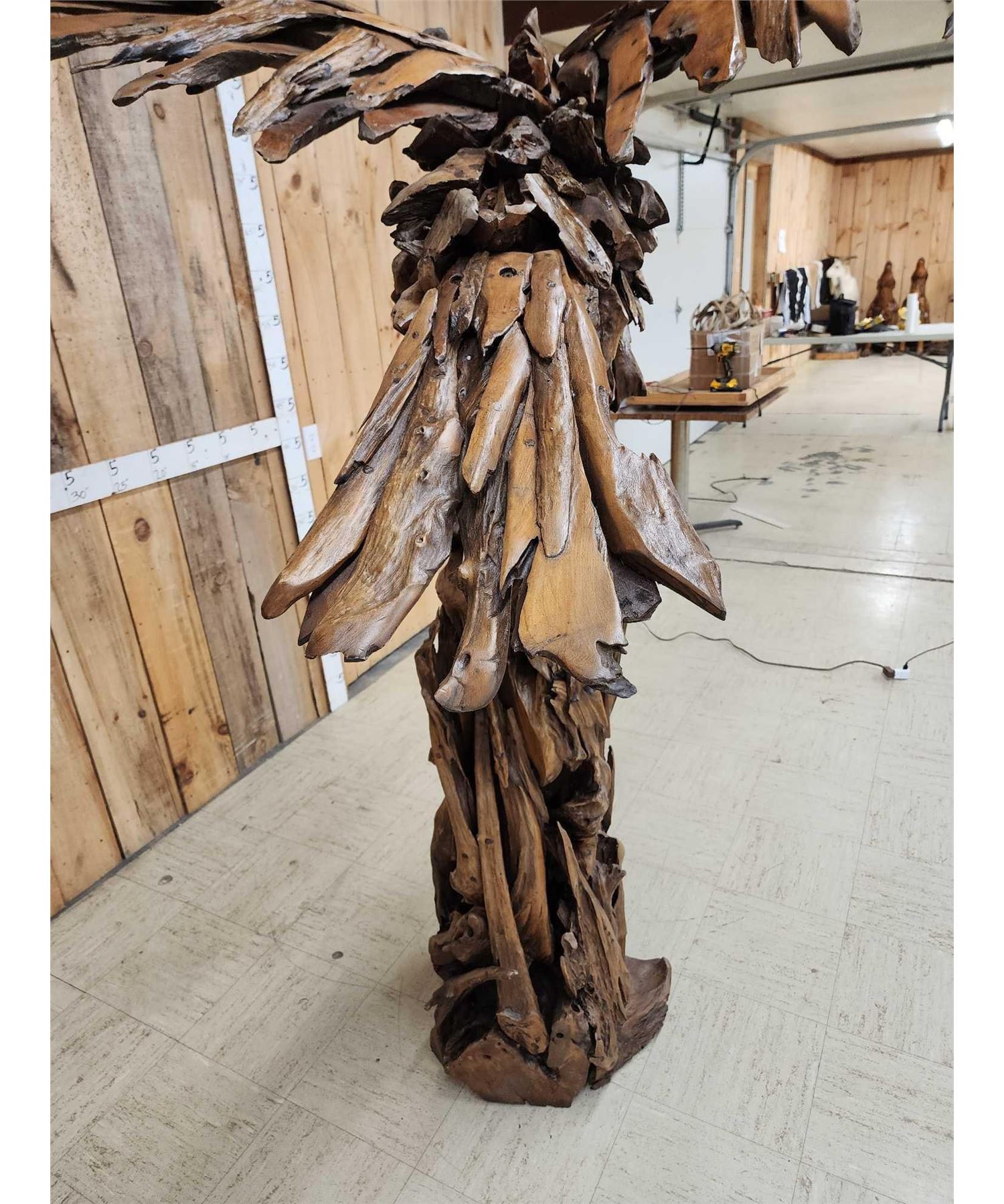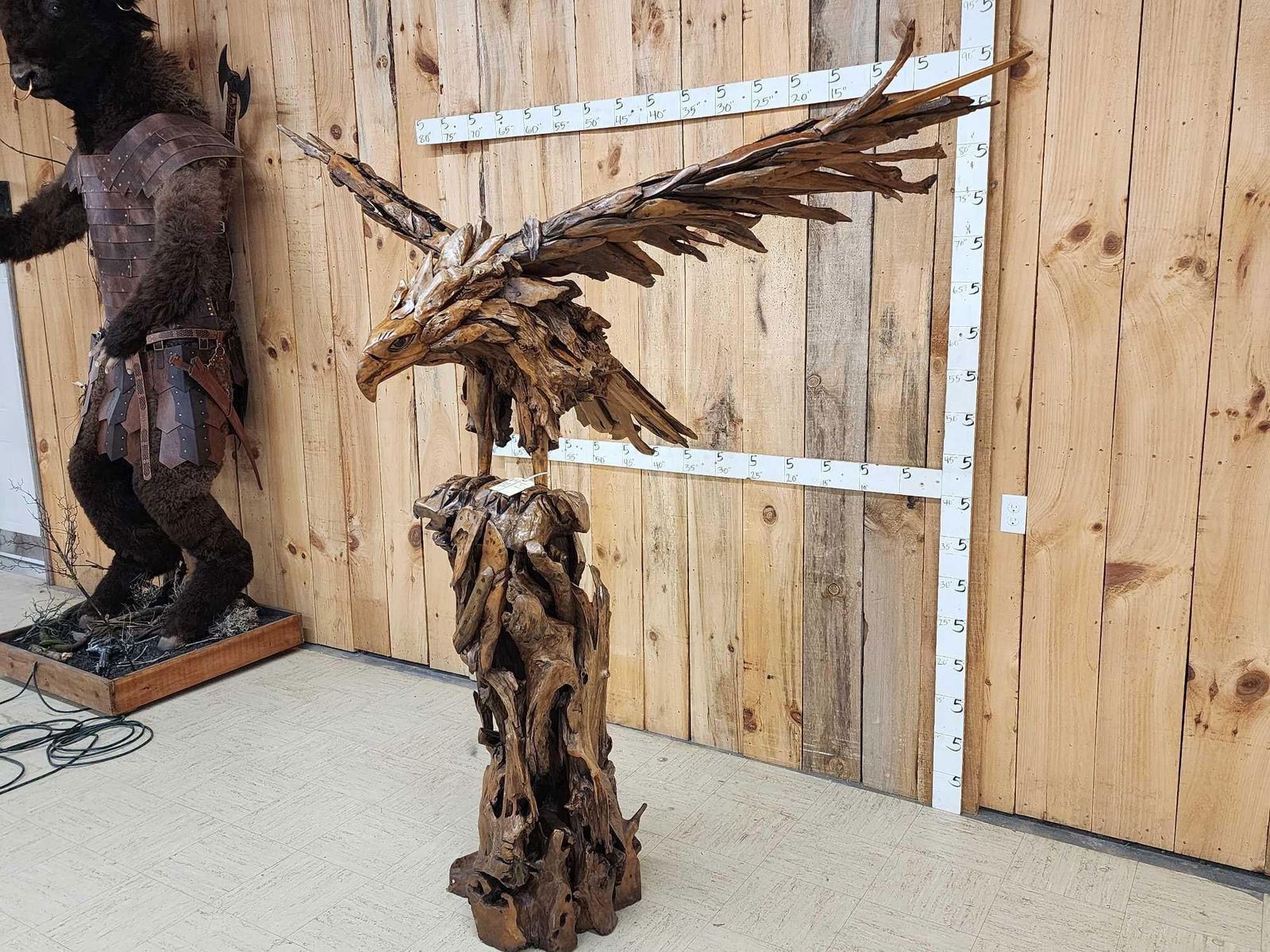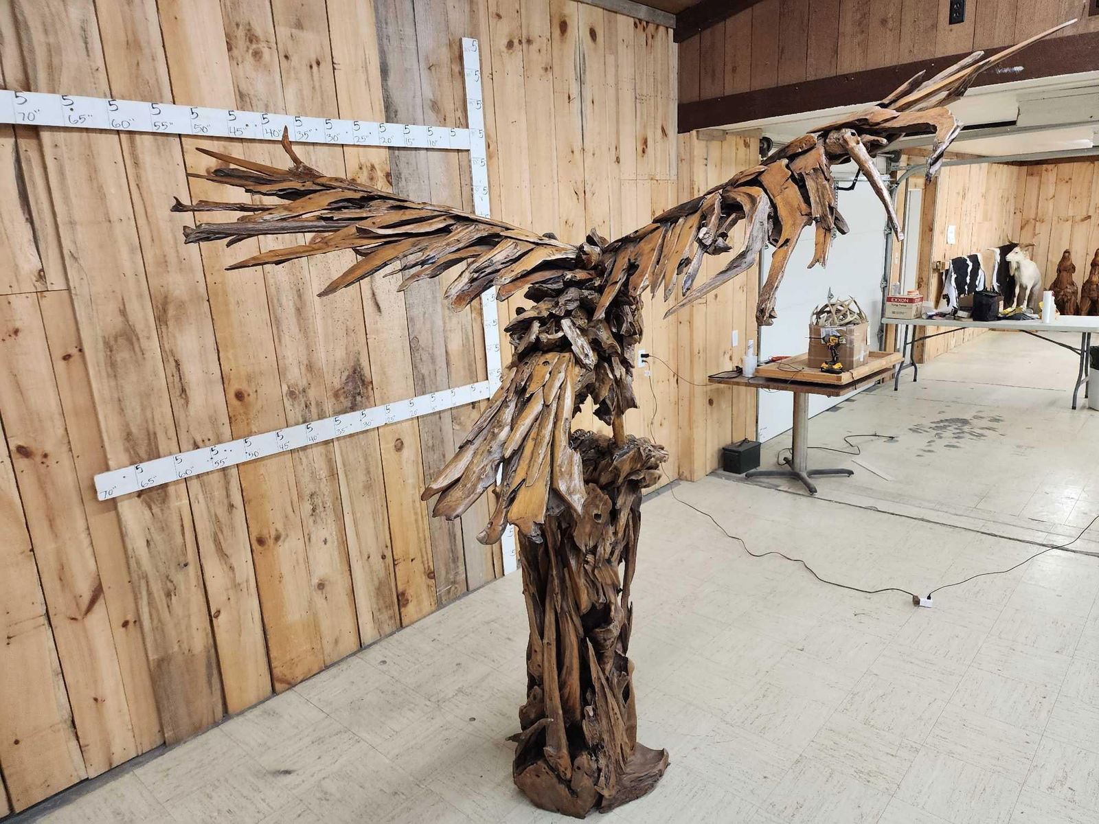 1.1 Made with applied hand selected driftwood pieces on a wooden armature with hand Carved detail awesome look detachable wings for easy transport overall dimensions about 93" wide x 48" from beak to tail x 86" tall