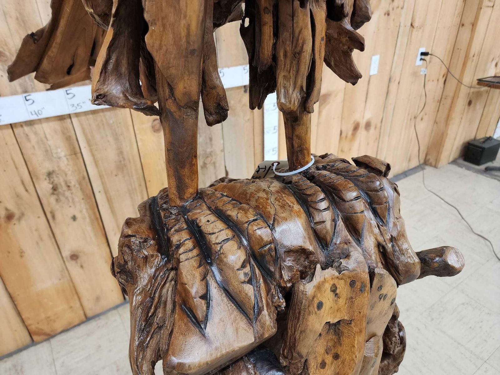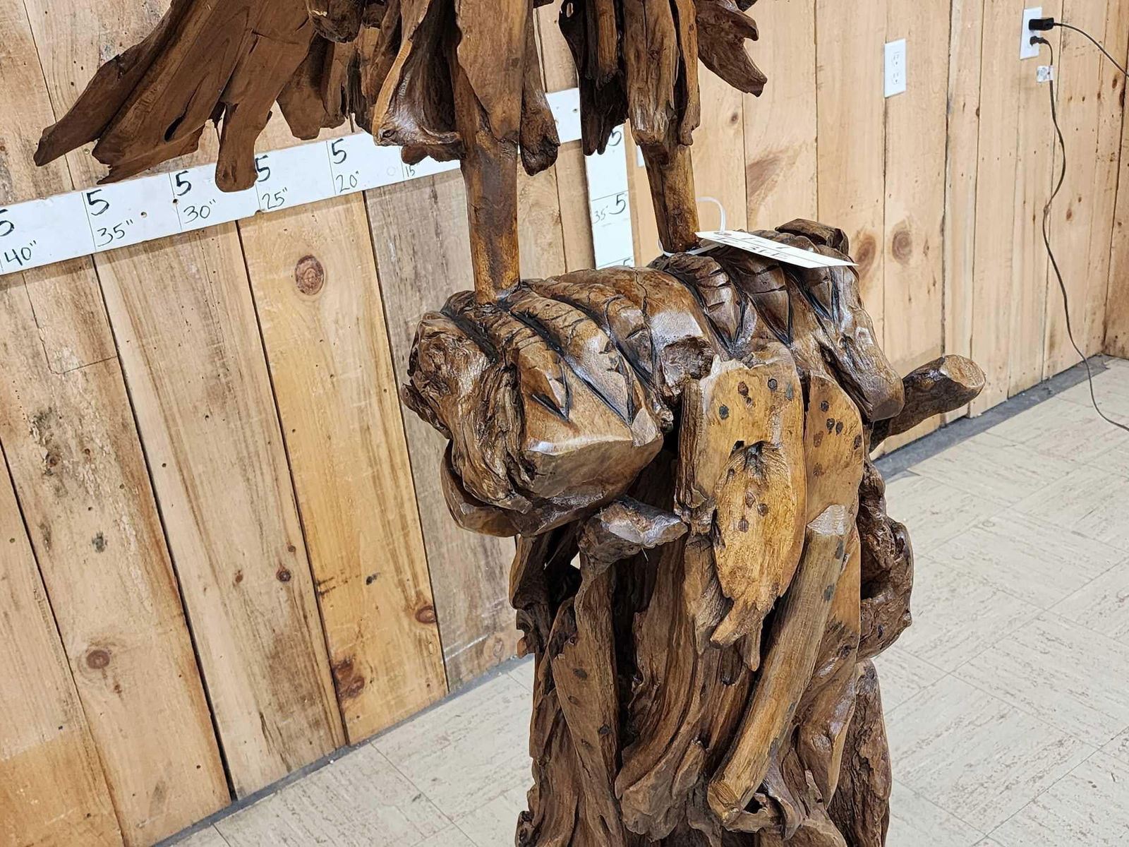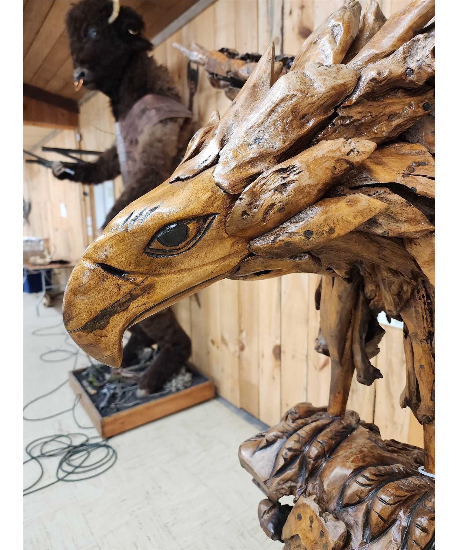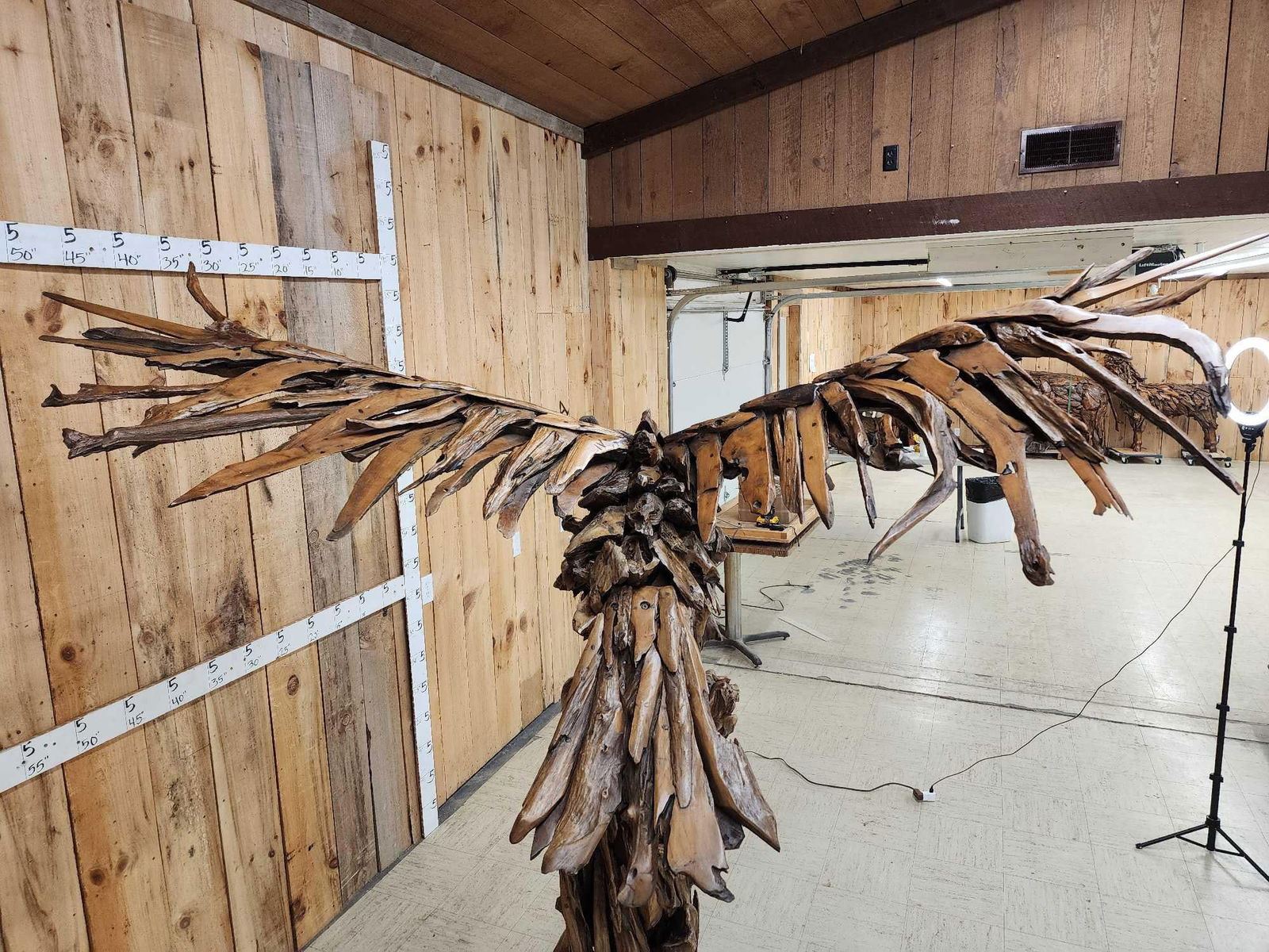 1.1 Made with applied hand selected driftwood pieces on a wooden armature with hand Carved detail awesome look detachable wings for easy transport overall dimensions about 93" wide x 48" from beak to tail x 86" tall