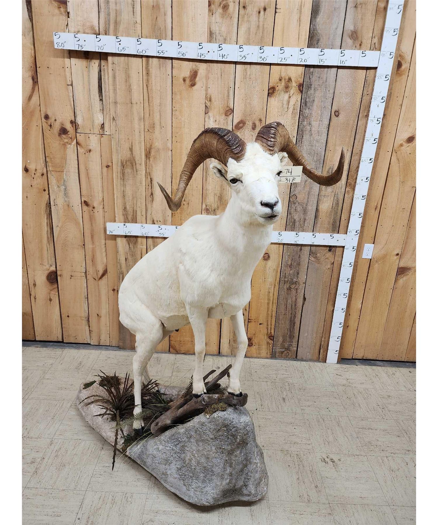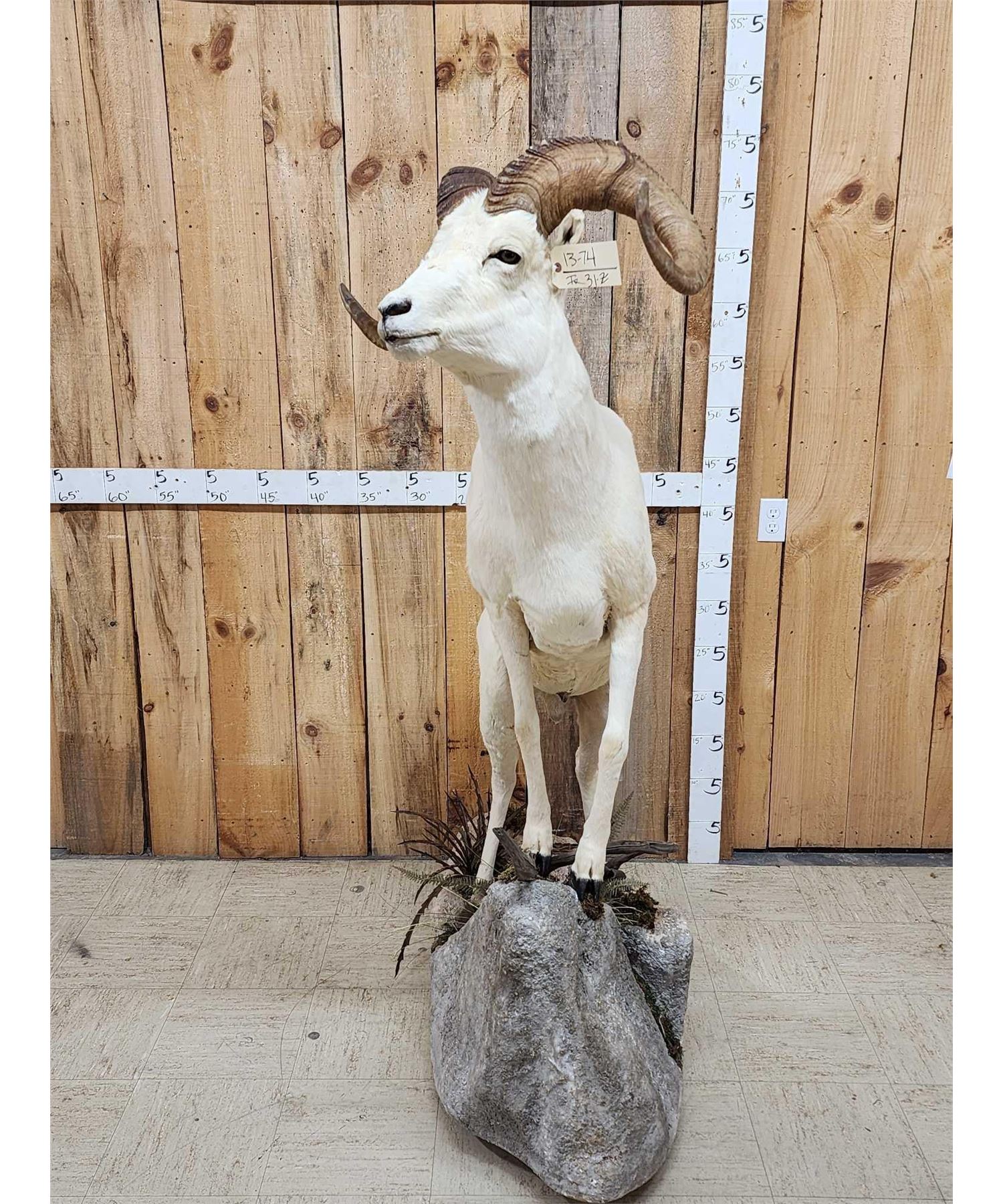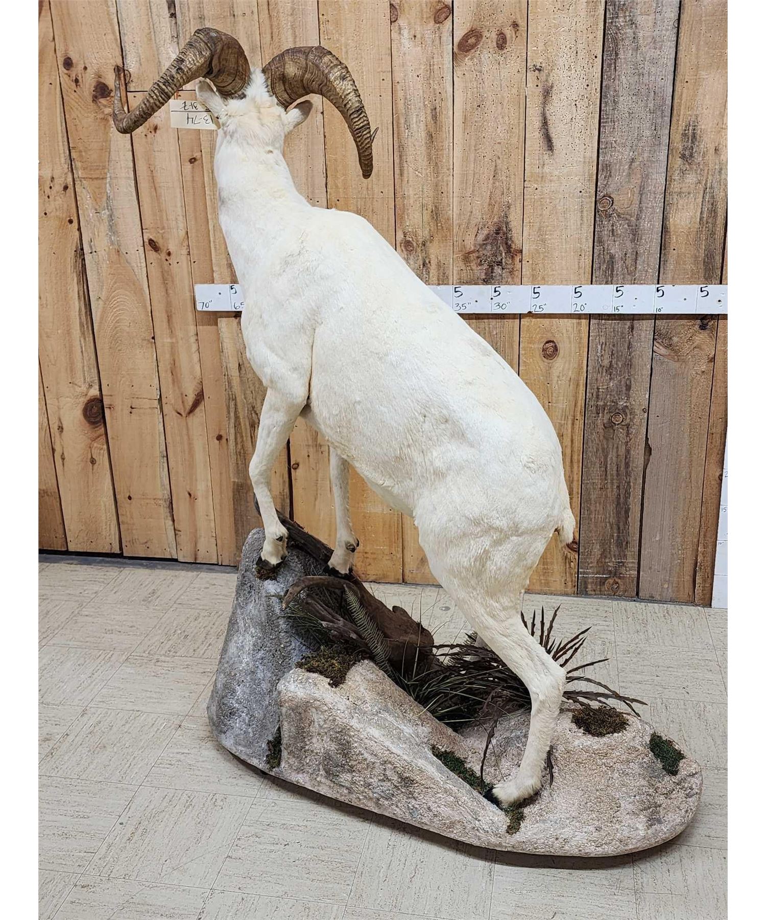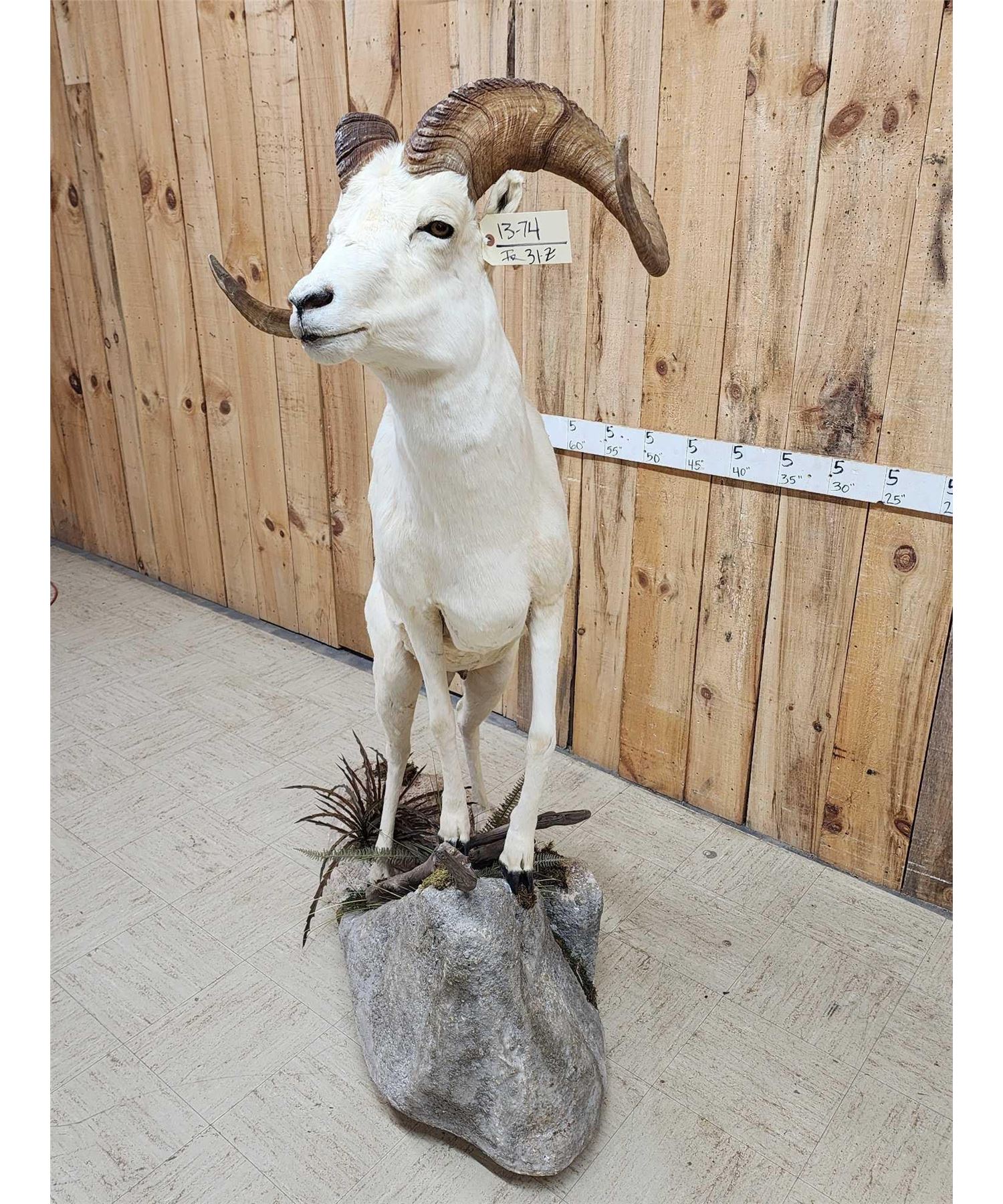 13.74 Attractive mount full curl horns Right horn length about 34" with a 13" base Left about 33 2/8" with a 13 1/8" base minimal shedding unlike most Dall Sheep on roll around habitat base
