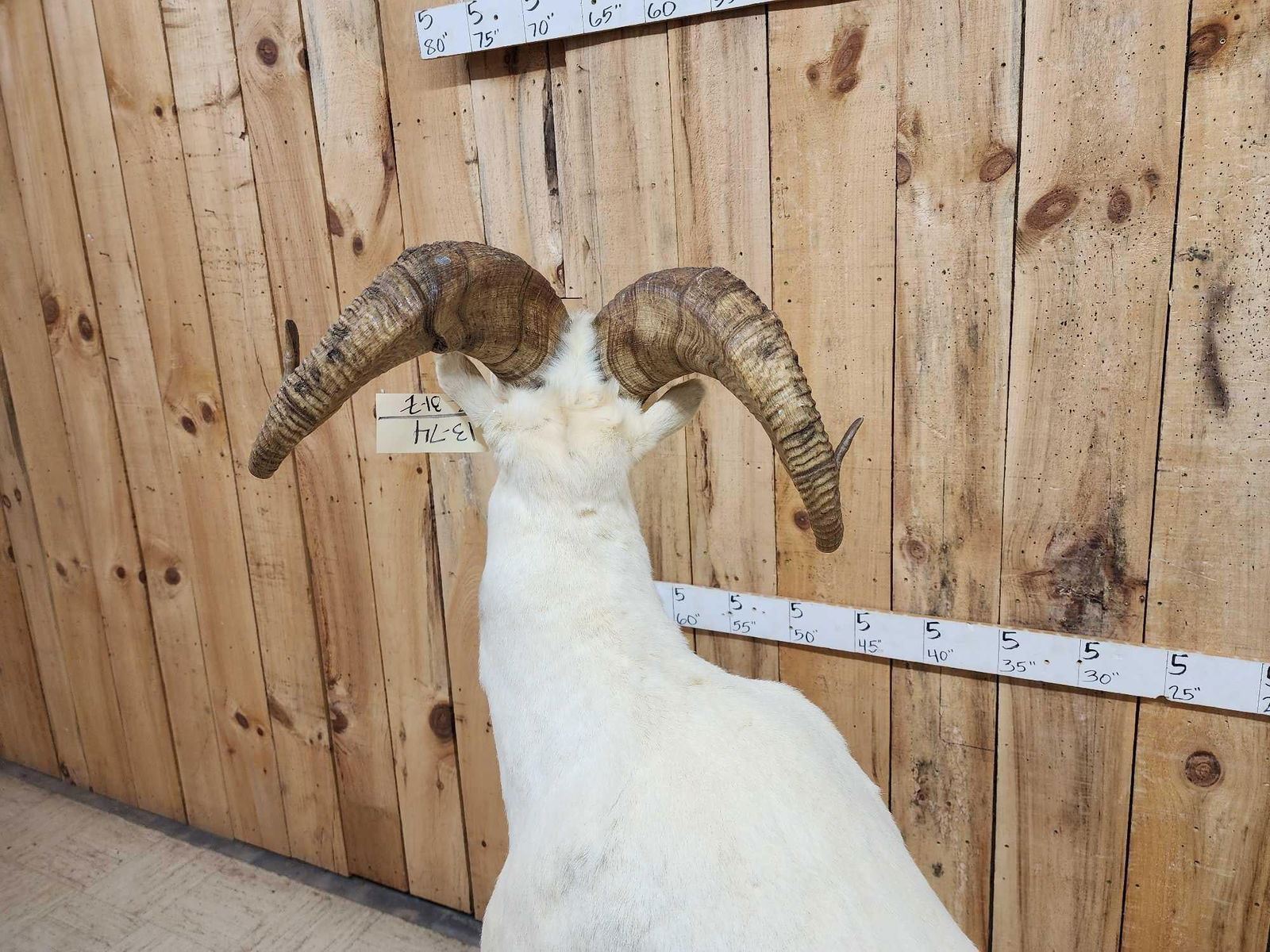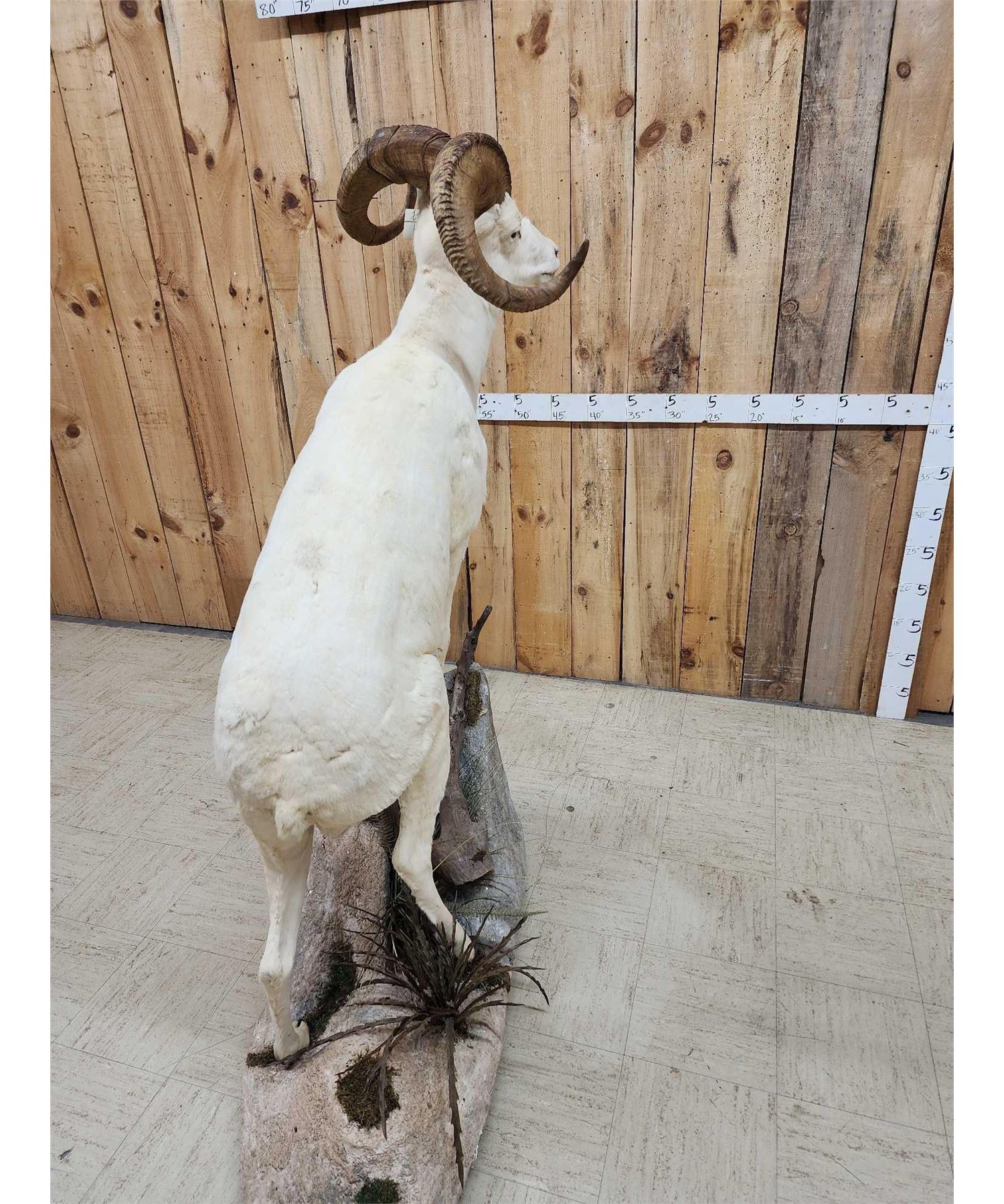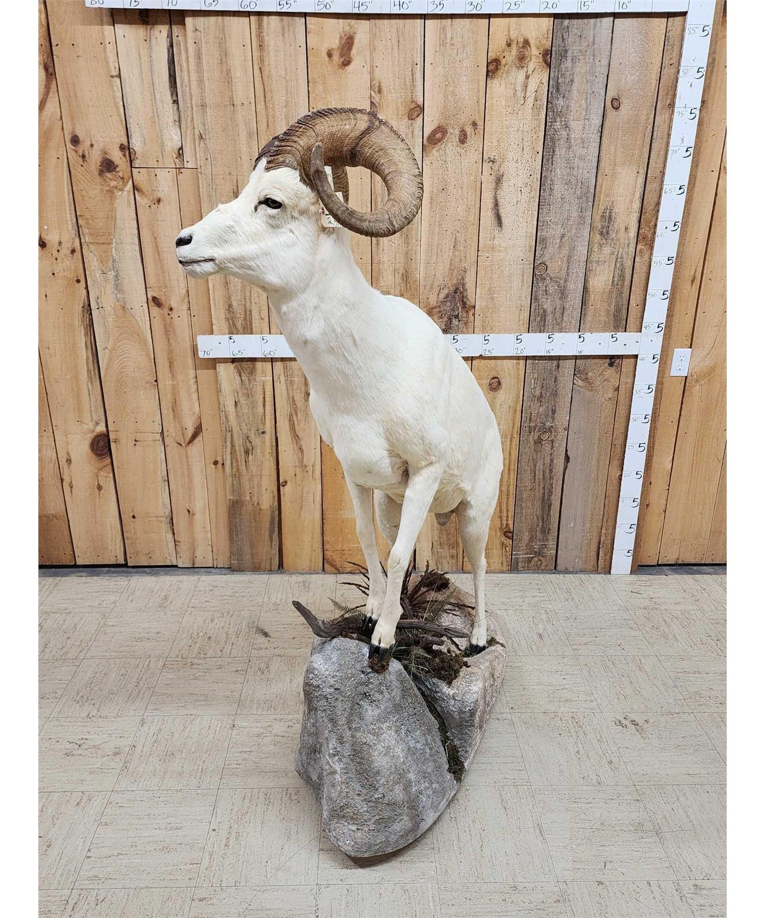 13.74 Attractive mount full curl horns Right horn length about 34" with a 13" base Left about 33 2/8" with a 13 1/8" base minimal shedding unlike most Dall Sheep on roll around habitat base