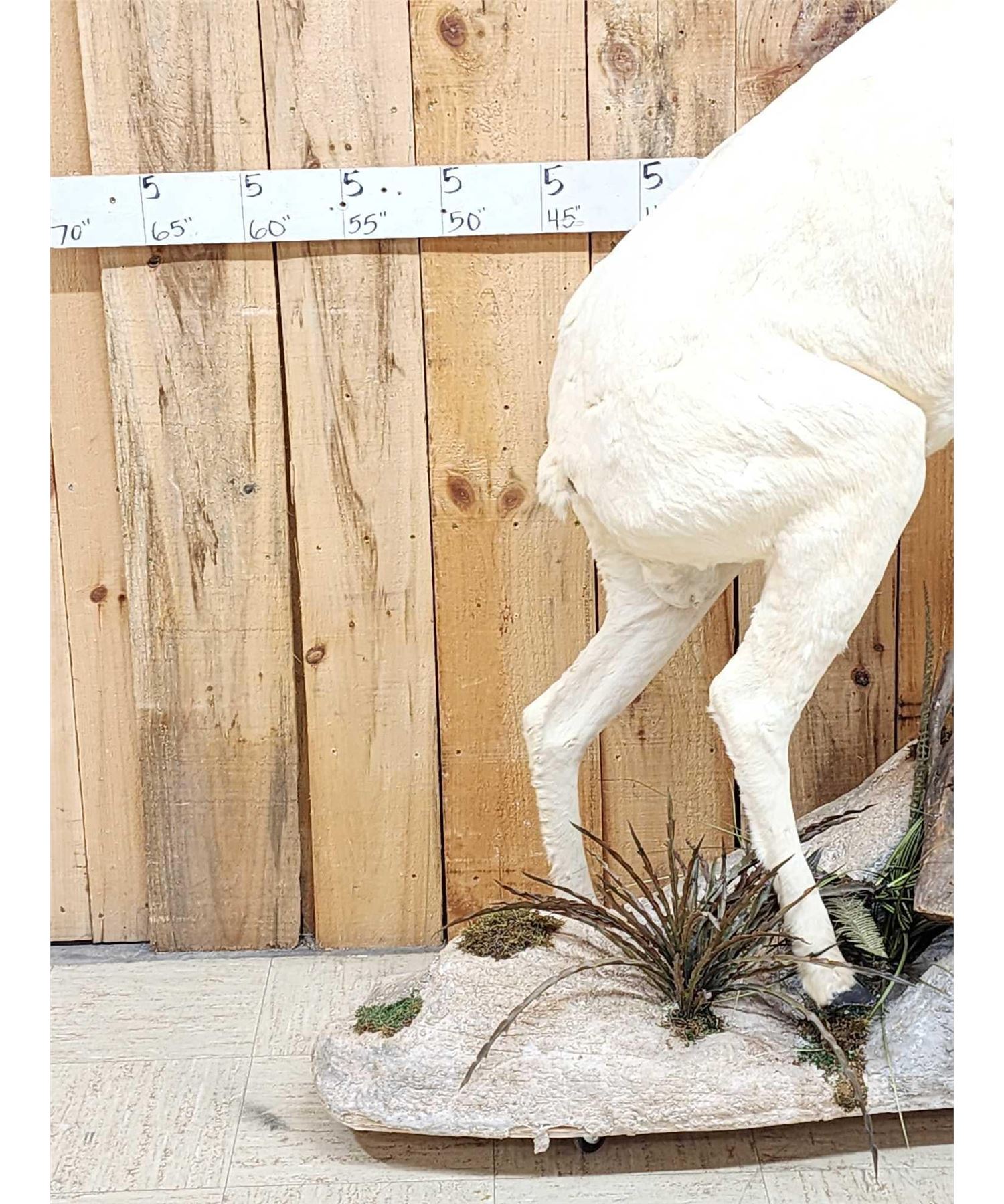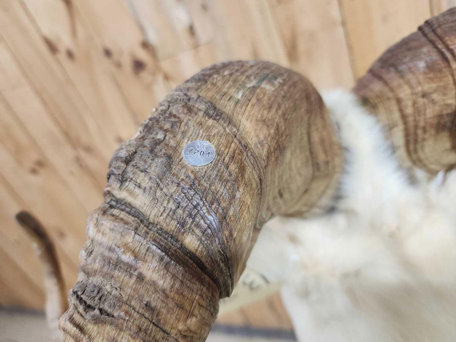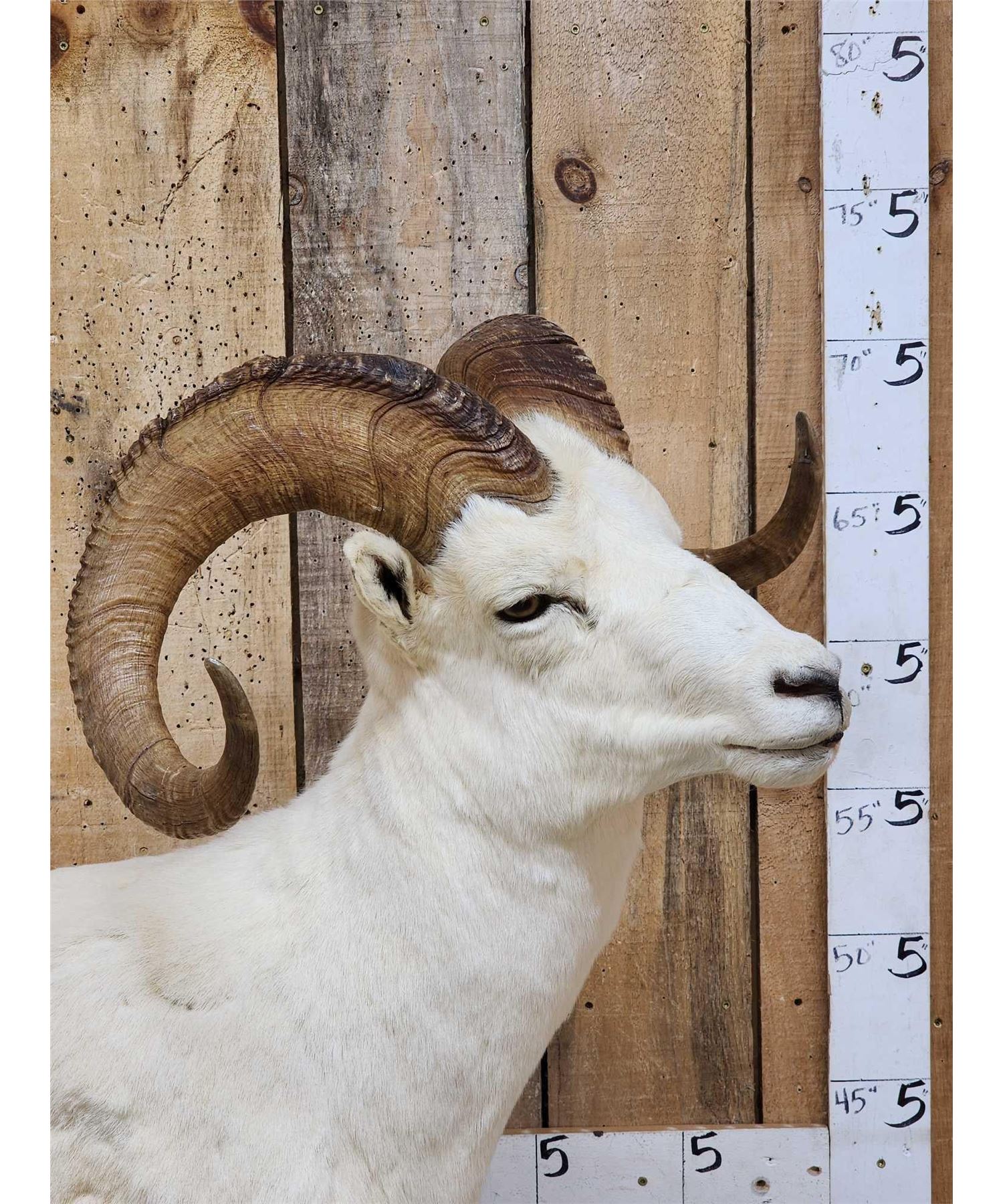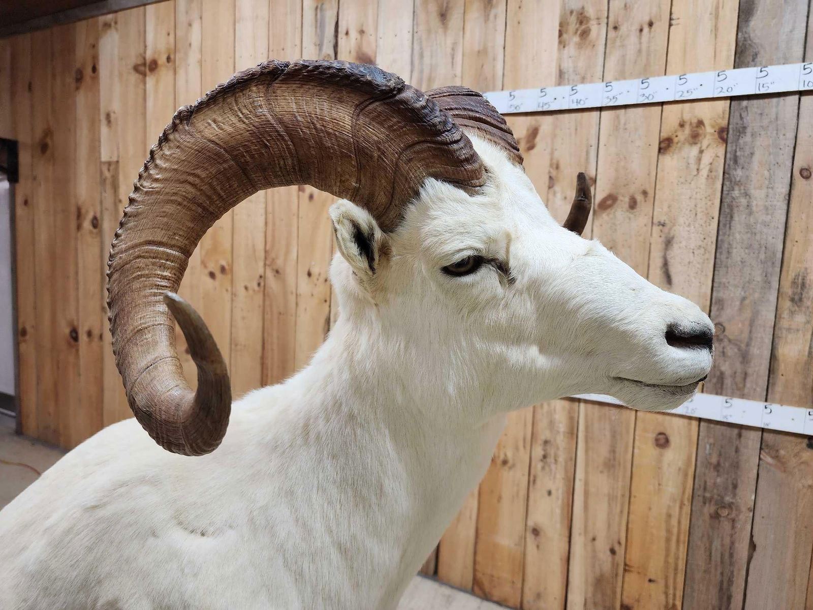 13.74 Attractive mount full curl horns Right horn length about 34" with a 13" base Left about 33 2/8" with a 13 1/8" base minimal shedding unlike most Dall Sheep on roll around habitat base