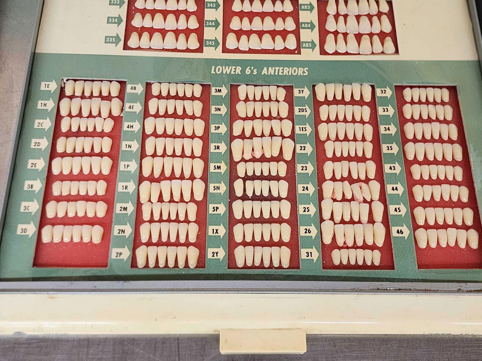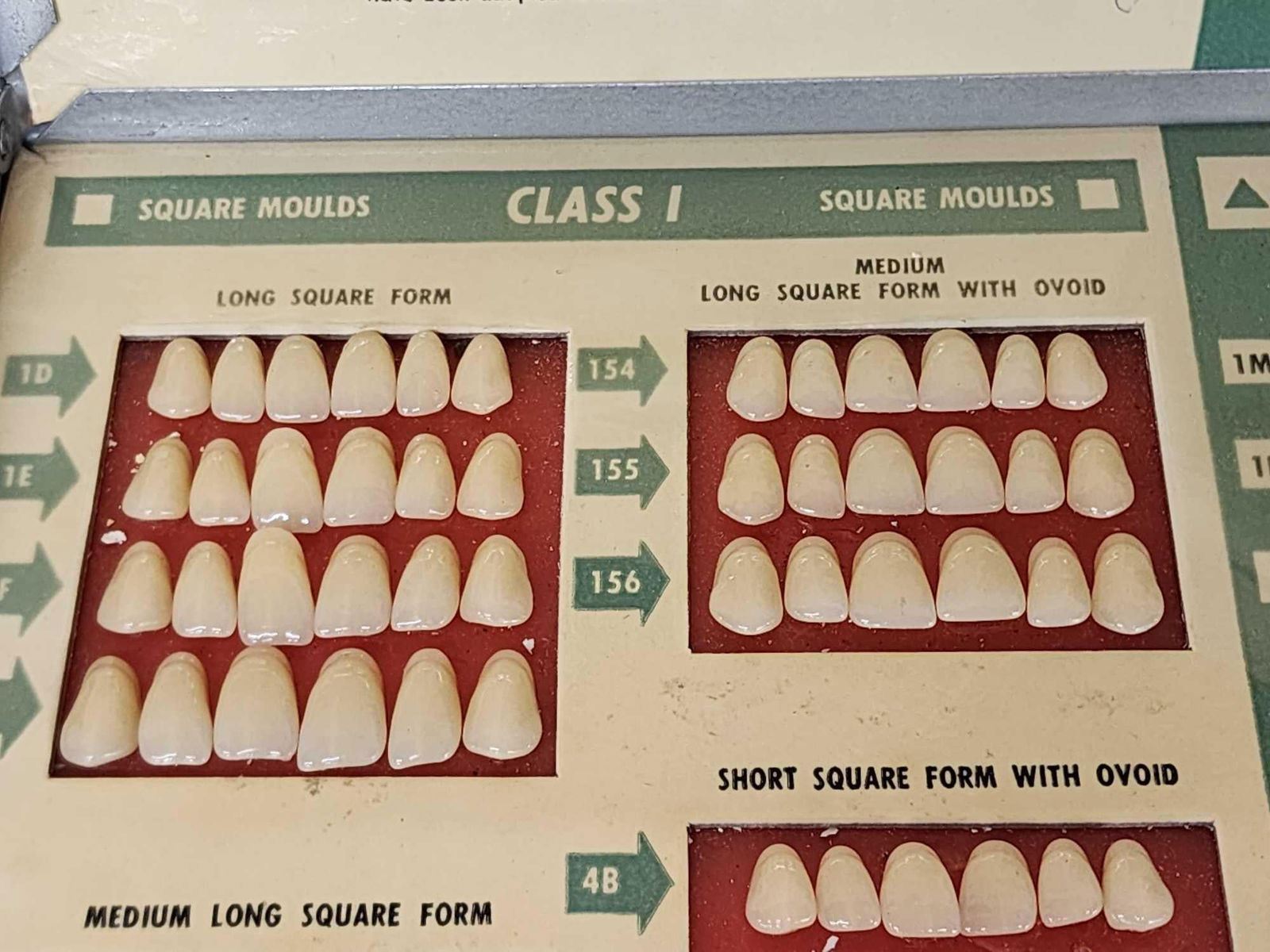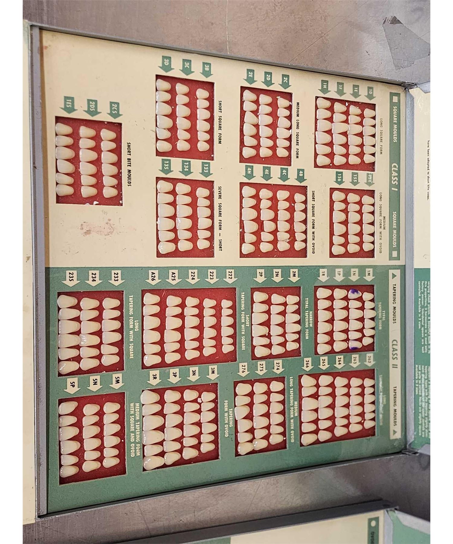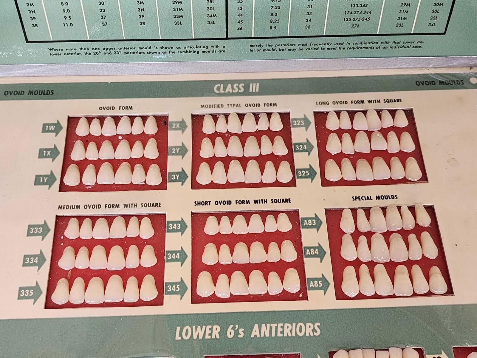 13.71 Great piece of dental history this display would have been used to show a dental patient what their new teeth would look like .Likely late 40s early 50s vintage Great condition with clear bright graphics. Includes a metal holding case , 3 display trays , a Dr. Meyerson's Mould Meter the tooth display appears to be missing only 2 teeth Great Oddities Curiosity piece