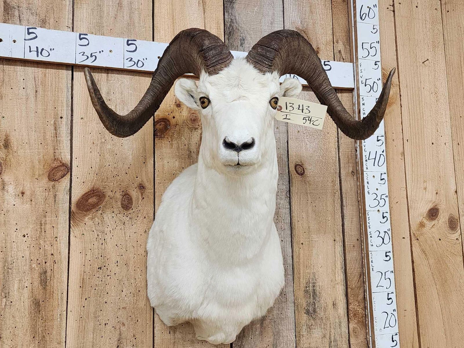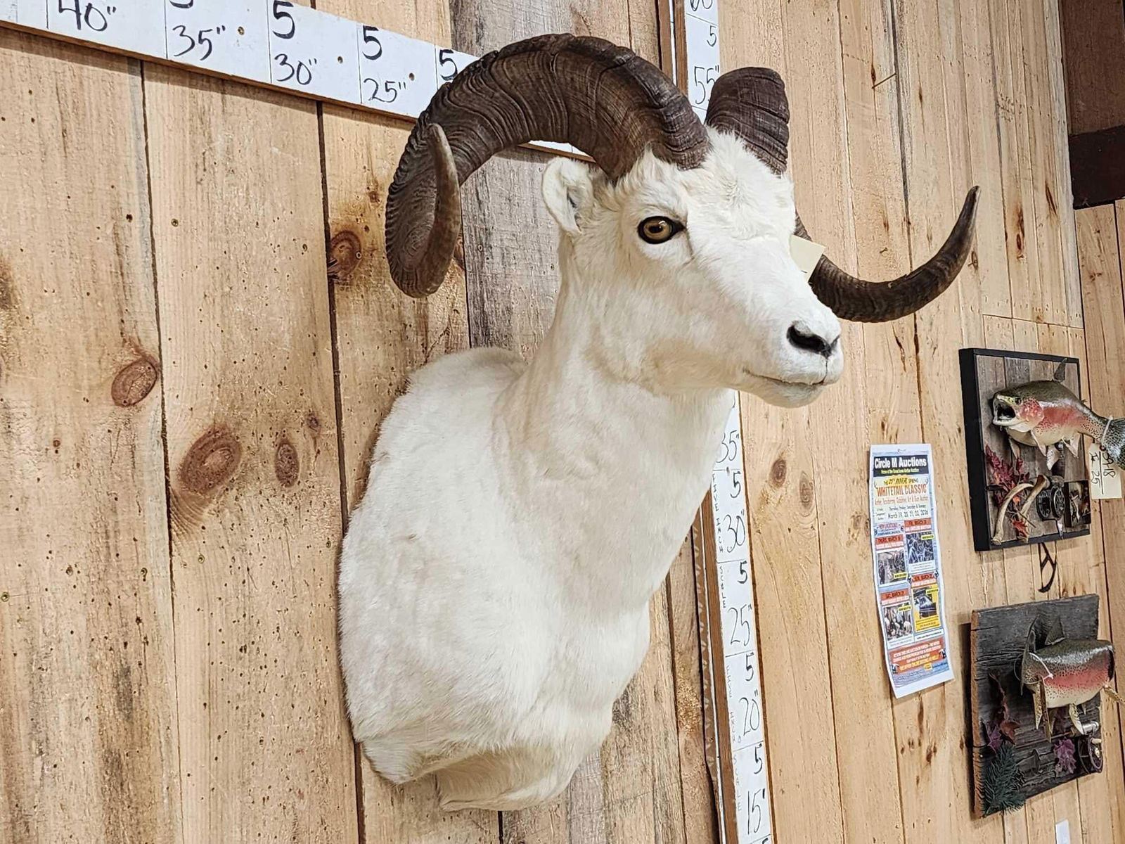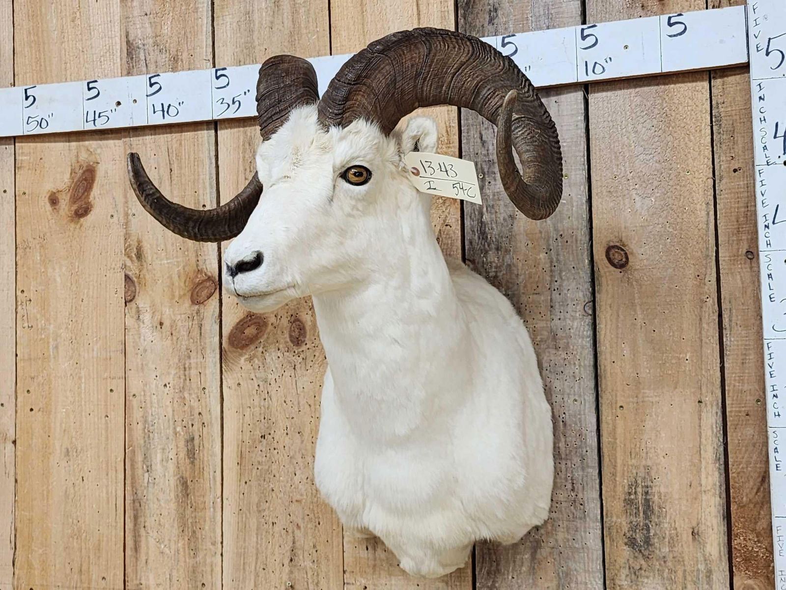 13.43 Pretty mount big full curl horns Right horn length about 34 4/8" with a 12 3/8" base Left 35" with a 12 2/8" base little to no shedding unlike most Dall Sheep