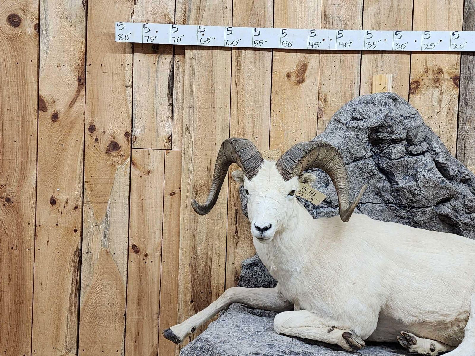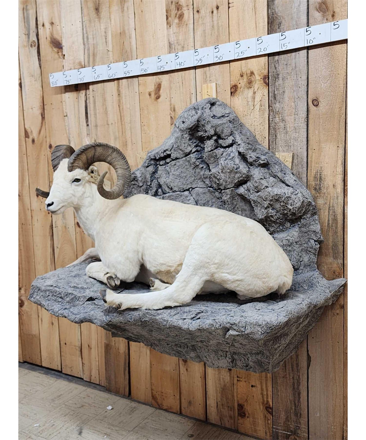 15.41 Awesome looking mount on light weight artificial rock cliff base big full curl horns Right horn length about 33 7/8" with a 13 2/8" base Left 36 5/8" with a 13 1/8" base little to no shedding unlike most Dall Sheep this piece is sure to make a huge statement in any room !