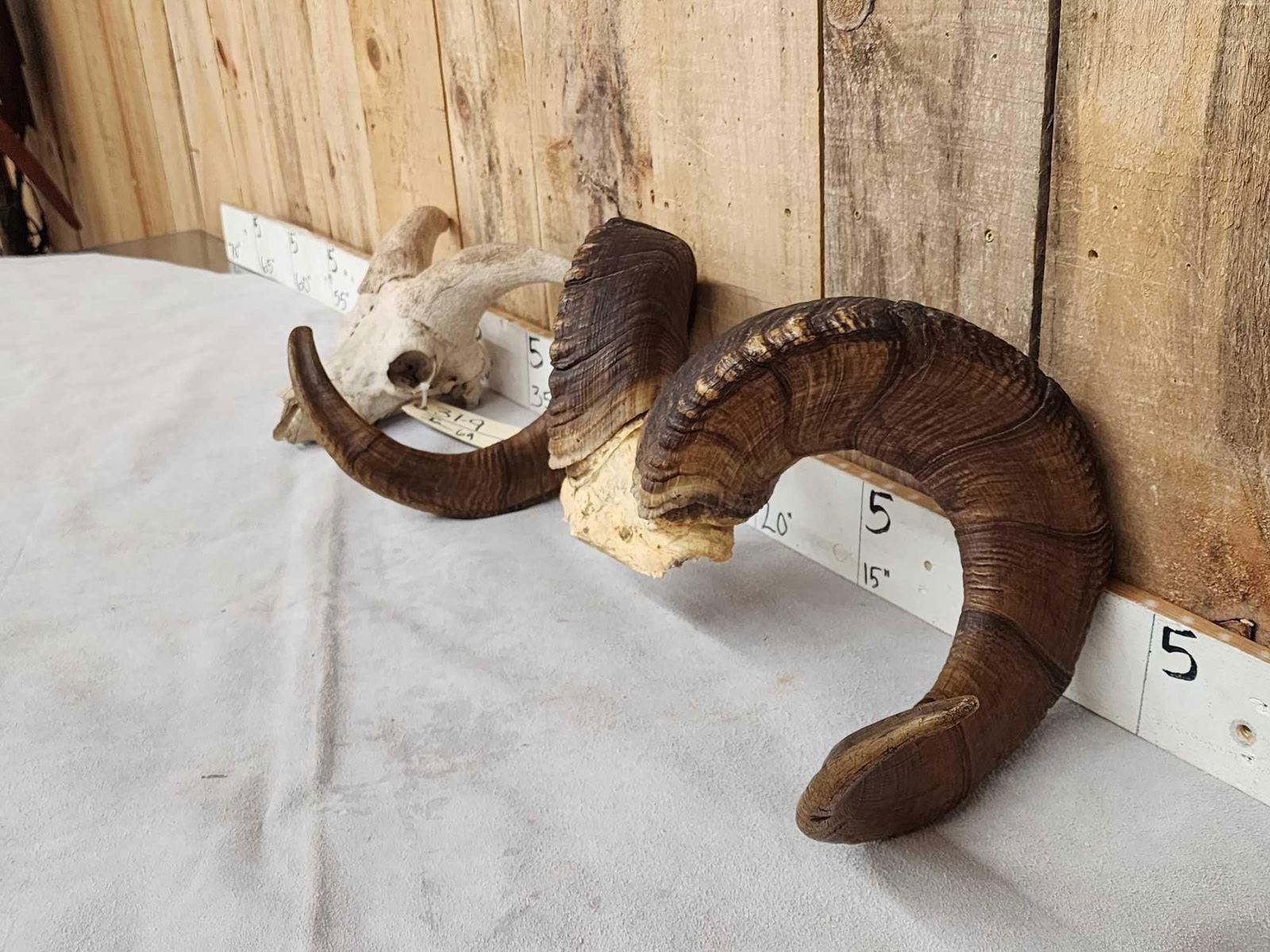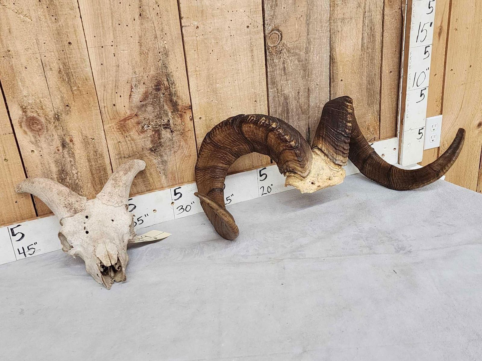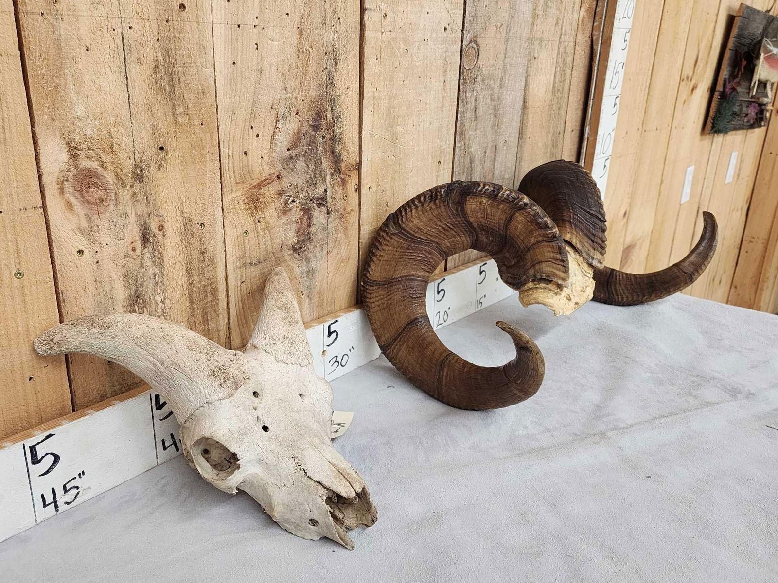 31.9 Excellent color big full curl horns Right horn length about 38 6/8" with a 12 4/8" base Left 39 4/8" with a 12 5/8" base comes with a bonus display Skull