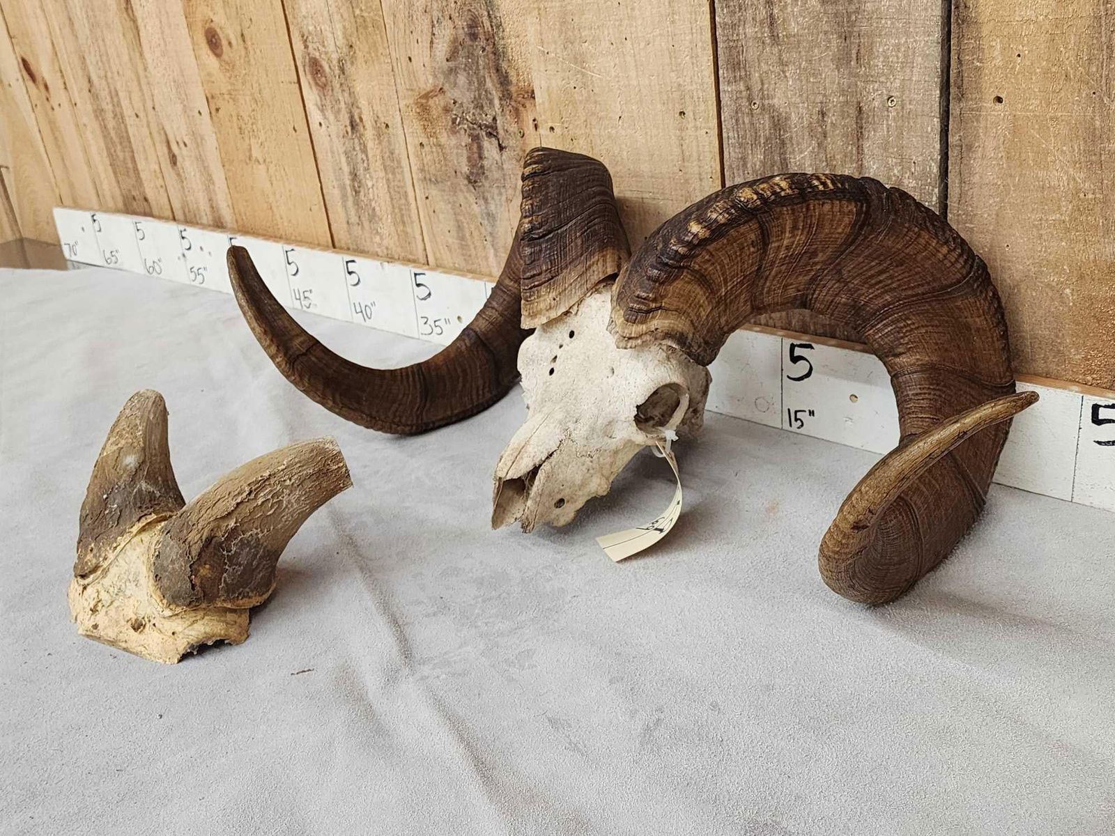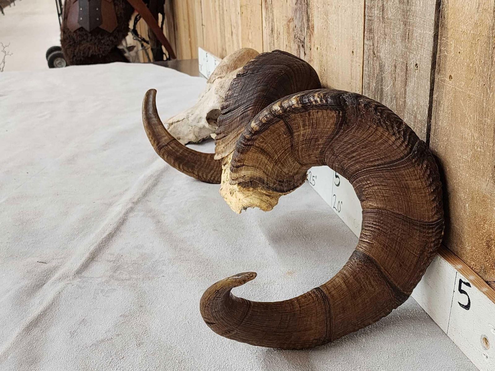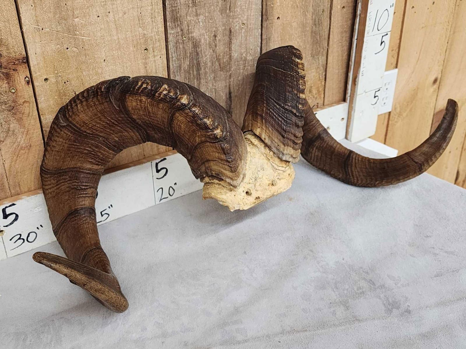 31.9 Excellent color big full curl horns Right horn length about 38 6/8" with a 12 4/8" base Left 39 4/8" with a 12 5/8" base comes with a bonus display Skull
