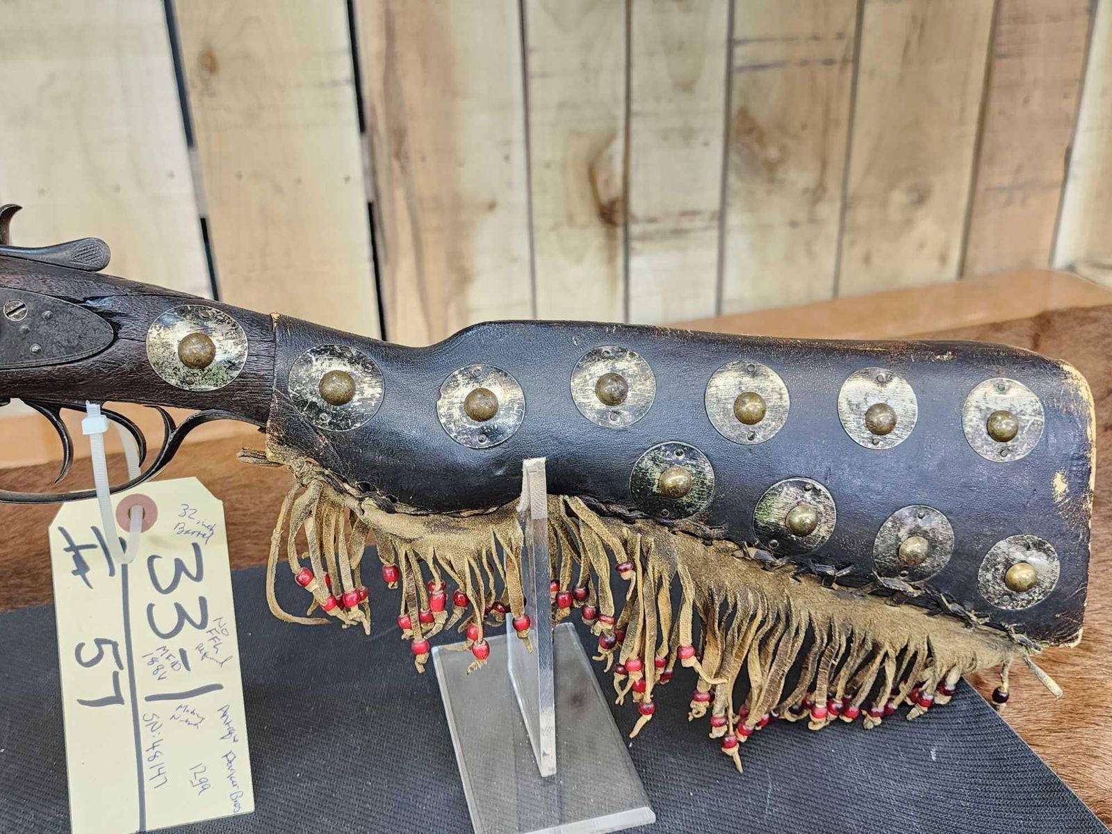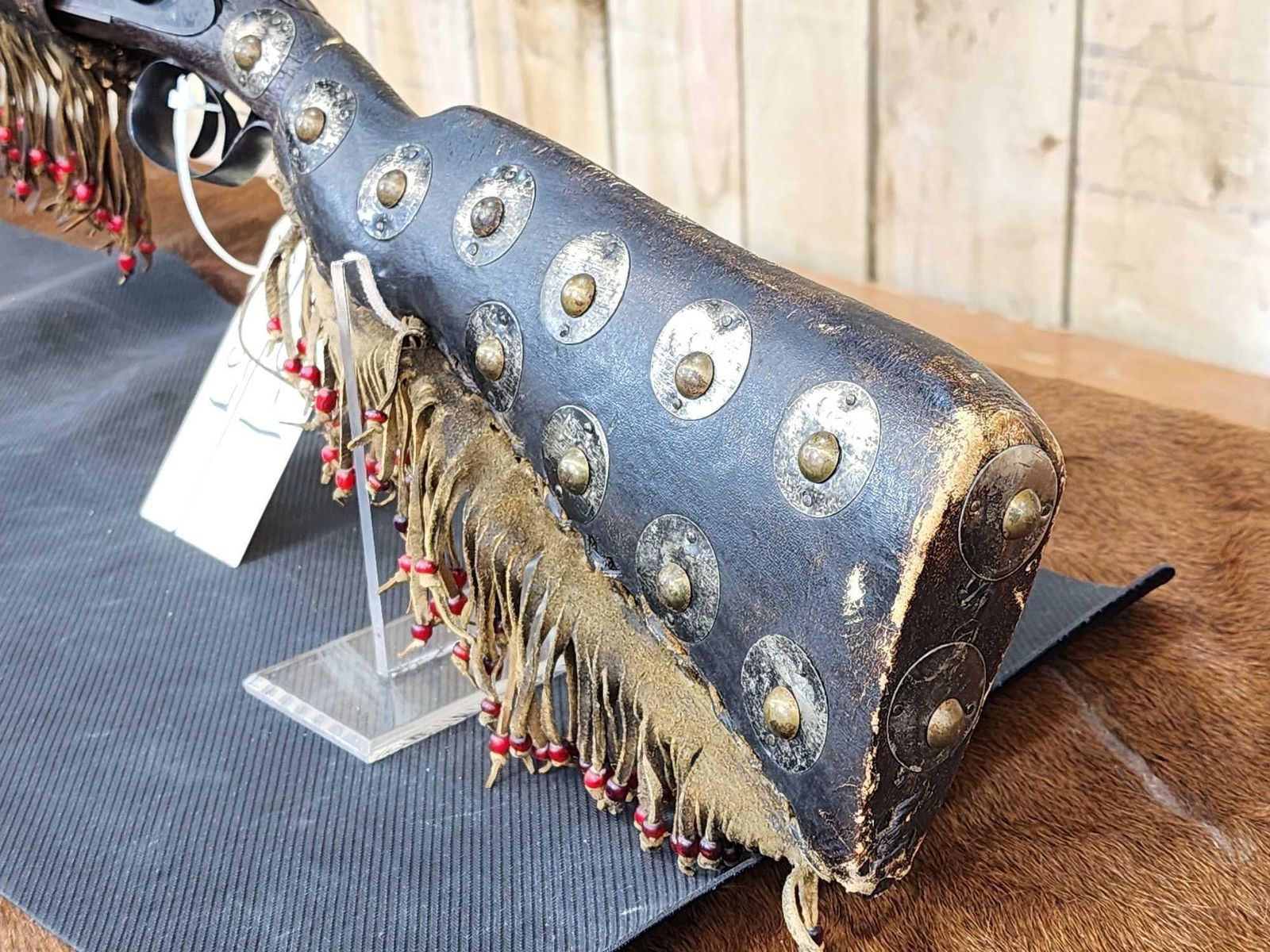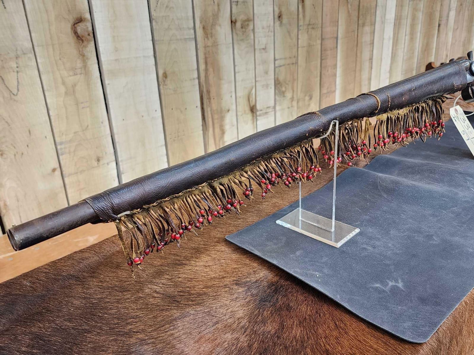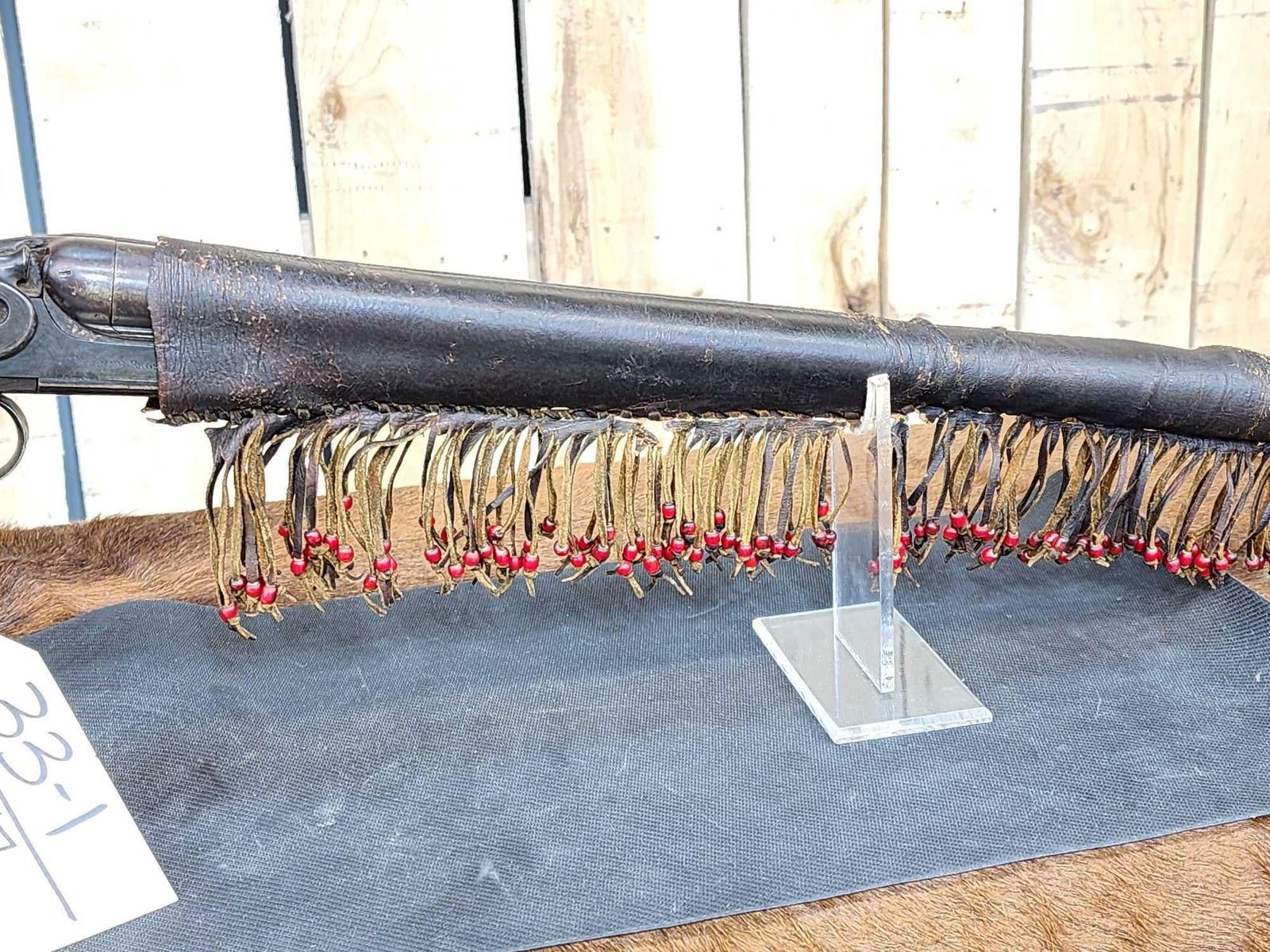 33.1 Mfg 1886 no FFL required Cool vintage piece with vintage leather decorations Spotted stock with fringes leather trade beads vintage leather barrel sleeve fringed with trade beads 32" twist steel barrel