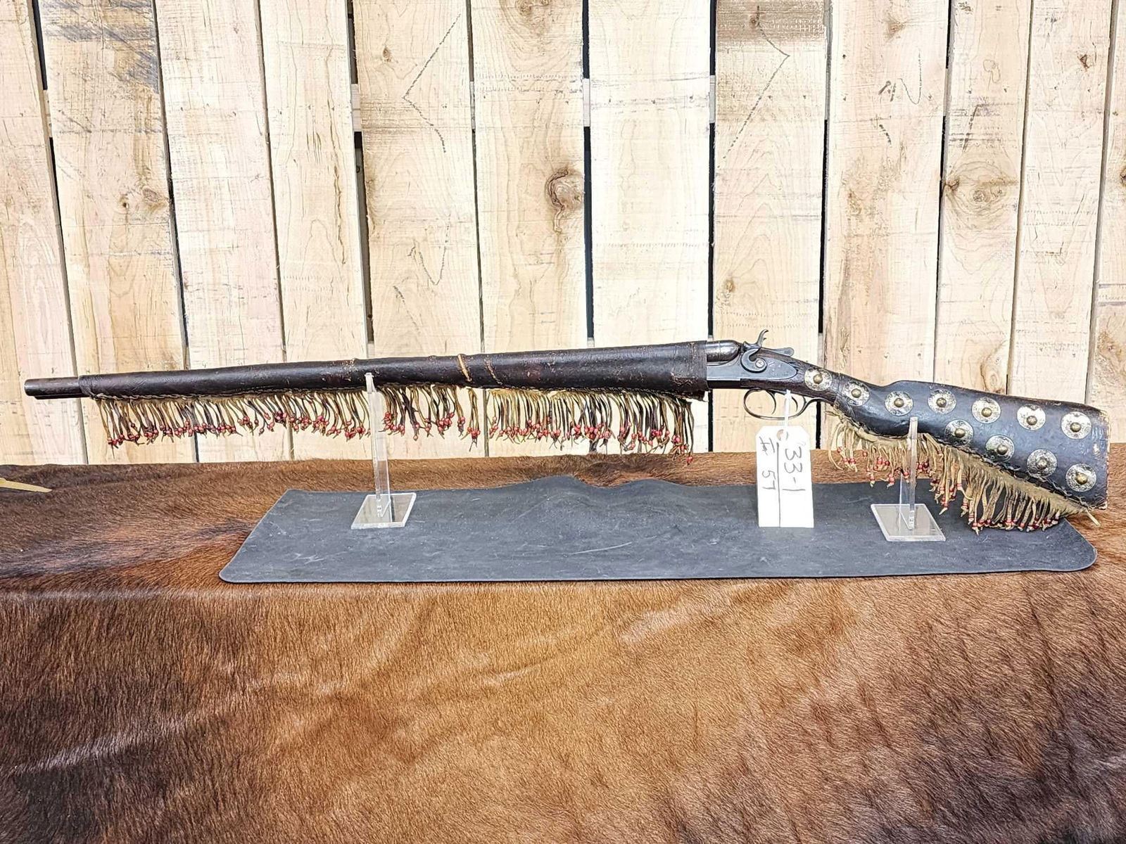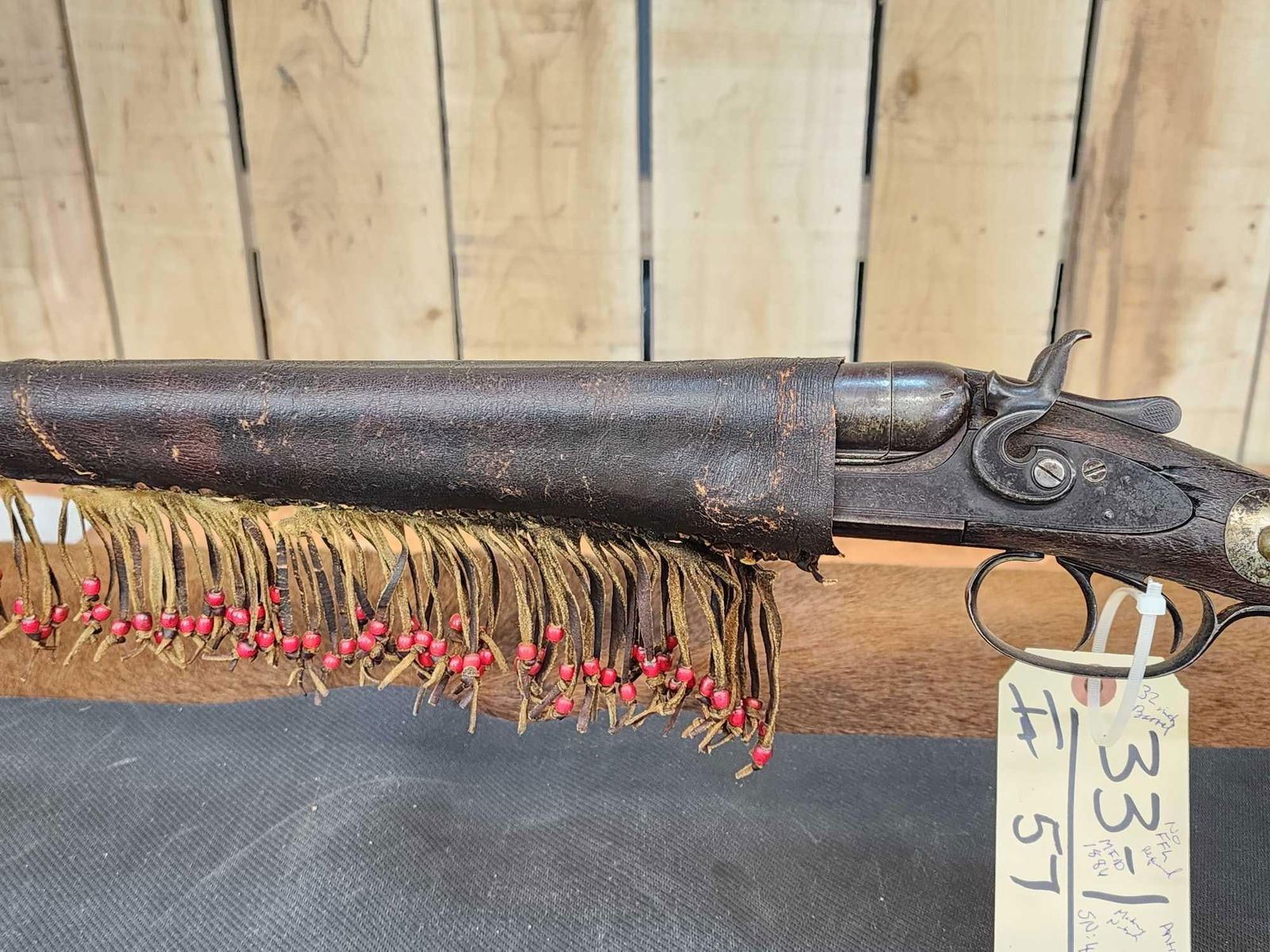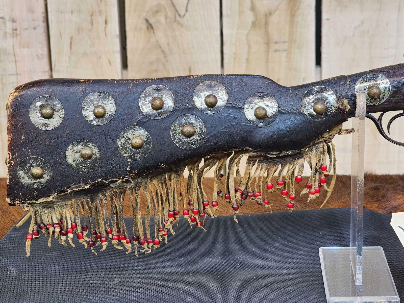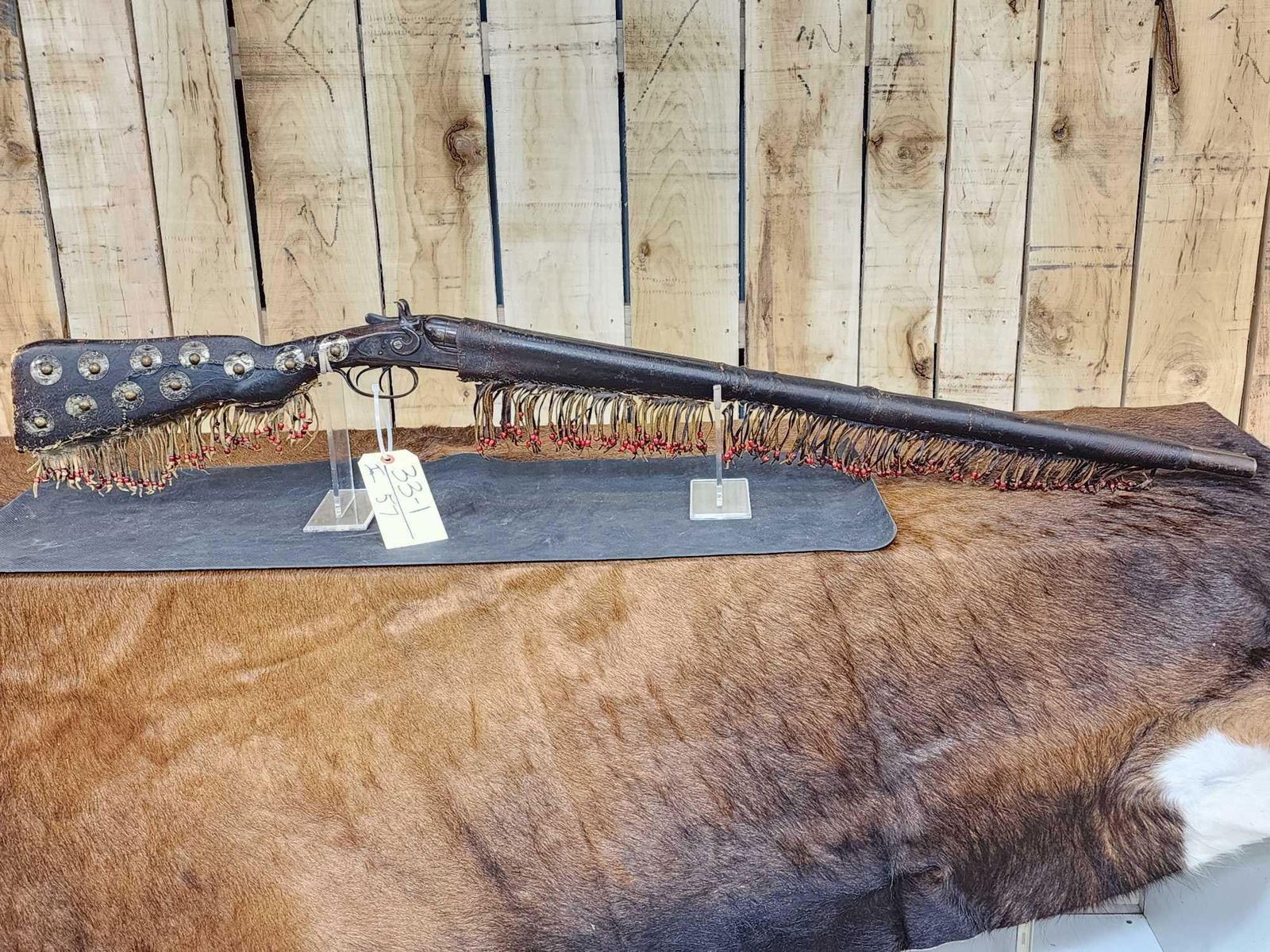 33.1 Mfg 1886 no FFL required Cool vintage piece with vintage leather decorations Spotted stock with fringes leather trade beads vintage leather barrel sleeve fringed with trade beads 32" twist steel barrel