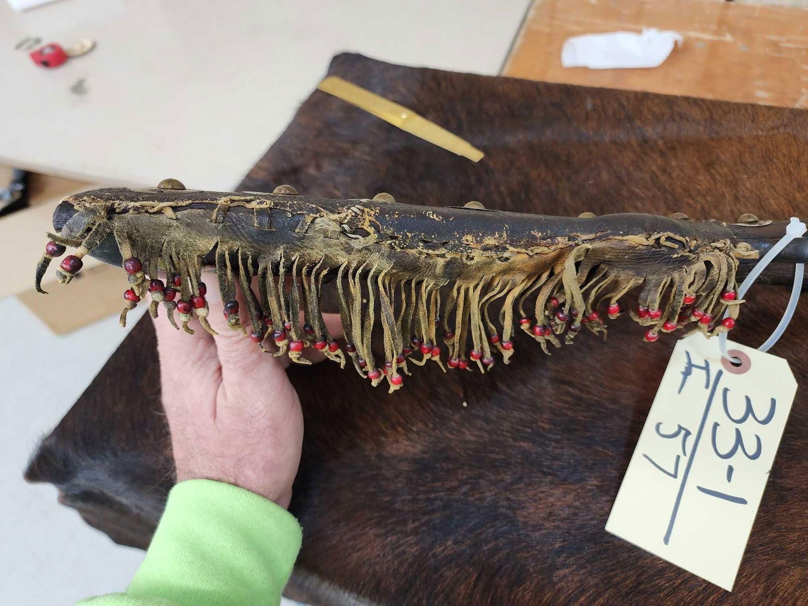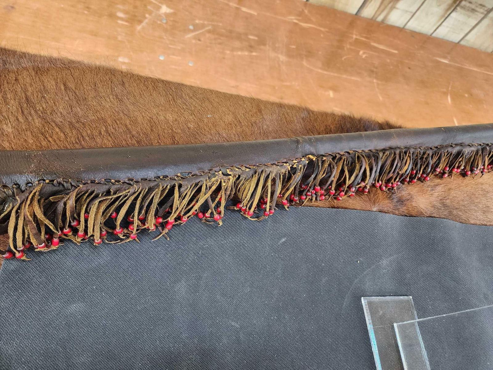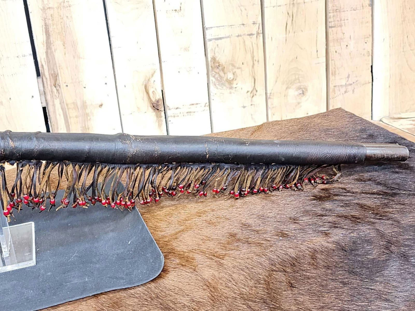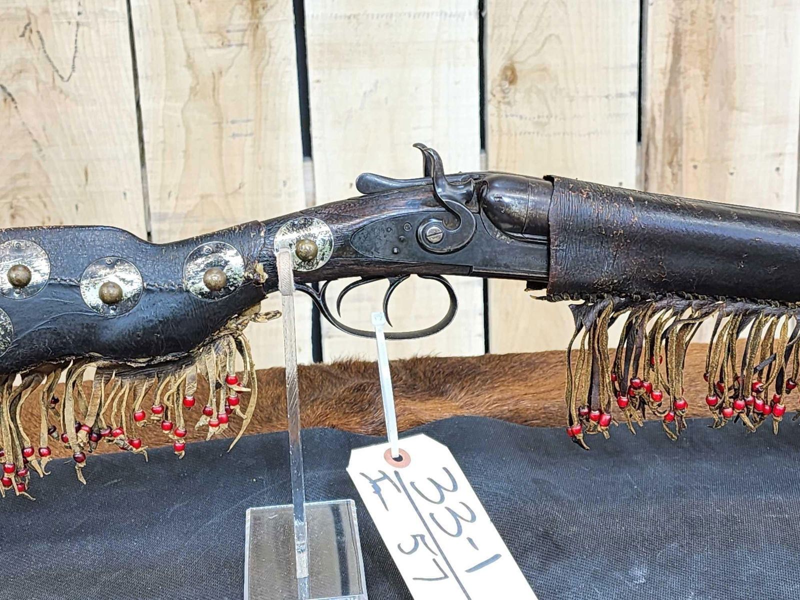 33.1 Mfg 1886 no FFL required Cool vintage piece with vintage leather decorations Spotted stock with fringes leather trade beads vintage leather barrel sleeve fringed with trade beads 32" twist steel barrel