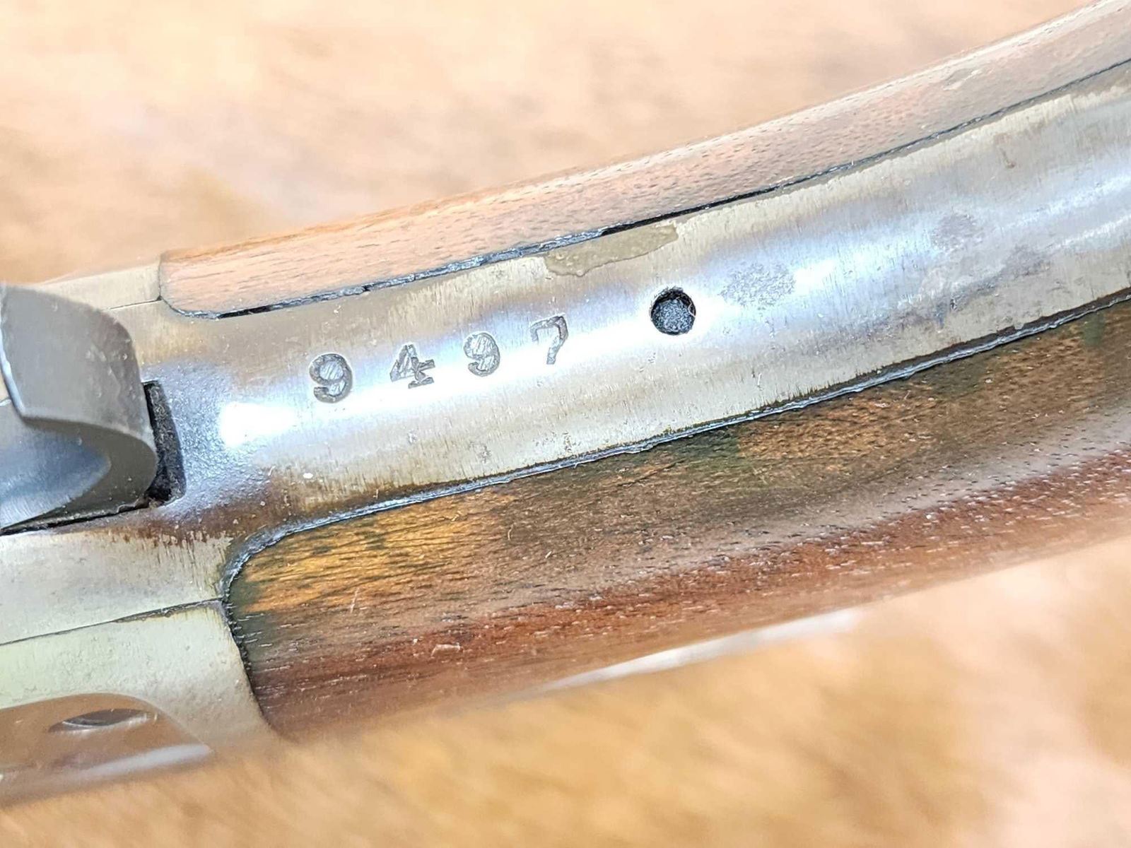 53.5 Action seems crisp 20" barrel Shiny bore good crisp rifling case hardening visible on lever Lyman #56 peep sight Mfg 1936 LOW 4 digit serial number 9497