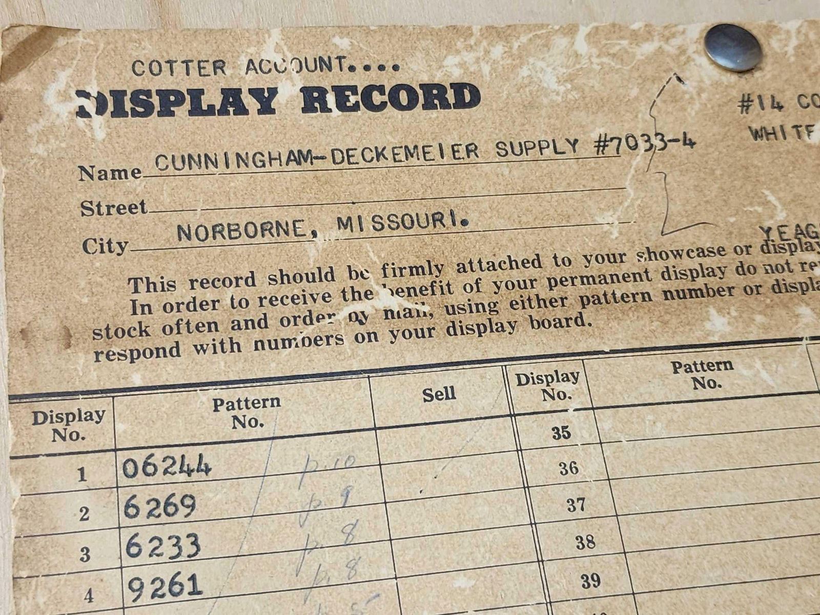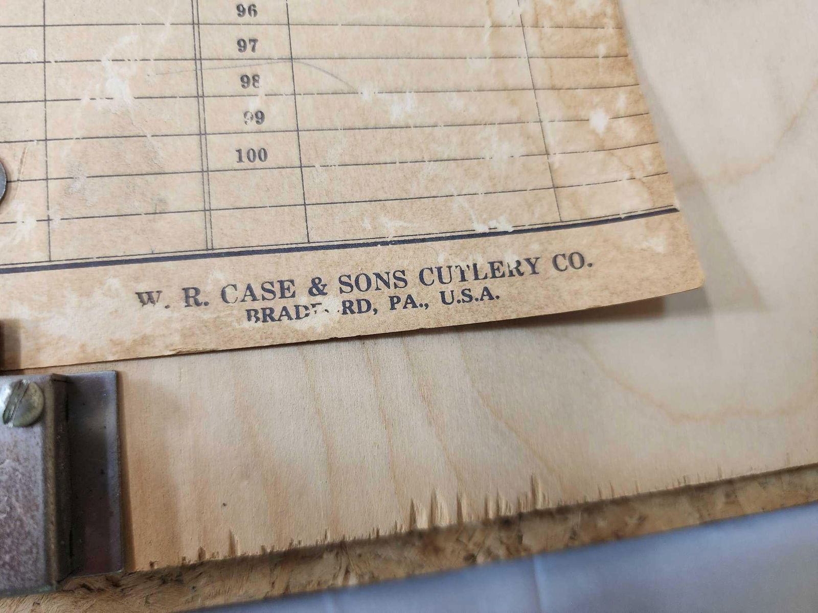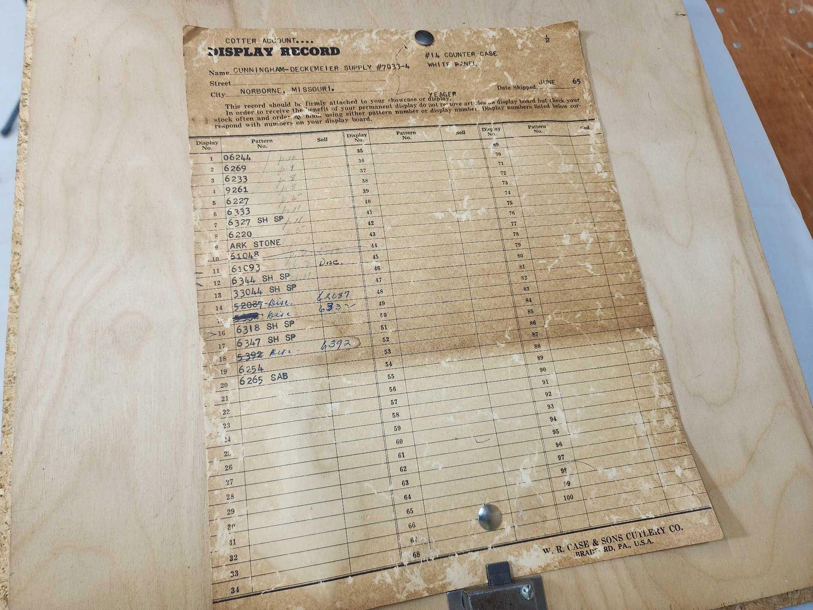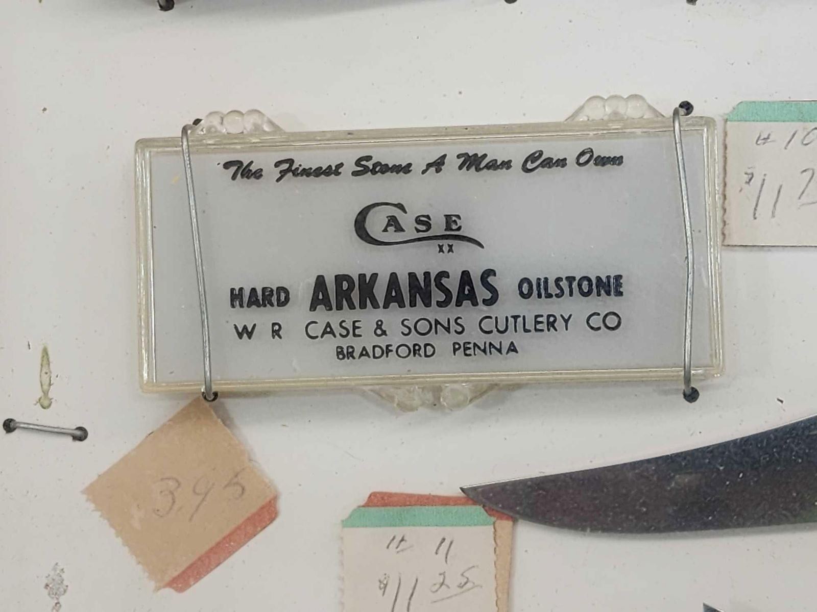 16.20 Awesome piece Includes 15 New Old Stock Case folding knives , Case sharpening stone bonus knife with damaged grips but new blades .With shipping receipt dated June 1965 shipped to Cunningham-Deckemeyer Supply Company ( said to be the longest continuous running hardware store west of the Mississippi)