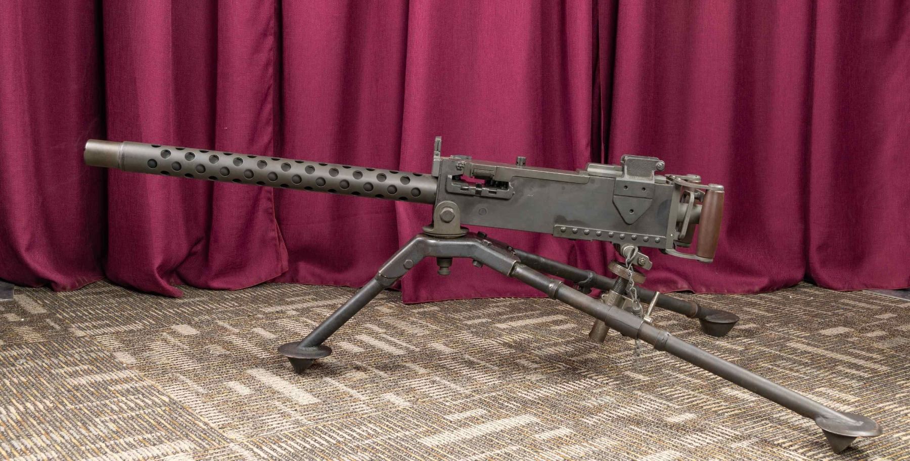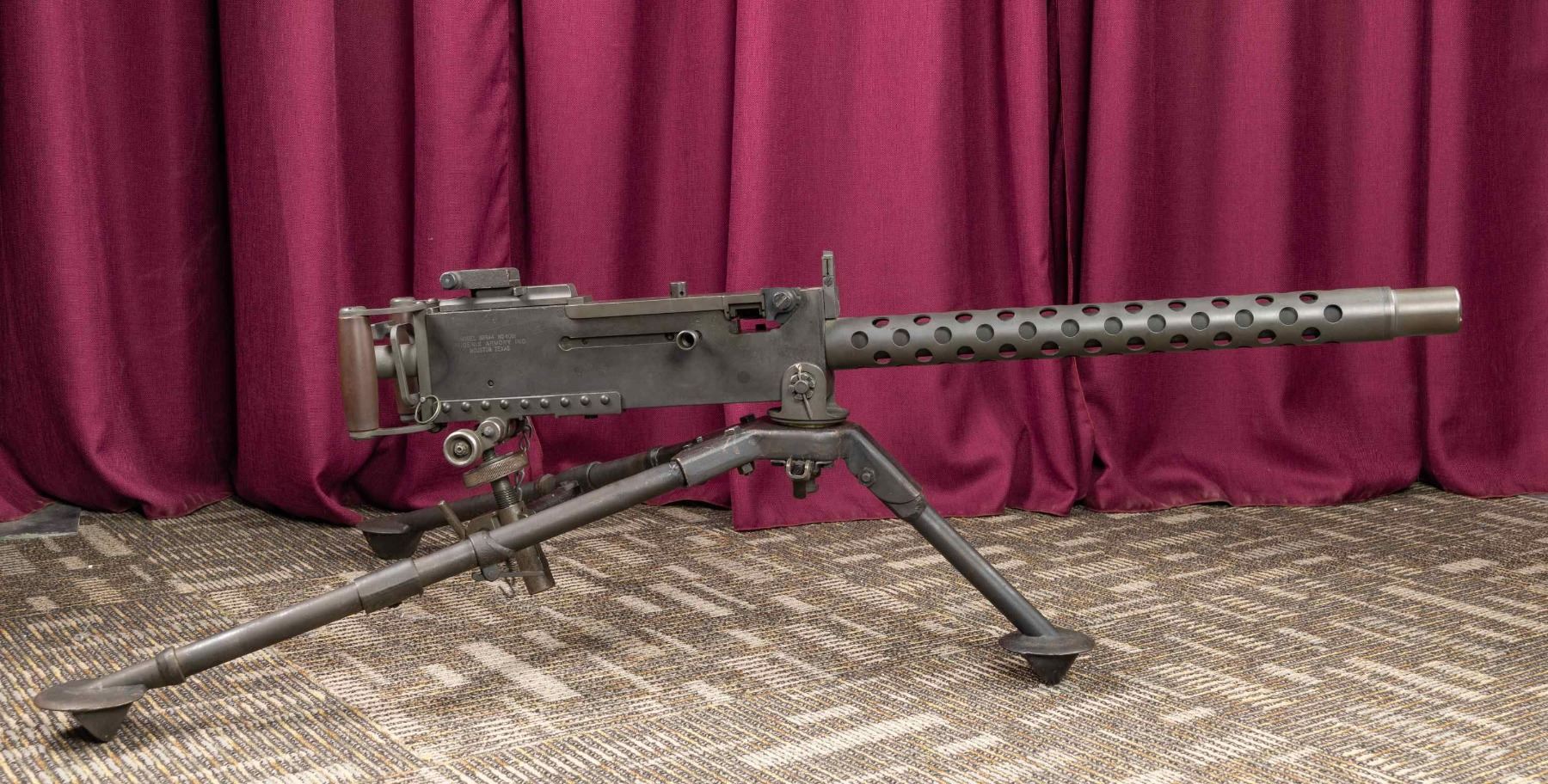 BROWNING MODEL1919 A4 MACHINE GUN WITH TRIPOD. S#8018. Cal 30-06. Bbl 26" The 1919 is one of the most iconic ground & vehicle mounted machine guns in U.S. Military history w/ such a long range of service, from the early 1920's through Vietnam, video footage as well as Hollywood films have featured this weapon system in countless reels. Originally it was intended to be the "go-to" Browning design tank gun in WWI, though it was introduced a little too late. It utilizes a heavier bbl. than its water cooled predecessor & traded the massive water jacket for a much slimmer slotted bbl. shroud for air cooling. The 1919A4 is one of the most commonly encountered & was originally issued in both a fixed & flexible platform. The fixed gun was often used on WW2 vehicles, while the flexible had a focus as an infantry company level machine gun. Shrouded flip up dove tailed blade front sight. Ladder adjustable rear sight graduated to 2400 yards. Assembled with USGI parts. Tripod marked "No.312802F.A.J./ Mount tripod/Cal 30.M2/ Lawson 45". CONDITION: very fine reparkerized metal finish. Very good grips. Tripod shows use with scattered handling marks and scratches and brown patina. Bright shiny bore with nice rifling. PROVENANCE: Military Museum Collection of Shooters Outpost, Hooksett NH. NATIONAL FIREARMS ACT MG REQUIRING BATF TRANSFER BEFORE TAKING POSSESSION. FULLY TRANSFERABLE. (03-2005/ZAL). MODERN. CLASS III. $20,000-25,000.