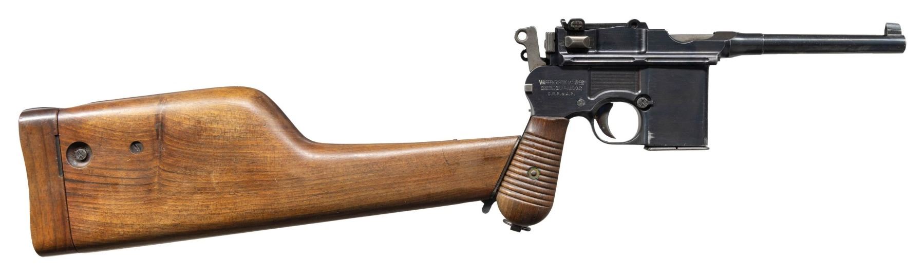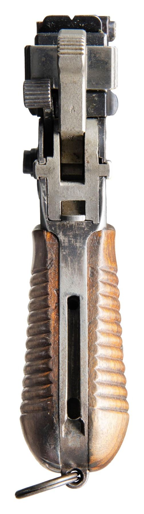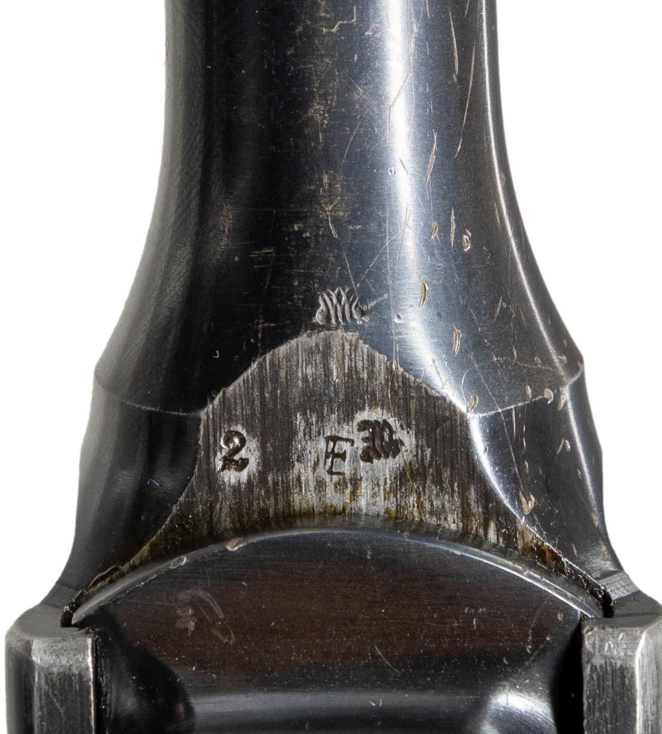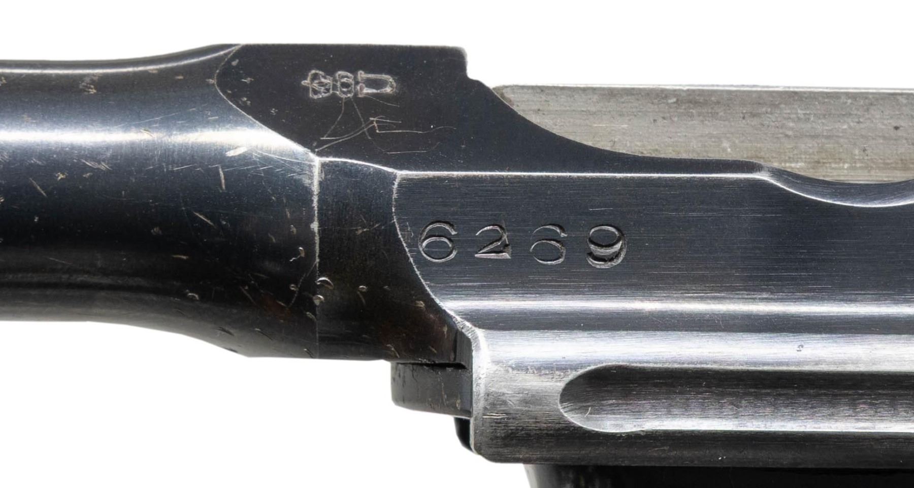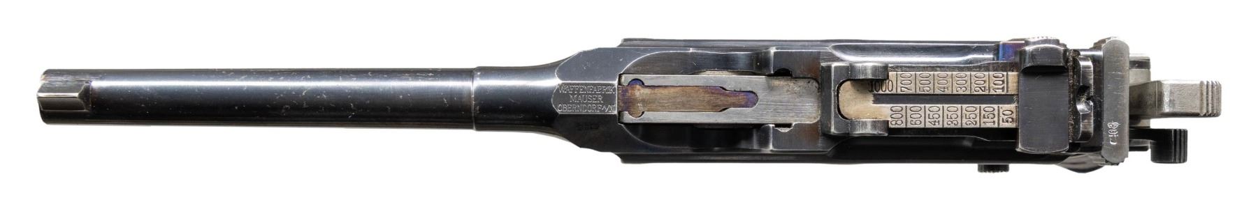 SCHNELLFEUER SELECT-FIRE MACHINE PISTOL WITH STOCK & SPARE MAGAZINE. Cal. 7.63mm (7.63x25mm Mauser). S# 6269. Bbl. 5 1/4". Circa 1930, Mauser, found it was losing traction in the highly competitive Chinese market from the Spanish firms Royal and Astra, whom were producing select-fire variations of their C96 style pistols. In turn, Mauser quickly pushed notable small arms designer Josef Nickl (an employee in Mauser's experimental department) to design a select-fire iteration of their iconic C96 pistol to remain competitive. Nickl's design, patented in 1930, was quickly produced and shipped to China, where problems with the select-fire mechanism were soon made apparent. By 1932, Karl Westinger (another of Mauser's experimental department employees) designed an improved select-fire lever variation, of which most collector's and historians are familiar with today. Approx. 95,000 total Mauser Schnellfeuer machine pistols were produced in total between the two variations between 1931-1936, largely attributing to their scarcity in the collector and enthusiast market. This example, a Westinger patent Model 1932 Schnellfeuer, is marked with Mauser's 3-line address across the top flat of the faceted breech, with a double crowned "U" proof marked on the left quarter flat (also present on the top of the bolt), and the S# marked on the left flat. Left side of the frame features Westinger's distinctive selector lever, with selector markings "N" and "R", followed by the Mauser banner logo, with "WAFFENFABRIK MAUSER/ OBERNDORF A. NECKAR/ D.R.P.u.A.P." marked on the right. Frame and bbl./bbl. extension exhibit a polished salt blue finish, with some small parts including the trigger, extractor, and bolt stop exhibiting a nitre blue finish. Extractor and bolt stop appear to have been partially reheated at one time, exhibiting areas of straw coloration. Bolt and top flat of the rear sight leaf are polished in-the-white. Sub-frame assembly exhibits a dull gray appearance. Frame is mounted with 2-piece grooved wood grips, featuring an integrally machined lanyard provision and a lanyard ring on the butt. Standard C96 pattern fixed blade front sight and tangent V-notch rear sight graduated 50-1000. All serialized parts are matching and include the bbl./bbl. extension as well as the frame (interior). UNATTACHED ACCESSORIES: proper unnumbered wood shoulder/stock, marked with the Mauser banner logo on one side. This example is also accompanied by a spare trigger return spring. MAGS: x1 blued steel 10-rd. and x1 blued steel 20-rd., both marked with the Mauser banner logo on the floorplate and both appearing to have been refinished at one time. CONDITION: metal components retain the majority of their original factory salt blue finish, exhibiting some light to mild edge wear, a patch and streak of wear on the underside of the bbl. (stock insertional and storage wear), some scattered small spots of light surface oxidation, as well some scattered superficial scratches and small handling marks that are predominately present on the forward edges of the mag. well and underside of the breech section of the bbl. Rear grip strap has largely faded to a gray patina, with scattered spots of light surface oxidation and pitting present on the front strap. Nitre blued parts show areas of wear at contact points, with strong nitre bluing remaining in protected areas. Polished in-the-white parts retain a bright appearance, showing some spots of age related discoloration. Bright bore, exhibiting scattered spots and small patches of mild to moderate pitting, while retaining well defined rifling throughout. Proper manual mechanics. Grips are very good, exhibiting some superficial handling marks and small impressions from handling and storage, with typical semi-circular impressions present on the butt from the lanyard ring. Stock shows scattered superficial marks and minor impressions from handling and storage, but otherwise remains sound. Metal hardware has mostly faded to a gray patina, exhibiting some spots of light surface oxidation and age related discoloration. An early, high condition, and attractive example of a desirable Mauser Model 1932 Schnellfeuer machine pistol. THIS IS A NATIONAL FIREARMS ACT CURIO & RELIC MACHINE GUN REQUIRING BATF TRANSFER BEFORE TAKING POSSESSION. (03-1934/MLW). CURIO CLASS III. $10,000-15,000.