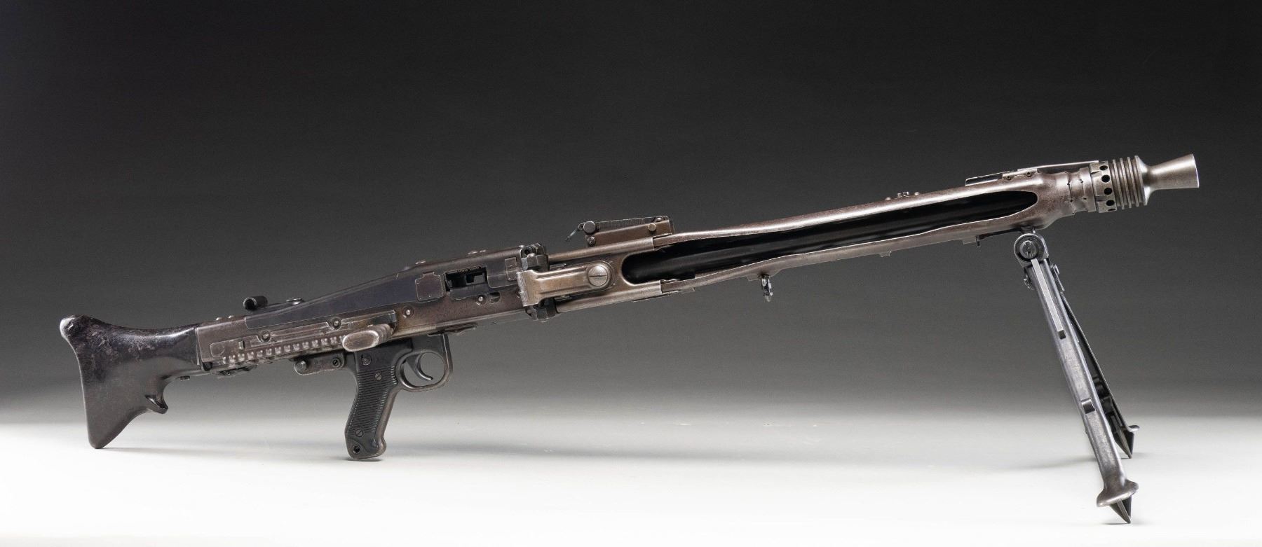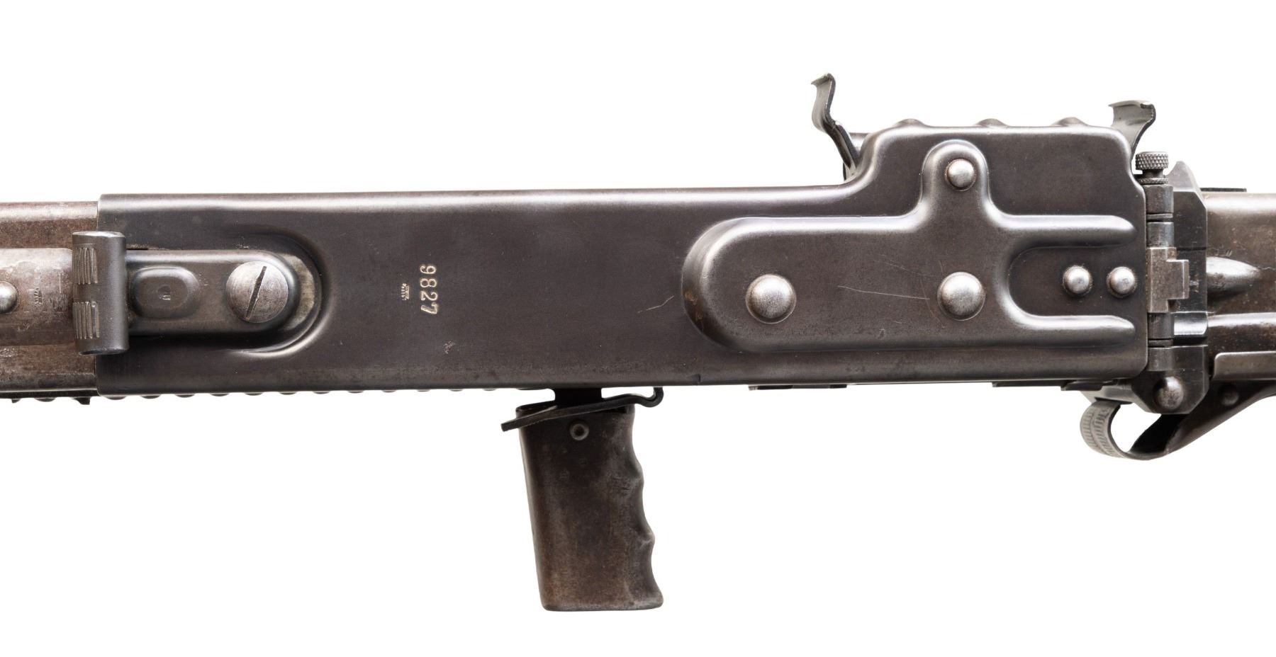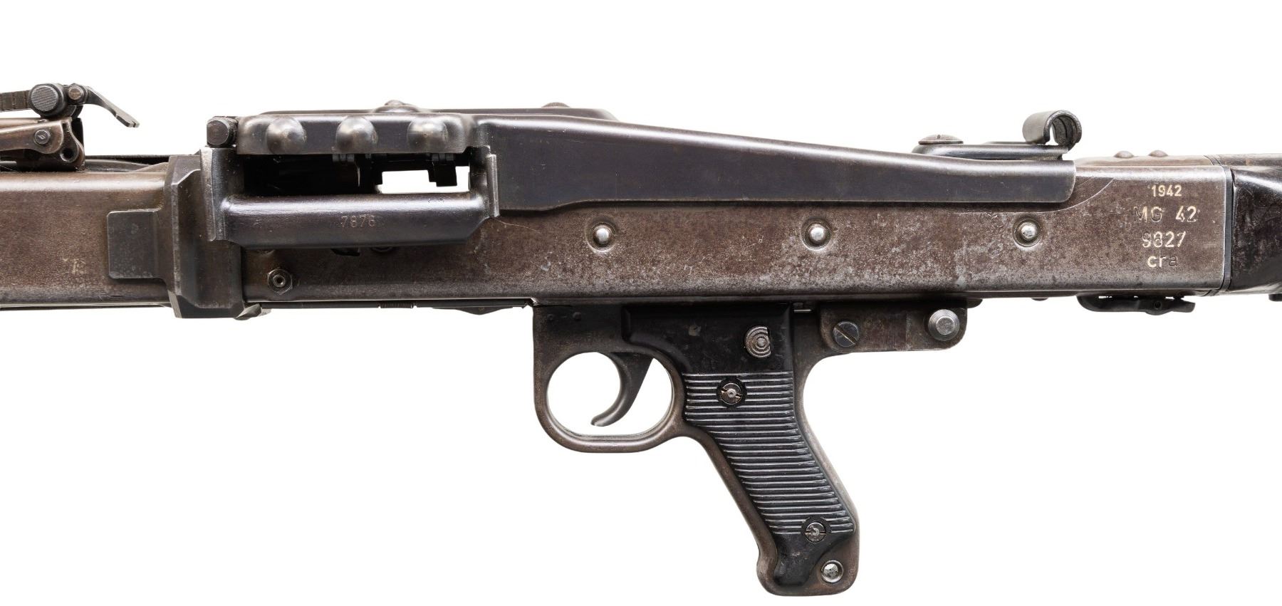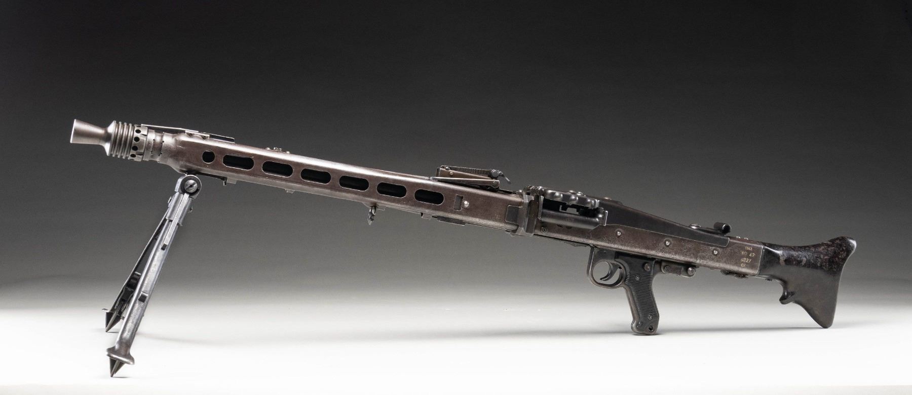 GUN WITH SLAB SIDE CHARGING HANDLE. Cal. 8mm (8mm Mauser). S# 9827. Bbl. 20". Early pattern sights with windage-adjustable front. Of all the WW2 German machine guns, none is more iconic and well-known than the German MG-42. Known as Hitler's buzz saw for its high rate of fire, the gun saw service throughout WW2 and beyond. This example is the earliest this cataloger has ever seen, and amazingly, it retains an original slab sided cocking handle & early matching numbered top cover. This slab side charging handle was nearly always retrofitted in favor of the later vertical style cocking handle. It was previously believed these early slab-side guns were used by the Afrika Korps, and thus surviving examples were bring-backs from that theater of war. This cataloger ran across a photo of the 6th Fallschirmjäger regiment using an early slab-side gun during the Normandy campaign, so the early style guns were undoubtedly used throughout the war, albeit in very limited numbers. There are four total known slab-side guns to this cataloger, and this is the only 1942 gun known to him that didn't get updated. This is a great opportunity for the advanced German or machine gun collector to acquire such a rare piece that is likely a "Holy Grail." Registration paperwork lists mfr. as "Germany" & caliber as "8mm." The balance of the gun is matching, with an unnumbered bbl., mismatched feed tray, external part of booster and bolt, likely replaced during years of hard service in WW2. A few parts appear to be period-renumbered to match by a German armorer, such as the trigger group. Of note, the charging handle, top cover, flash hider, and part of the booster are matching. Left side of the receiver has "cra" code for Maget with some old white highlight making the markings stand out. The gun is equipped with an early pattern MG34/42 bipod with locking legs that clip on the bbl. jacket. German Bakelite buttstock marked "mag" These stocks are very hard to find, as most didn't stand up to combat usage and were often replaced with wooden stocks. CONDITION: metal retains 60% original finish, with the receiver being a dull brown patina from honest use. Internals show strong original blue. Stock shows the expected dings and handling marks from a combat-issued piece. Action functions properly when hand-cycled. Very good plus bright bore with strong rifling. NATIONAL FIREARMS ACT MG REQUIRING BATF TRANSFER BEFORE TAKING POSSESSION. FULLY TRANSFERABLE. (03-2009/MJC). CURIO, CLASS III. $80,000-110,000.