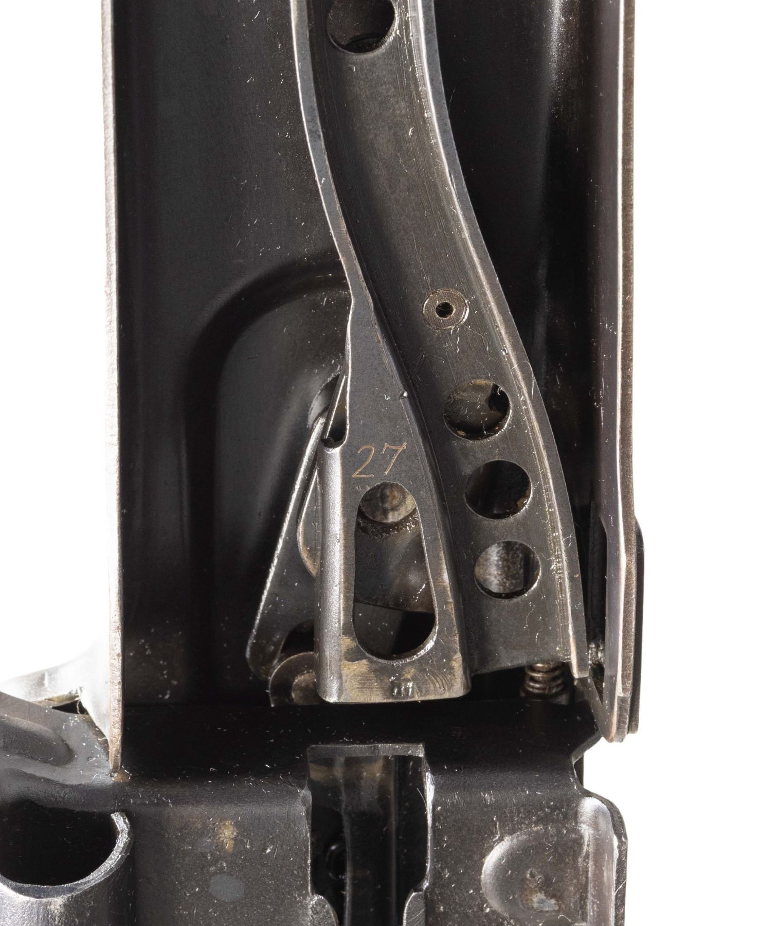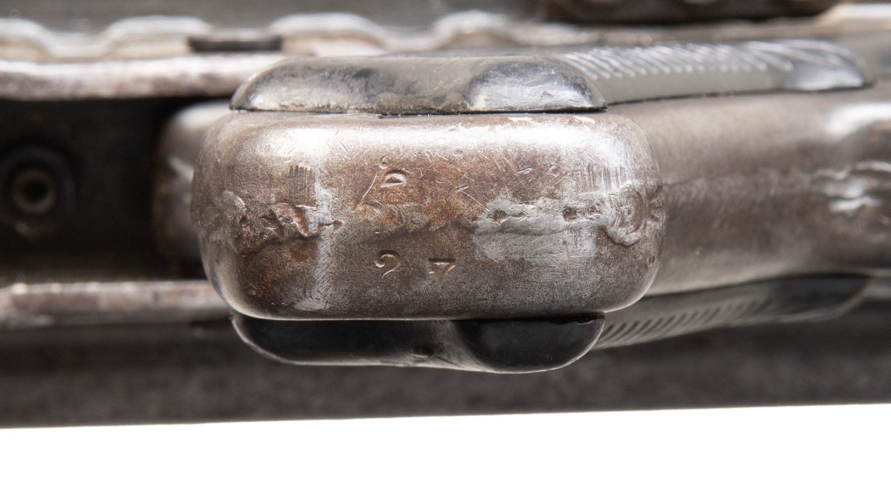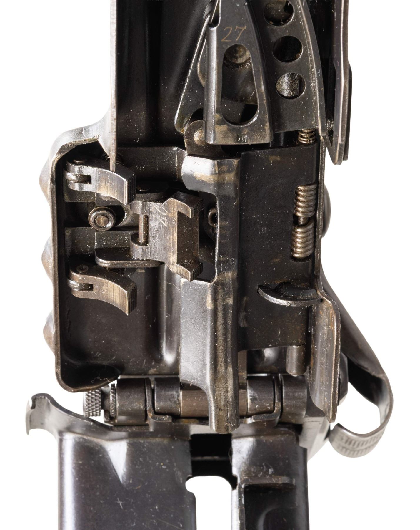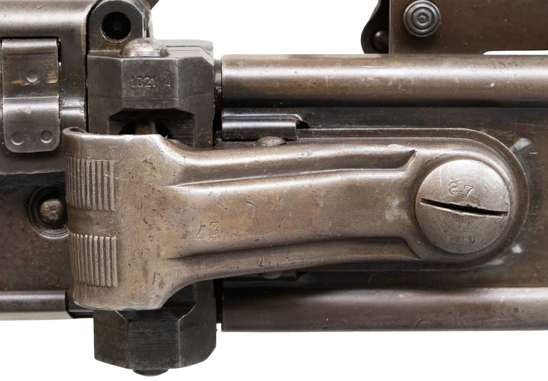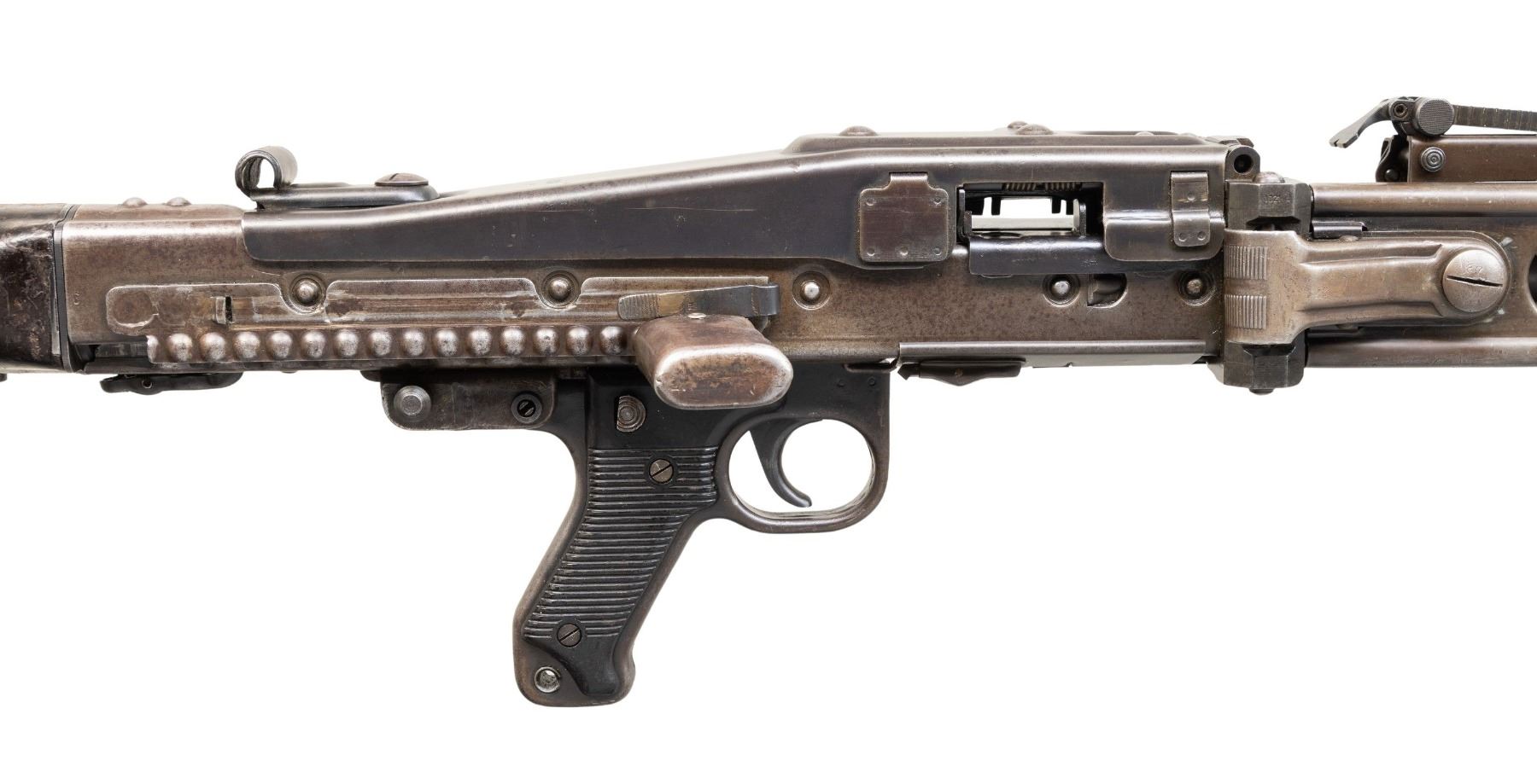 GUN WITH SLAB SIDE CHARGING HANDLE. Cal. 8mm (8mm Mauser). S# 9827. Bbl. 20". Early pattern sights with windage-adjustable front. Of all the WW2 German machine guns, none is more iconic and well-known than the German MG-42. Known as Hitler's buzz saw for its high rate of fire, the gun saw service throughout WW2 and beyond. This example is the earliest this cataloger has ever seen, and amazingly, it retains an original slab sided cocking handle & early matching numbered top cover. This slab side charging handle was nearly always retrofitted in favor of the later vertical style cocking handle. It was previously believed these early slab-side guns were used by the Afrika Korps, and thus surviving examples were bring-backs from that theater of war. This cataloger ran across a photo of the 6th Fallschirmjäger regiment using an early slab-side gun during the Normandy campaign, so the early style guns were undoubtedly used throughout the war, albeit in very limited numbers. There are four total known slab-side guns to this cataloger, and this is the only 1942 gun known to him that didn't get updated. This is a great opportunity for the advanced German or machine gun collector to acquire such a rare piece that is likely a "Holy Grail." Registration paperwork lists mfr. as "Germany" & caliber as "8mm." The balance of the gun is matching, with an unnumbered bbl., mismatched feed tray, external part of booster and bolt, likely replaced during years of hard service in WW2. A few parts appear to be period-renumbered to match by a German armorer, such as the trigger group. Of note, the charging handle, top cover, flash hider, and part of the booster are matching. Left side of the receiver has "cra" code for Maget with some old white highlight making the markings stand out. The gun is equipped with an early pattern MG34/42 bipod with locking legs that clip on the bbl. jacket. German Bakelite buttstock marked "mag" These stocks are very hard to find, as most didn't stand up to combat usage and were often replaced with wooden stocks. CONDITION: metal retains 60% original finish, with the receiver being a dull brown patina from honest use. Internals show strong original blue. Stock shows the expected dings and handling marks from a combat-issued piece. Action functions properly when hand-cycled. Very good plus bright bore with strong rifling. NATIONAL FIREARMS ACT MG REQUIRING BATF TRANSFER BEFORE TAKING POSSESSION. FULLY TRANSFERABLE. (03-2009/MJC). CURIO, CLASS III. $80,000-110,000.