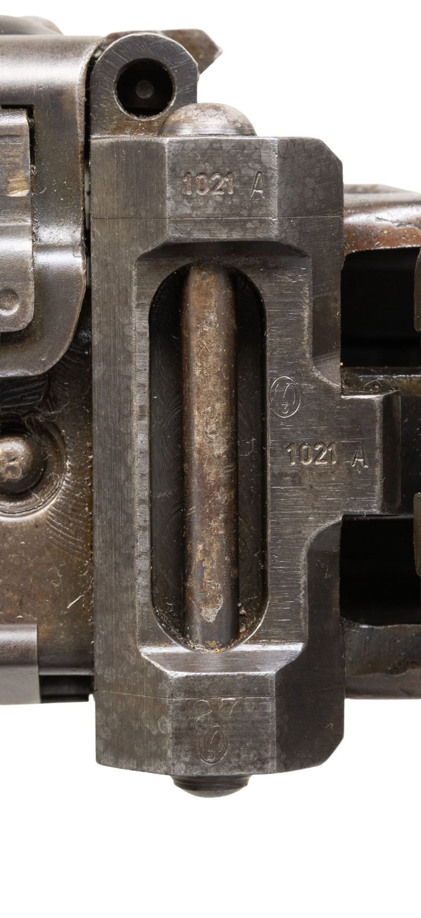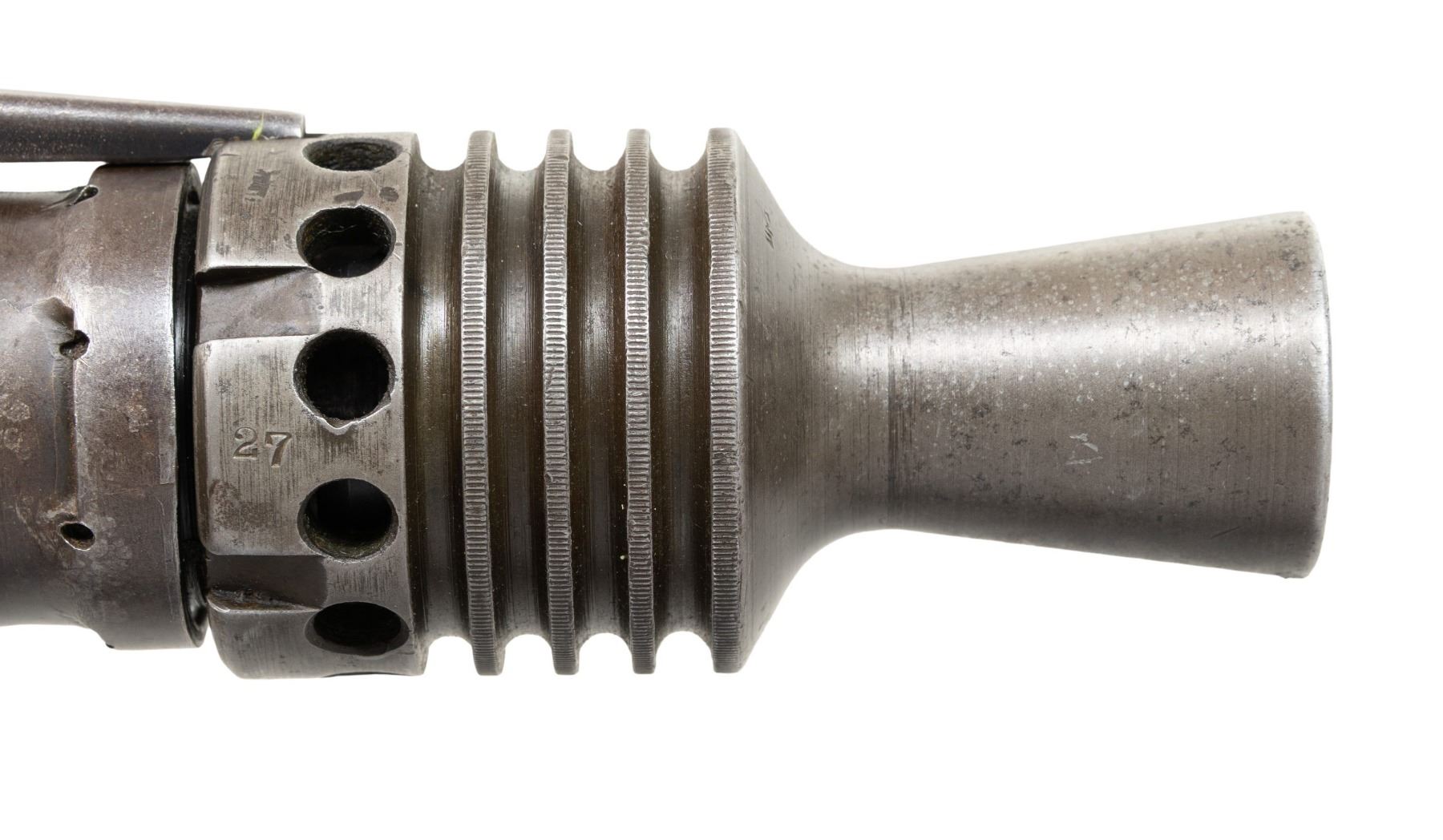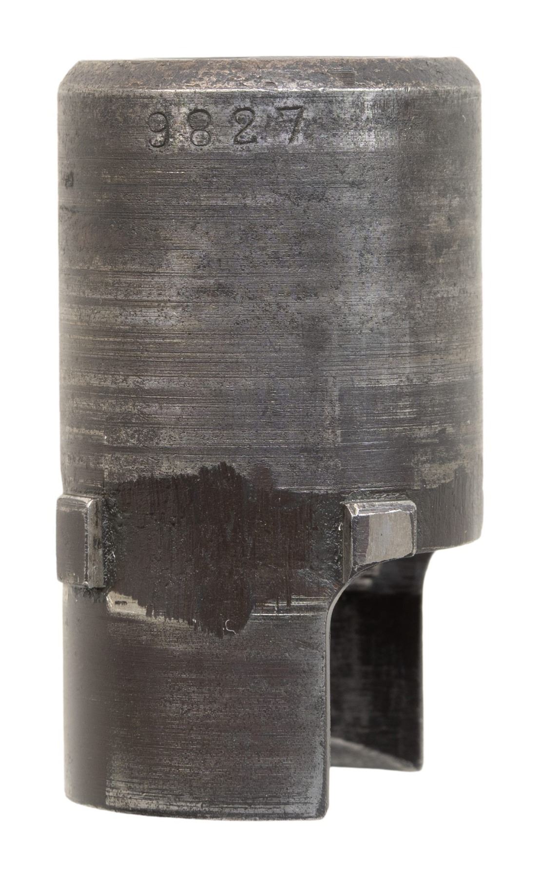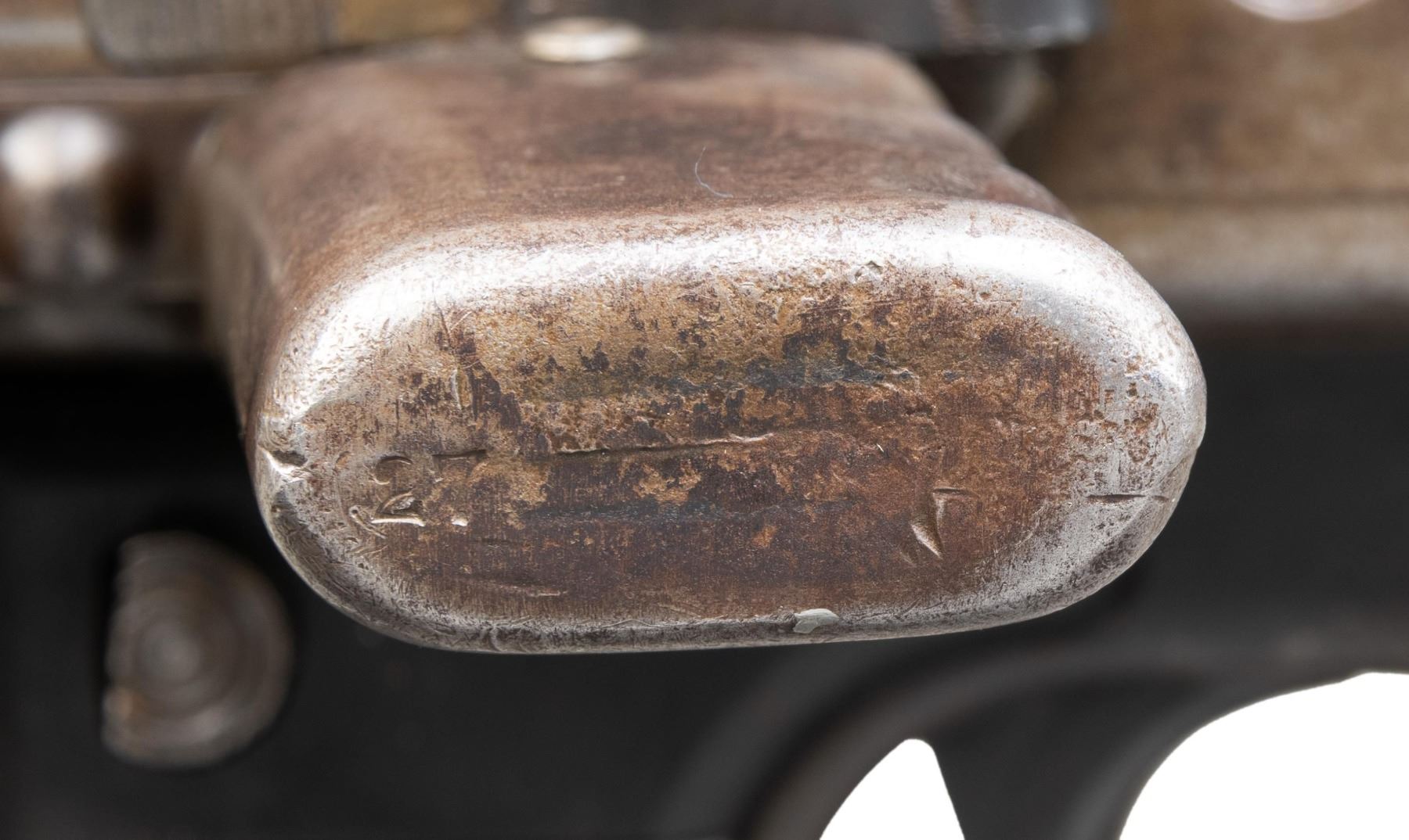 GUN WITH SLAB SIDE CHARGING HANDLE. Cal. 8mm (8mm Mauser). S# 9827. Bbl. 20". Early pattern sights with windage-adjustable front. Of all the WW2 German machine guns, none is more iconic and well-known than the German MG-42. Known as Hitler's buzz saw for its high rate of fire, the gun saw service throughout WW2 and beyond. This example is the earliest this cataloger has ever seen, and amazingly, it retains an original slab sided cocking handle & early matching numbered top cover. This slab side charging handle was nearly always retrofitted in favor of the later vertical style cocking handle. It was previously believed these early slab-side guns were used by the Afrika Korps, and thus surviving examples were bring-backs from that theater of war. This cataloger ran across a photo of the 6th Fallschirmjäger regiment using an early slab-side gun during the Normandy campaign, so the early style guns were undoubtedly used throughout the war, albeit in very limited numbers. There are four total known slab-side guns to this cataloger, and this is the only 1942 gun known to him that didn't get updated. This is a great opportunity for the advanced German or machine gun collector to acquire such a rare piece that is likely a "Holy Grail." Registration paperwork lists mfr. as "Germany" & caliber as "8mm." The balance of the gun is matching, with an unnumbered bbl., mismatched feed tray, external part of booster and bolt, likely replaced during years of hard service in WW2. A few parts appear to be period-renumbered to match by a German armorer, such as the trigger group. Of note, the charging handle, top cover, flash hider, and part of the booster are matching. Left side of the receiver has "cra" code for Maget with some old white highlight making the markings stand out. The gun is equipped with an early pattern MG34/42 bipod with locking legs that clip on the bbl. jacket. German Bakelite buttstock marked "mag" These stocks are very hard to find, as most didn't stand up to combat usage and were often replaced with wooden stocks. CONDITION: metal retains 60% original finish, with the receiver being a dull brown patina from honest use. Internals show strong original blue. Stock shows the expected dings and handling marks from a combat-issued piece. Action functions properly when hand-cycled. Very good plus bright bore with strong rifling. NATIONAL FIREARMS ACT MG REQUIRING BATF TRANSFER BEFORE TAKING POSSESSION. FULLY TRANSFERABLE. (03-2009/MJC). CURIO, CLASS III. $80,000-110,000.