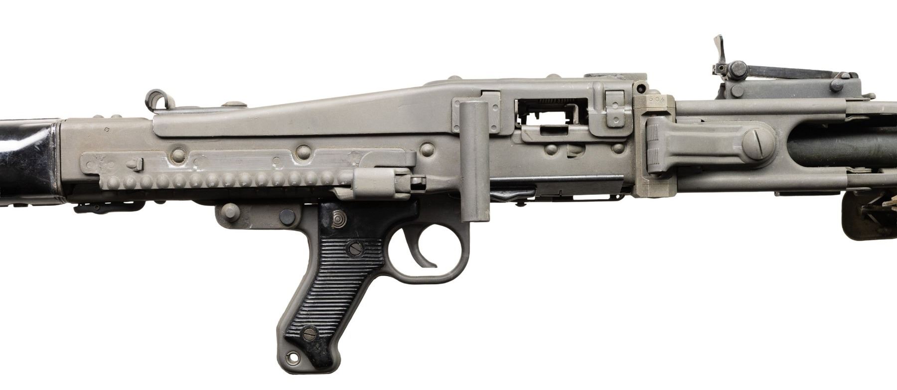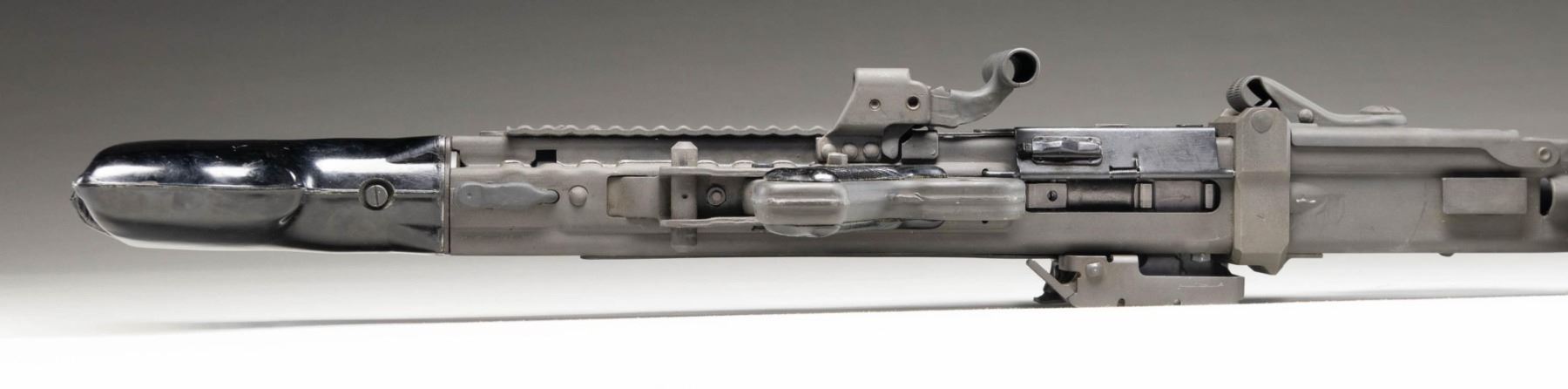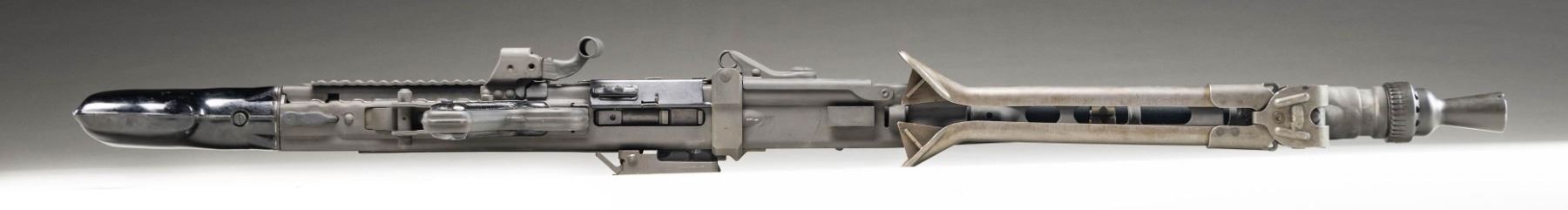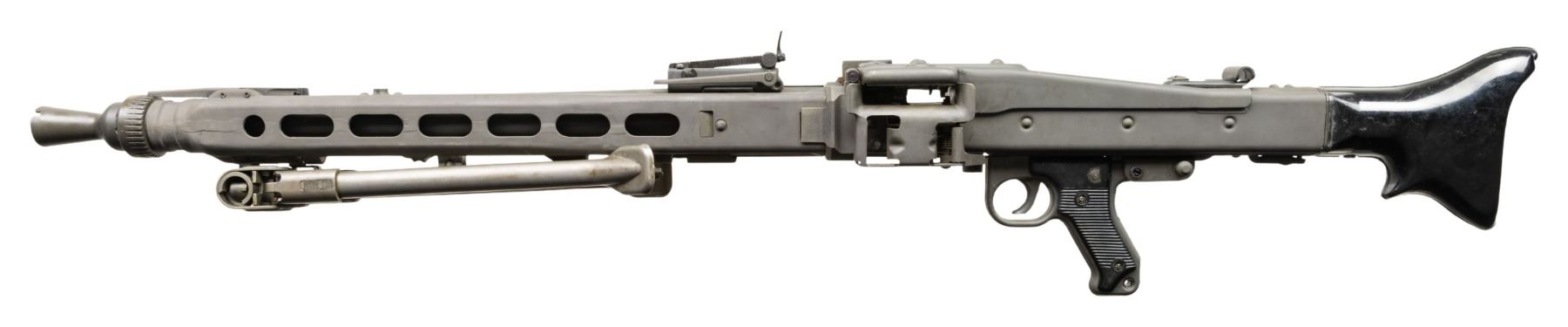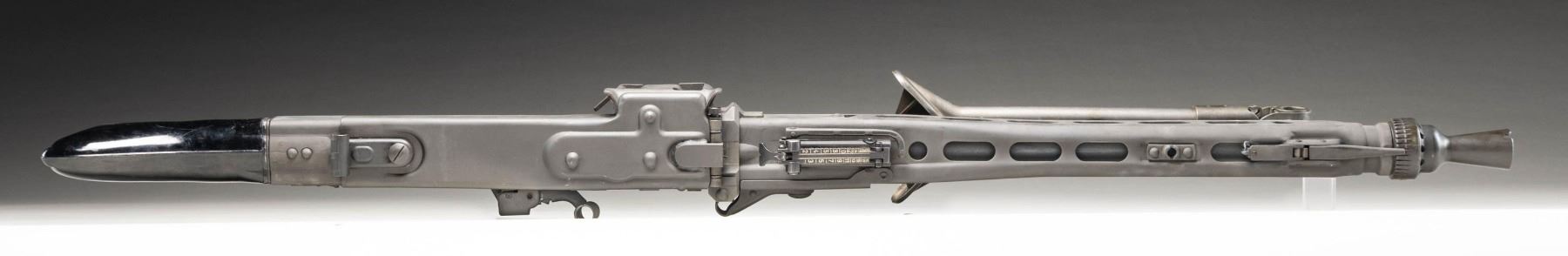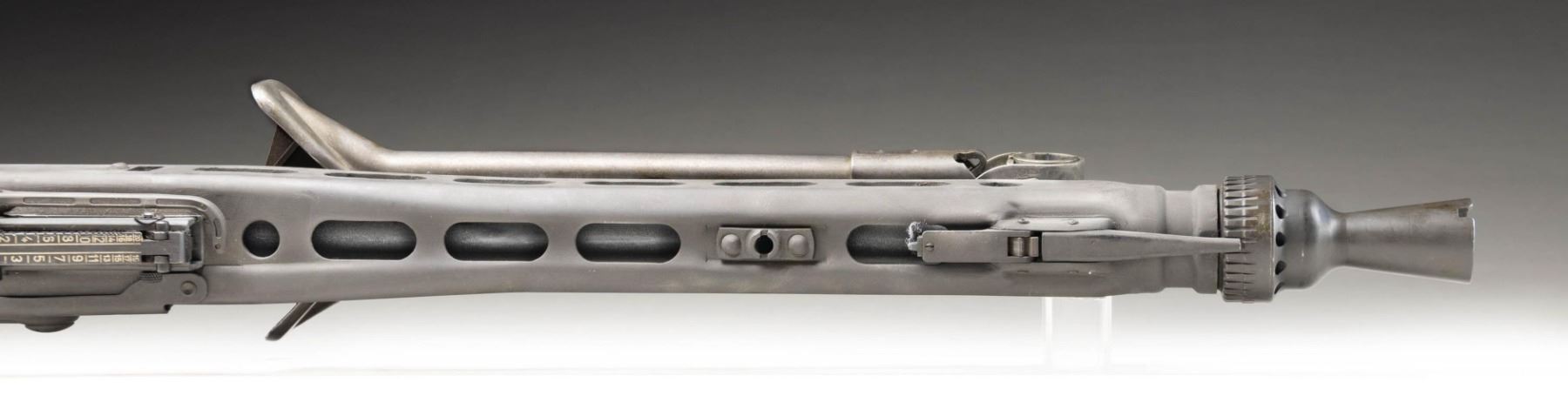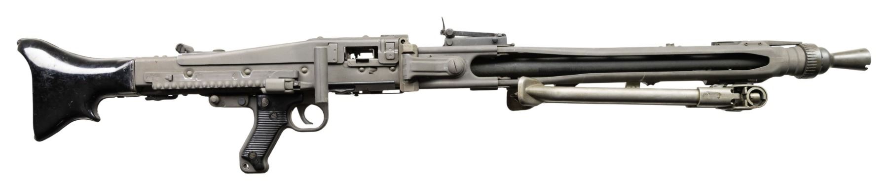 MACHINE GUN. Cal. 7.92mm. S#59B. Bbl is 20"; 22-1/4" with barrel collar. Bbl 26" over screw on flash hider. An awesome opportunity to own a nice shooter grade example of "Hitler's Buzzsaw". Full length barrel shroud with fold up blade front sight. Ladder adjustable rear sight graduated to 2000 meters. Two position push button safety. Synthetic buttstock. Ribbed pistol grips. Folding stamped metal bipod. CONDITION: overall very fine with refinished grey parkerized style finish with some light scattered handling marks and mild cycling wear. Left side of shroud has re-weld. Some unmarked and replaced components. Mechanically sound when cycled by hand. Bright shiny bore with light wear to the rifling. PROVENANCE: Military Museum Collection of Shooters Outpost, Hooksett NH. NATIONAL FIREARMS ACT MG REQUIRING BATF TRANSFER BEFORE TAKING POSSESSION. FULLY TRANSFERABLE. (03-1987/ZAL). MODERN CLASS III. $40,000-50,000.