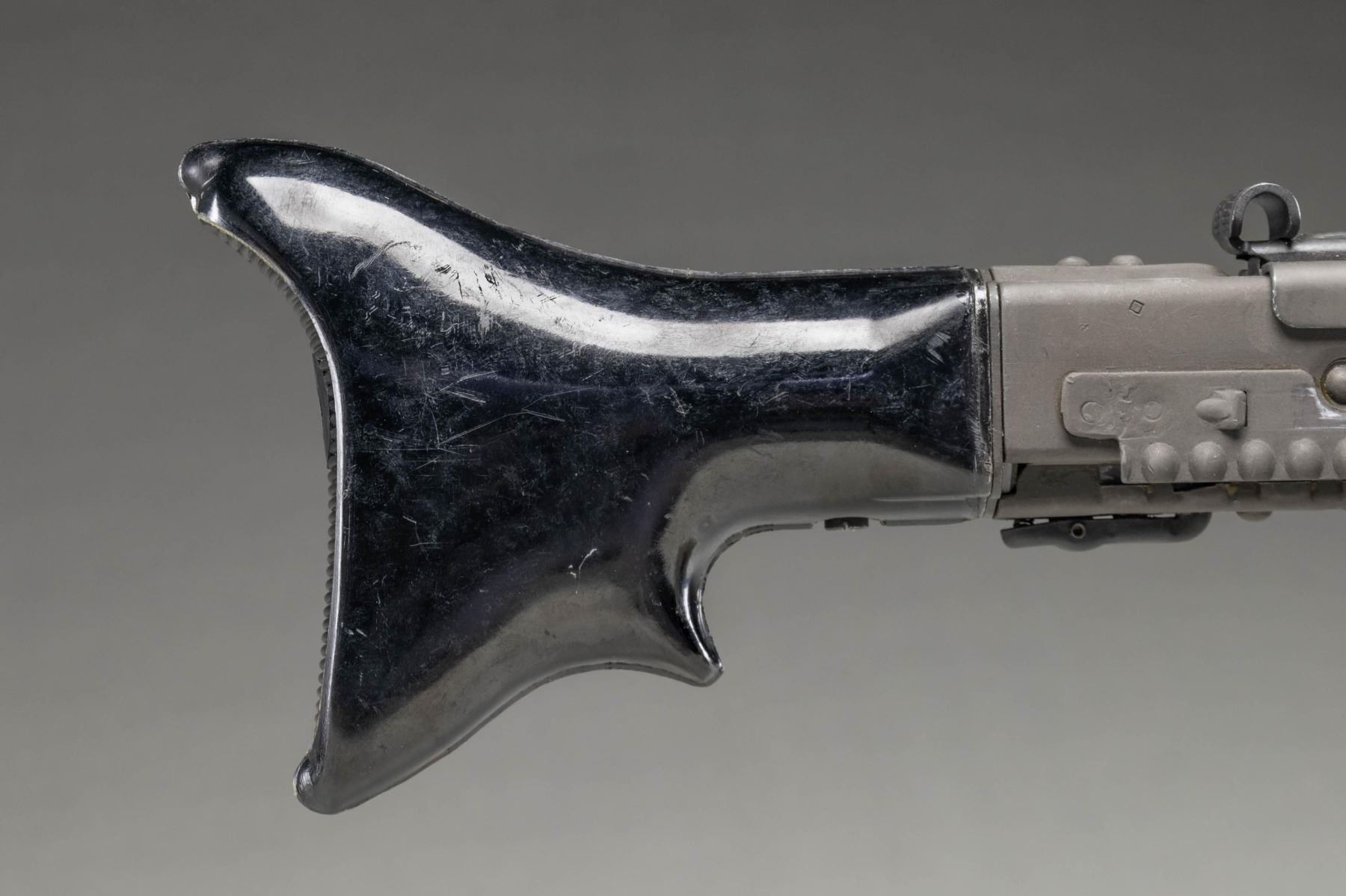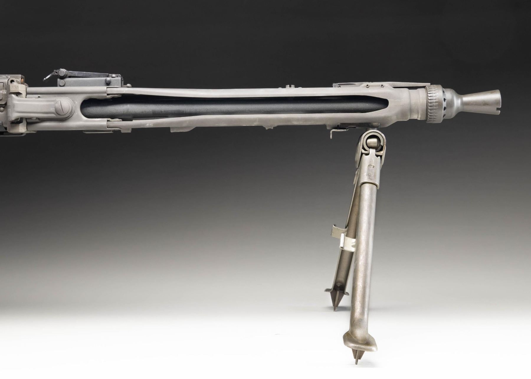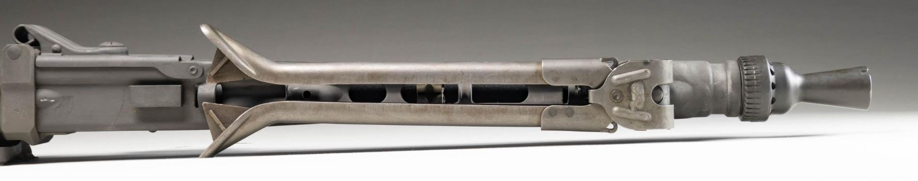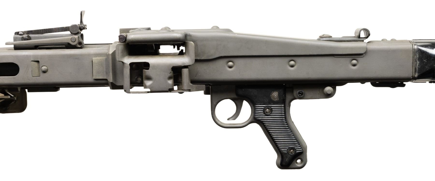 MACHINE GUN. Cal. 7.92mm. S#59B. Bbl is 20"; 22-1/4" with barrel collar. Bbl 26" over screw on flash hider. An awesome opportunity to own a nice shooter grade example of "Hitler's Buzzsaw". Full length barrel shroud with fold up blade front sight. Ladder adjustable rear sight graduated to 2000 meters. Two position push button safety. Synthetic buttstock. Ribbed pistol grips. Folding stamped metal bipod. CONDITION: overall very fine with refinished grey parkerized style finish with some light scattered handling marks and mild cycling wear. Left side of shroud has re-weld. Some unmarked and replaced components. Mechanically sound when cycled by hand. Bright shiny bore with light wear to the rifling. PROVENANCE: Military Museum Collection of Shooters Outpost, Hooksett NH. NATIONAL FIREARMS ACT MG REQUIRING BATF TRANSFER BEFORE TAKING POSSESSION. FULLY TRANSFERABLE. (03-1987/ZAL). MODERN CLASS III. $40,000-50,000.