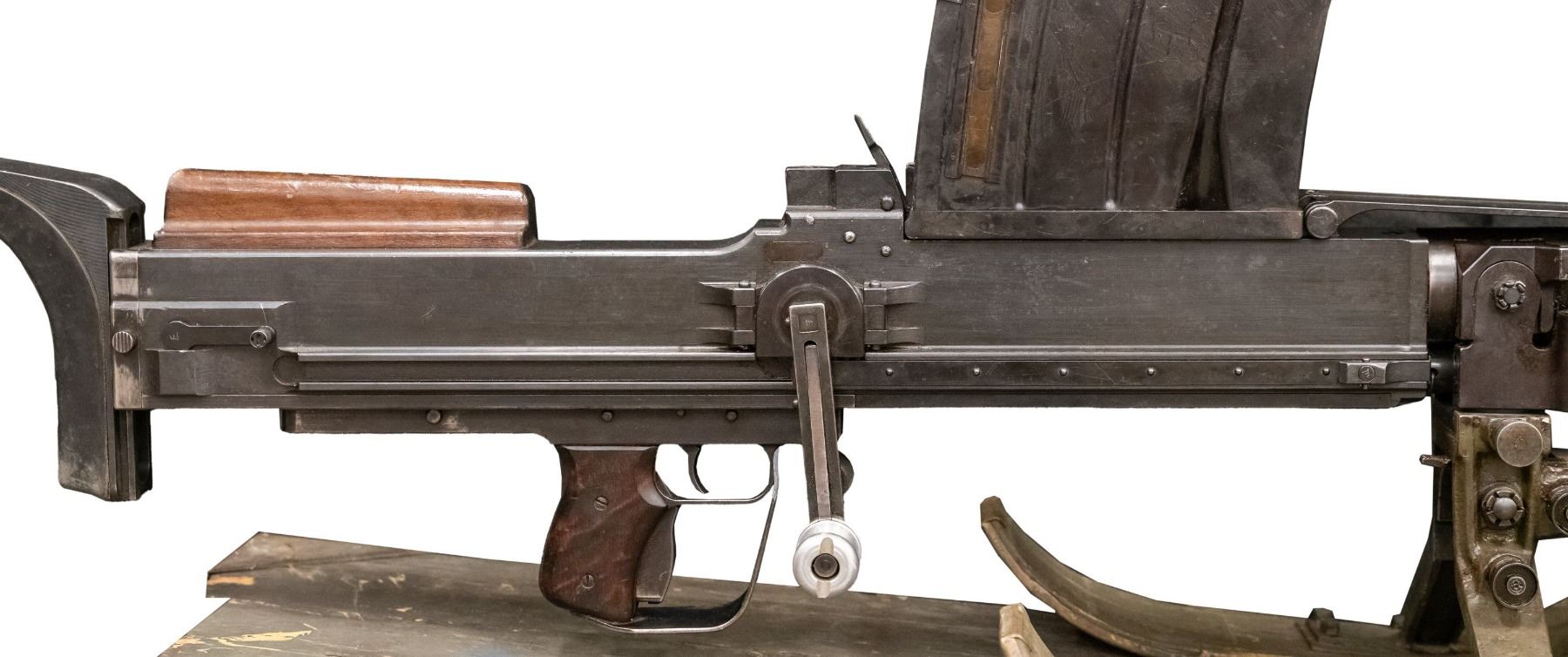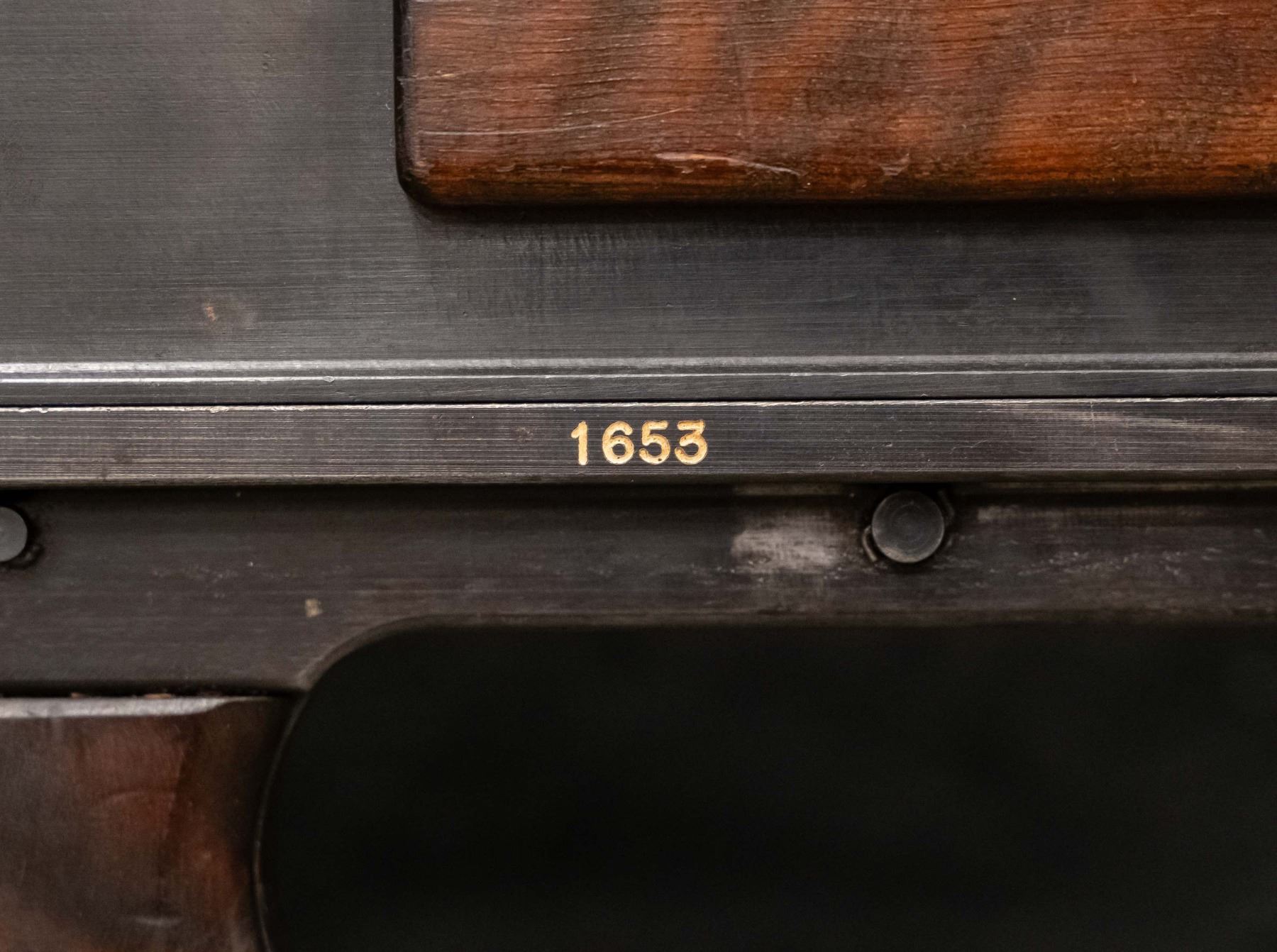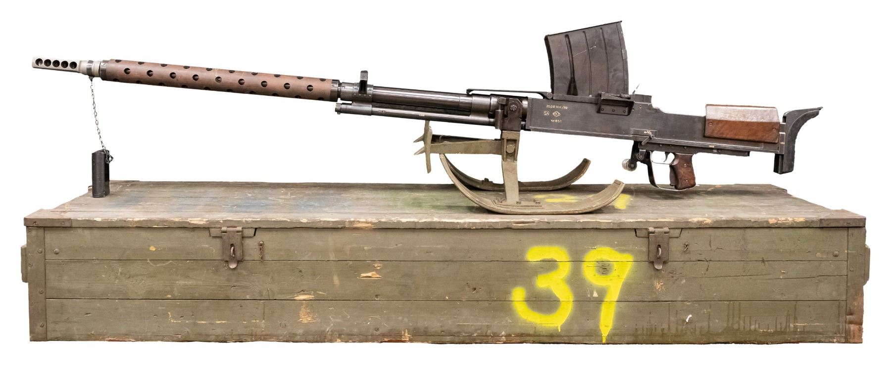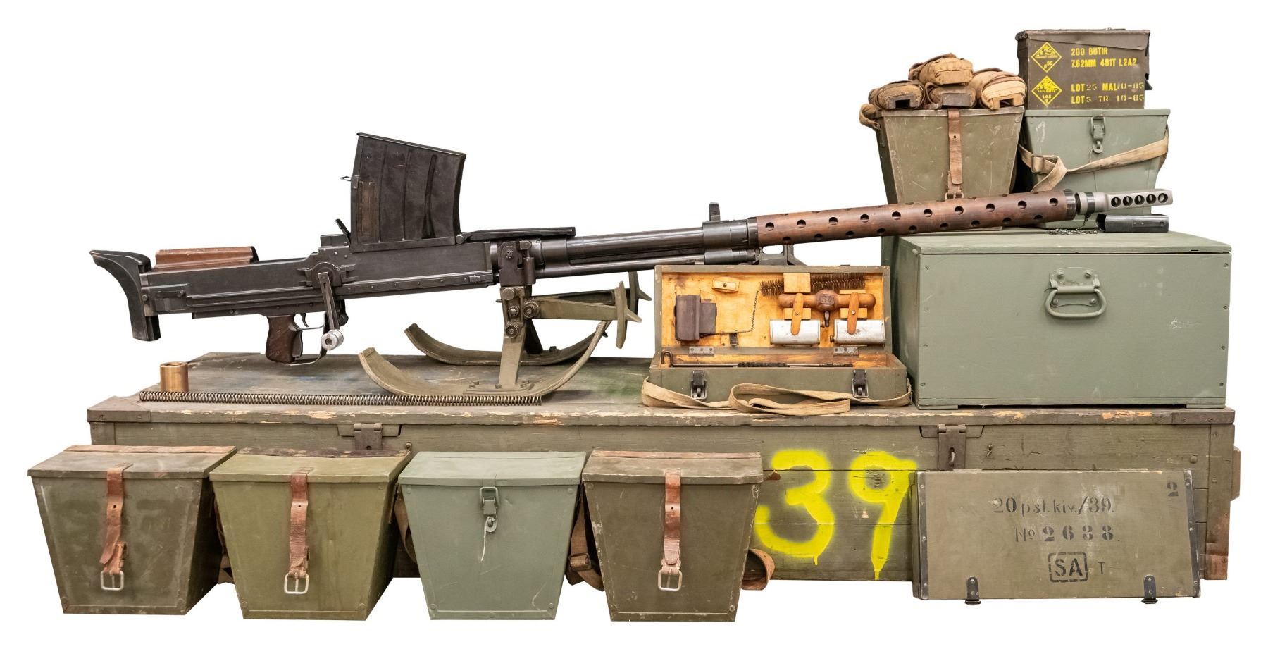 RIFLE WITH TRANSIT CHEST & SPARE PARTS. Cal. 20mm. S# 1653. Bbl. 55". Originally derived from the earlier Lahti aircraft cannon of 1937 & modified as a ground weapon. Aside from the sheer size, one of the most recognizable features is the ski-equipped bipod. Another interesting and recognizable feature is the 26" ventilated, wooden barrel shroud. The Lahti Model 39 is a gas operated, self-loading design. The recoil spring is so massive that it would be impossible to retract in a strait line, like a traditional rifle, so it was designed w/ a crank mechanism to charge it. It takes 2 complete, clockwise revolutions to fully retract the bolt & operating spring, but it is done w/ ease due to the mechanical advantage. When the operator is ready to fire it, a lever on the front of the pistol grip is depressed, dropping the bolt & chambering the round to be fired. Upon firing, the empty casing would be violently discharged from below the gun, making contact w/ a hard rubber roller mounted in front of the the trigger guard before hitting the ground. The bolt is returned to its rearward position, so the chamber can remain empty & start cooling before firing the next round. It is rumored that though these were designed to fire only a single shot per function of the trigger, it wasn't uncommon for a malfunction to operate as a fully automatic, surprising the shooter w/ a burst of fire. Though these guns were a little late for the Winter War of 1939/40, a few were said to have been deployed though there seems to be no official record of their performance. Ski style bipod has 2 positions, the other w/ stakes to grip the ground when deployed on a harder surface than snow. The overall length is 86" w/ 55" of it being barrel alone. Threaded muzzle, sporting the factory 10 chamber muzzle brake measuring over 5" in length itself. It includes the original steel muzzle brake cover that snaps in place to help keep debris out of the barrel. The sights consist of a protected post front blade and the rear sights are a tangent sight , elevation adjustable from 200 meters to 1400 meters. The enormous mag-well is located on top of the action and feeds down, w/ the ejection port below the action in front of the trigger guard. (It is VERY important to NEVER have a body part in the way of the ejection path due to the size & velocity of the empty casings being ejected). When not being fed ammo, the mag-well has a dust cover that locks closed w/ the mag release to keep the action free from debris. All exposed metal surfaces have a nice deep blued finish. Manufactured at the Finnish State Rifle Factory "VKT", it is marked "20pst.kiv/39" with "SA" marking above SN on left side of receiver. Barrel is "VKT" marked and numbered 4045. MAGS: 10 steel factory 10 rd. UNATTACHED ACCESSORIES: original transit chest w/ 6 magazine boxes, 5 holding 2 magazines each & one w/ several spare parts for the charging system, 1 spare parts box & 1 shooters box, each appearing to contain the majority of their original parts & tools. 2 wooden mag loaders, 1 spare partially complete bipod assembly, brass barrel thread protector & 14 assorted rounds of ammo. CONDITION: blued finish on metal surfaces remains complete & consistent w/ full coverage, demonstrating some period typical, scattered gentle patina. Wooden barrel shroud remains in very nice shape w/ typical dings & scratches from handling. Wood stock piece has typical impressions but overall in very nice condition. Rubber recoil pad free of any noticeable deterioration. Transit chest shows some typical age but remains strong & functional. Magazines still retain the majority of factory finish. Ammo demonstrates some corrosion & staining spanning from very light to heavy. Bore appears to be healthy w/ aggressive rifling, some areas still packed in cosmoline. Fire control mechanism functions smoothly & appears to operate correctly when cycled by hand. NATIONAL FIREARMS ACT DESTRUCTIVE DEVICE REQUIRING BATF TRANSFER BEFORE TAKING POSSESSION. FULLY TRANSFERABLE. (03-1924/JZ). CURIO CLASS III. $17,500-25,000.