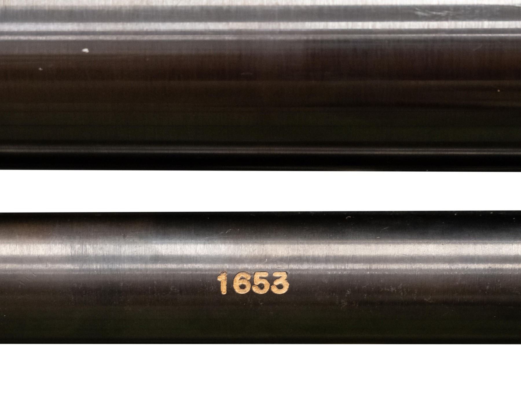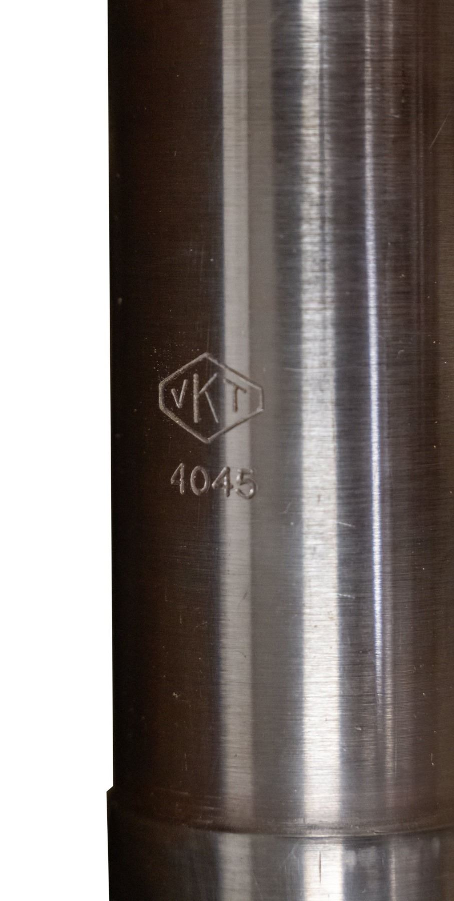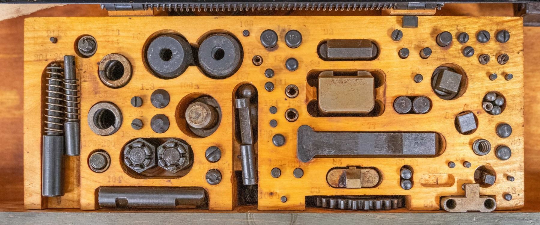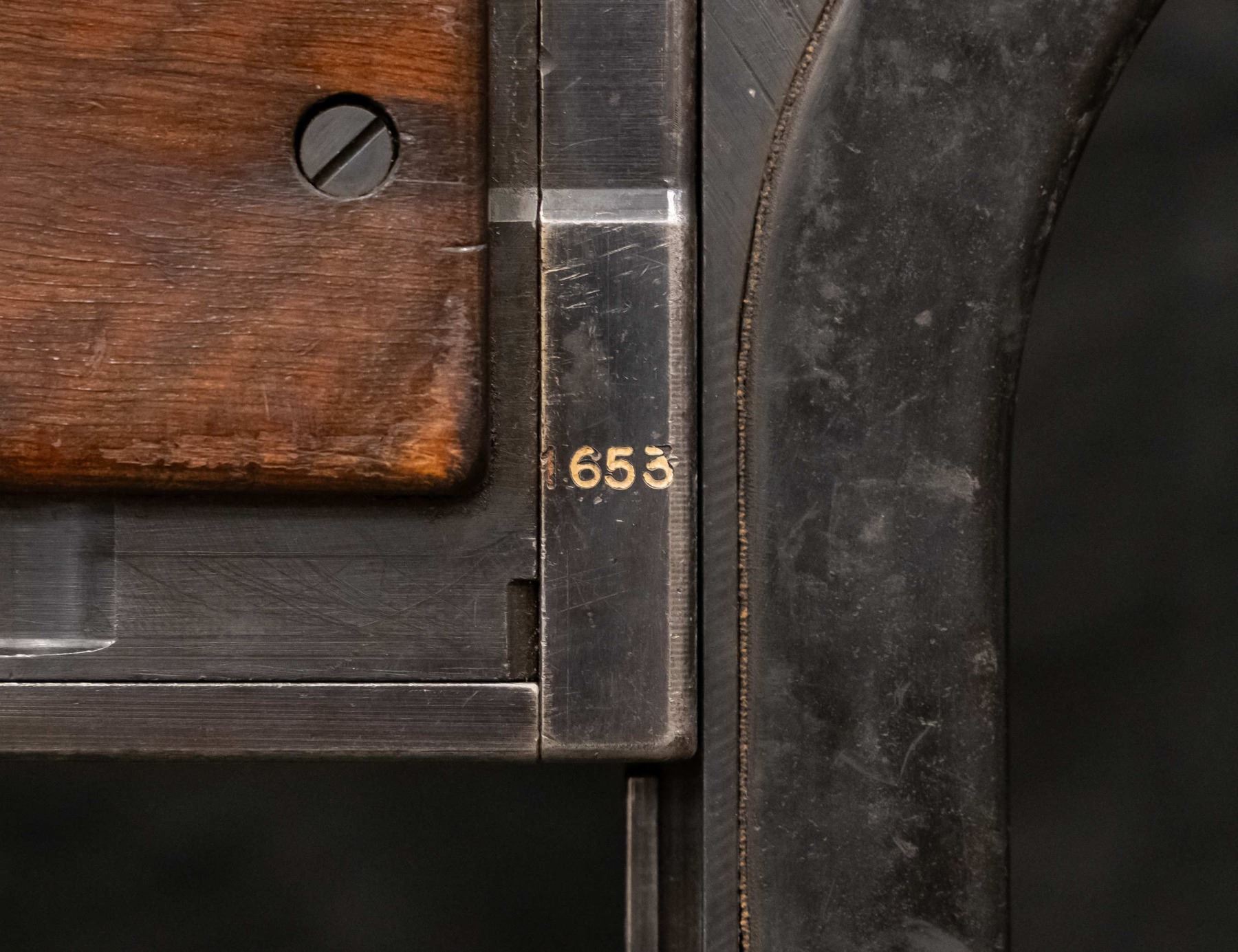 RIFLE WITH TRANSIT CHEST & SPARE PARTS. Cal. 20mm. S# 1653. Bbl. 55". Originally derived from the earlier Lahti aircraft cannon of 1937 & modified as a ground weapon. Aside from the sheer size, one of the most recognizable features is the ski-equipped bipod. Another interesting and recognizable feature is the 26" ventilated, wooden barrel shroud. The Lahti Model 39 is a gas operated, self-loading design. The recoil spring is so massive that it would be impossible to retract in a strait line, like a traditional rifle, so it was designed w/ a crank mechanism to charge it. It takes 2 complete, clockwise revolutions to fully retract the bolt & operating spring, but it is done w/ ease due to the mechanical advantage. When the operator is ready to fire it, a lever on the front of the pistol grip is depressed, dropping the bolt & chambering the round to be fired. Upon firing, the empty casing would be violently discharged from below the gun, making contact w/ a hard rubber roller mounted in front of the the trigger guard before hitting the ground. The bolt is returned to its rearward position, so the chamber can remain empty & start cooling before firing the next round. It is rumored that though these were designed to fire only a single shot per function of the trigger, it wasn't uncommon for a malfunction to operate as a fully automatic, surprising the shooter w/ a burst of fire. Though these guns were a little late for the Winter War of 1939/40, a few were said to have been deployed though there seems to be no official record of their performance. Ski style bipod has 2 positions, the other w/ stakes to grip the ground when deployed on a harder surface than snow. The overall length is 86" w/ 55" of it being barrel alone. Threaded muzzle, sporting the factory 10 chamber muzzle brake measuring over 5" in length itself. It includes the original steel muzzle brake cover that snaps in place to help keep debris out of the barrel. The sights consist of a protected post front blade and the rear sights are a tangent sight , elevation adjustable from 200 meters to 1400 meters. The enormous mag-well is located on top of the action and feeds down, w/ the ejection port below the action in front of the trigger guard. (It is VERY important to NEVER have a body part in the way of the ejection path due to the size & velocity of the empty casings being ejected). When not being fed ammo, the mag-well has a dust cover that locks closed w/ the mag release to keep the action free from debris. All exposed metal surfaces have a nice deep blued finish. Manufactured at the Finnish State Rifle Factory "VKT", it is marked "20pst.kiv/39" with "SA" marking above SN on left side of receiver. Barrel is "VKT" marked and numbered 4045. MAGS: 10 steel factory 10 rd. UNATTACHED ACCESSORIES: original transit chest w/ 6 magazine boxes, 5 holding 2 magazines each & one w/ several spare parts for the charging system, 1 spare parts box & 1 shooters box, each appearing to contain the majority of their original parts & tools. 2 wooden mag loaders, 1 spare partially complete bipod assembly, brass barrel thread protector & 14 assorted rounds of ammo. CONDITION: blued finish on metal surfaces remains complete & consistent w/ full coverage, demonstrating some period typical, scattered gentle patina. Wooden barrel shroud remains in very nice shape w/ typical dings & scratches from handling. Wood stock piece has typical impressions but overall in very nice condition. Rubber recoil pad free of any noticeable deterioration. Transit chest shows some typical age but remains strong & functional. Magazines still retain the majority of factory finish. Ammo demonstrates some corrosion & staining spanning from very light to heavy. Bore appears to be healthy w/ aggressive rifling, some areas still packed in cosmoline. Fire control mechanism functions smoothly & appears to operate correctly when cycled by hand. NATIONAL FIREARMS ACT DESTRUCTIVE DEVICE REQUIRING BATF TRANSFER BEFORE TAKING POSSESSION. FULLY TRANSFERABLE. (03-1924/JZ). CURIO CLASS III. $17,500-25,000.