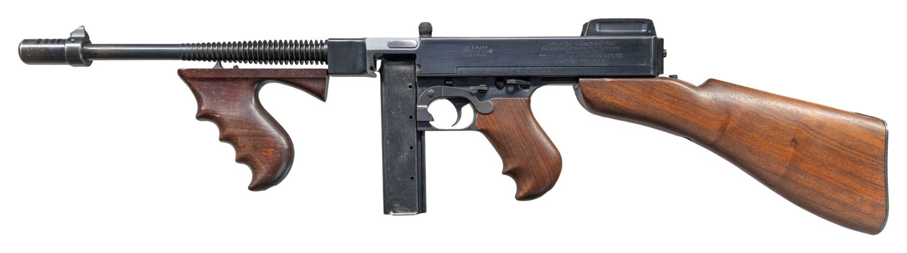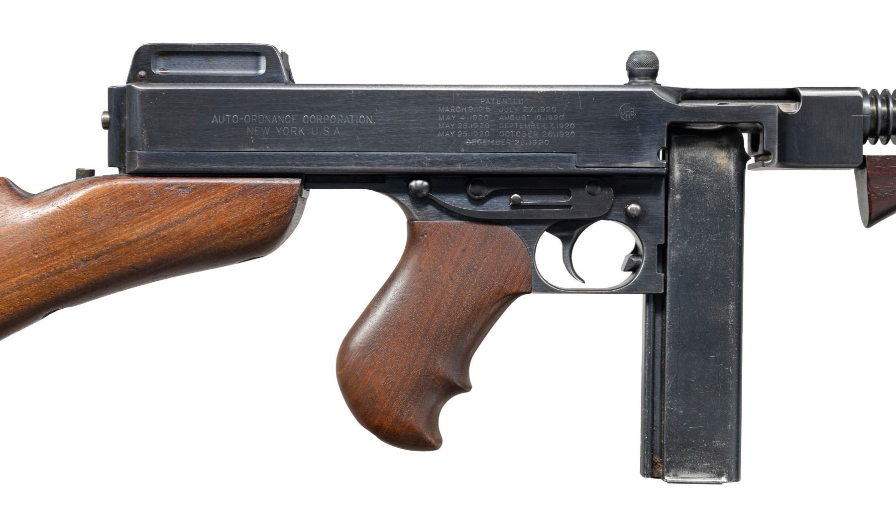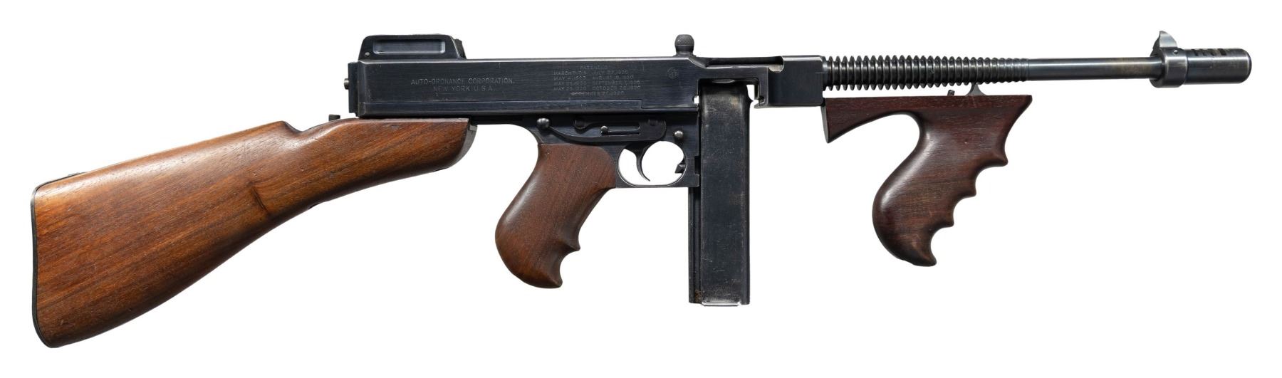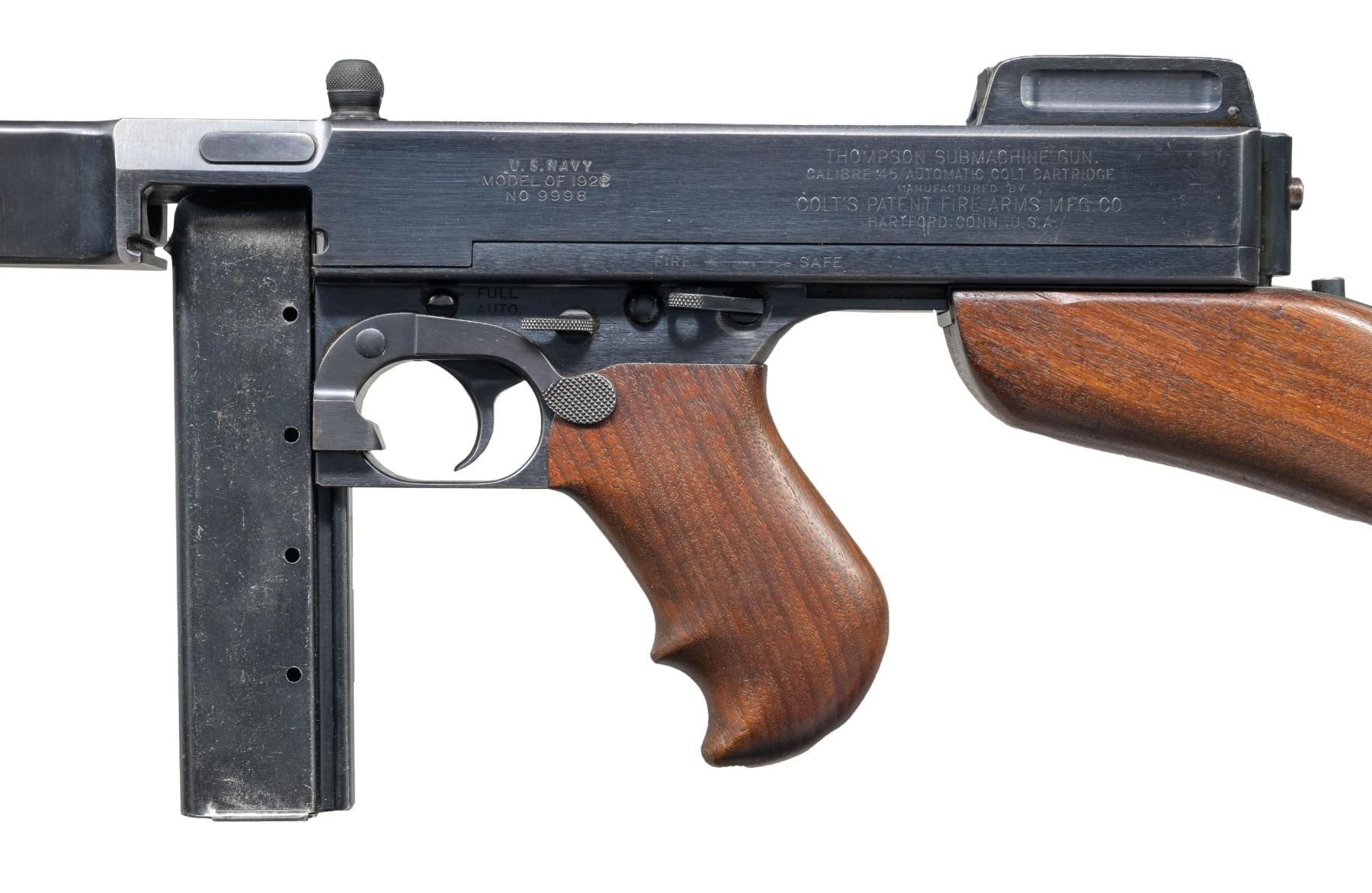 SUBMACHINE GUN. 1 of 2 CONSECUTIVELY NUMBERED GUNS (LOT 1026). Cal. 45 ACP. S# 9998. Bbl. 11". Consecutively numbered w/ previous lot. Classic Thompson SMG, US Model 1928 over-stamp, manufactured by Colt in Hartford, CT, marked Auto-Ordnance Corporation, in New York, NY. This gun is listed in the book "COLT THOMPSON SUBMACHINE GUN SERIAL NUMBERS & HISTORIES", Volume 1, on page 909, as being shipped to the City of Waterloo, Chief of Police on 6/18/34. It has a 28 rib finned barrel, terminated w/ Cutts compensator w/ diamond "Cutts" logo & patent dates. Traditional, vertical wood fore arm. Front blade sight integral w/ Cutts compensator & rear is adjustable Lyman graduated sight. Hardwood, rear shoulder stock w/ trapdoor buttplate. Slotted & knurled, top mounted cocking knob. Blued finish on exposed metal surfaces. Left side receiver markings are as follows: “U.S. NAVY / MODEL OF 1928”, (w/ the "1" over-stamped "8" in the original 1921), above the serial number. “THOMPSON SUBMACHINE GUN / CALIBRE 45 AUTOMATIC COLT CARTRIDGE / MANUFACTURED BY / COLT'S PATENT FIRE ARMS MFG. CO. / HARTFORD, CONN. U.S.A.". Right side markings include patent block below cocking knob & “AUTO-ORDANACE CORPORATION / NEW YORK, U.S.A." & "JHB" acceptance stamp for John H. Barrett, Colt's quality control inspector. Top of receiver marked w/ Thompson bullet trade mark logo, forward of rear sight. Trigger frame serial number matches receiver number. Left side trigger frame marked "FULL AUTO (2 lines) / SINGLE" while selector is marked "FIRE / SAFE". MAGS: 1 Crosby Co. 20 rd. CONDITION: blued finish on receiver is complete & consistent w/ some thinning on high spots & in areas of mechanical intervention & on barrel toward muzzle end. Some light patina/staining, on steel butt plate. Markings are easy to read, remaining sharp & clear. Wood furniture is dark and matches well, having a few period typical scratches & depressions. Bright bore w/ descent rifling. Fire control mechanism appears to function smoothly & correctly when cycled by hand. FULLY TRANSFERABLE NATIONAL FIREARMS ACT SMG REQUIRING BATF TRANSFER BEFORE TAKING POSSESSION. (03-1936/JZ). CURIO, CLASS III. $20,000-30,000.