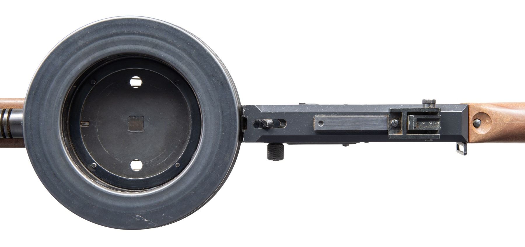 RIMFIRE SUBMACHINE GUN. Cal. 22 LR. S# X024. Bbl. 16.5". Originally mfg. & imported from Austria, the earliest American 180 variants were classified as Dealer Samples due to the inability to import transferable machine guns after 1968. E&L mfg. started building a version in the United States & since they were domestic in mfg., these were fully transferable firearms. Research has indicated that approx. 24 examples were mfg. & registered by S&S Arms. It's interesting to note that this particular gun bears the S# X024, possibly being the last firearm produced. The American 180 is an open bolt, select fire 22 LR buzz saw that feeds from a 176 rd., 3 tiered drum. The cyclic rate is often rumored to be in excess of 2000 RPM & a single burst in a full mag. is completed in only 7 seconds. The sound is as unique as its appearance, compared more to that of a chainsaw than a firearm because of the excessive cyclic rate. The bbl. is finned in a similar style to that of the legendary Thompson w/ a protected blade front sight & an adj. peep rear sight. The forend, pistol grip & shoulder stock are a brown plastic designed to imitate wood aesthetics. Pistol grip is checkered w/ finger grooves. Finish on all exposed metal parts w/ the exception of the natural finished aluminum receiver, is blued or black paint. Left side non reciprocating charging handle. Safety is located on the right side of the receiver. The selector is a cross slide pin. When pushed from left to right, full auto is selected & will continue to fire as long as trigger is held to the rear. When the pin is pushed in from the right, it is an open bolt semi auto action. The unique drum, w/ winding assembly is mounted on the top, above the chamber, forward of the trigger. The ejection port is below the firearm forward of the trigger. Receiver marked on left side w/ name of previous owner tastefully engraved just above ejection port. Right rear markings are "AMERICAN 180" over "X024". Right side receiver markings include "S&S" logo & "S&S ARMS CO."/ "ALBUQUERQUE, NM"/ "U.S.A.". Bbl. marked on top w/ 2 indistinguishable marks, "73" & "AMERICAN INTERNATIONAL CORP"/ "SLC. UTAH USA"/ "A001881". Top of bbl. just rear of front sight marked "MADE IN AUSTRIA". Removable rear stock locks w/ a single pushbutton to the rear of the receiver similar to that of a Thompson SMG. Sling swivels front & rear on left side. MAGS: 2 steel 176 rd. drums w/ 1 winder. CONDITION: original finish enjoys full coverage on exposed metal surfaces w/ only gentle thinning to indicate prior use. No major visible flaws of any type. Plastic furniture exhibits only light handling marks, however the rear portion of the shoulder stock leans more towards a matte finish. Bright bore w/ visible rifling. Fire control mechanism appears to function correctly when cycled by hand. Both drums appear to have seen little use & both rotate freely. NATIONAL FIREARMS ACT SMG REQUIRING BATF TRANSFER BEFORE TAKING POSSESSION. FULLY TRANSFERABLE. (03-1938/JZ). MODERN CLASS III. $15,000-20,000.