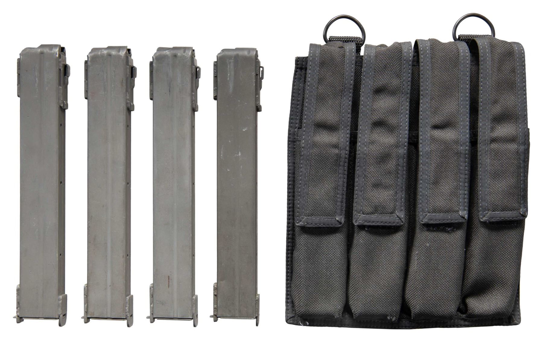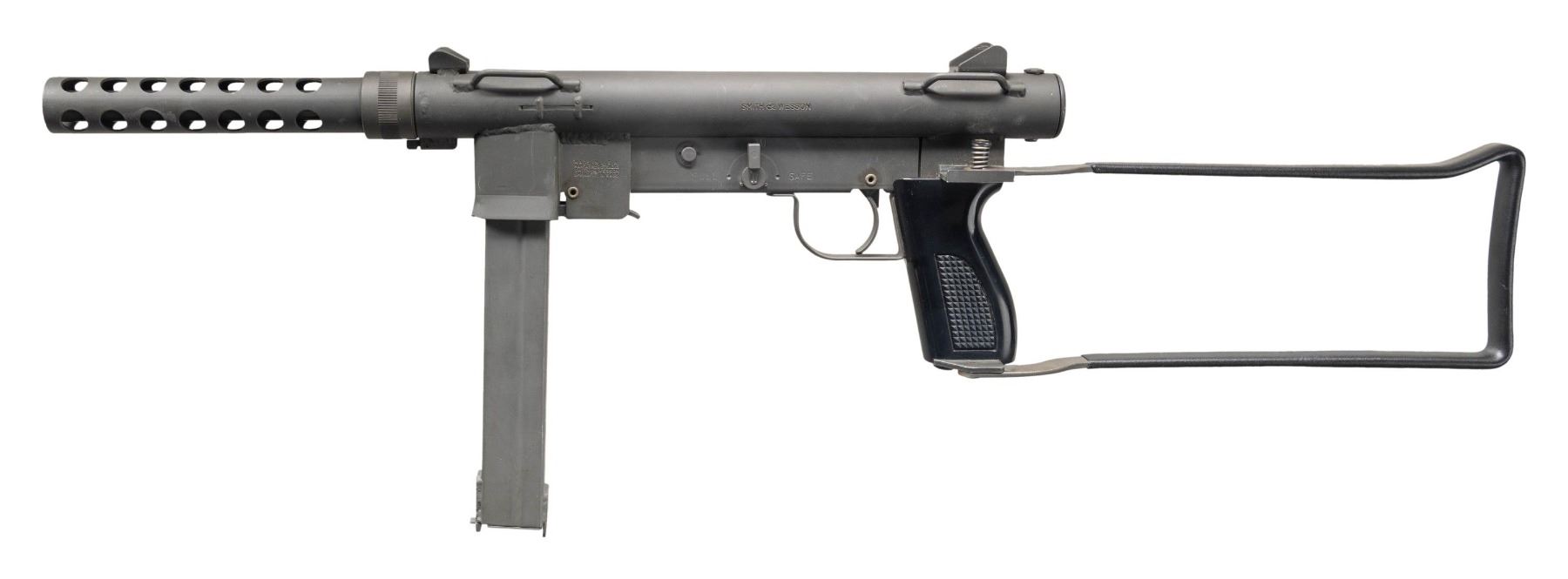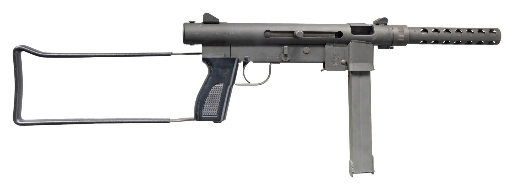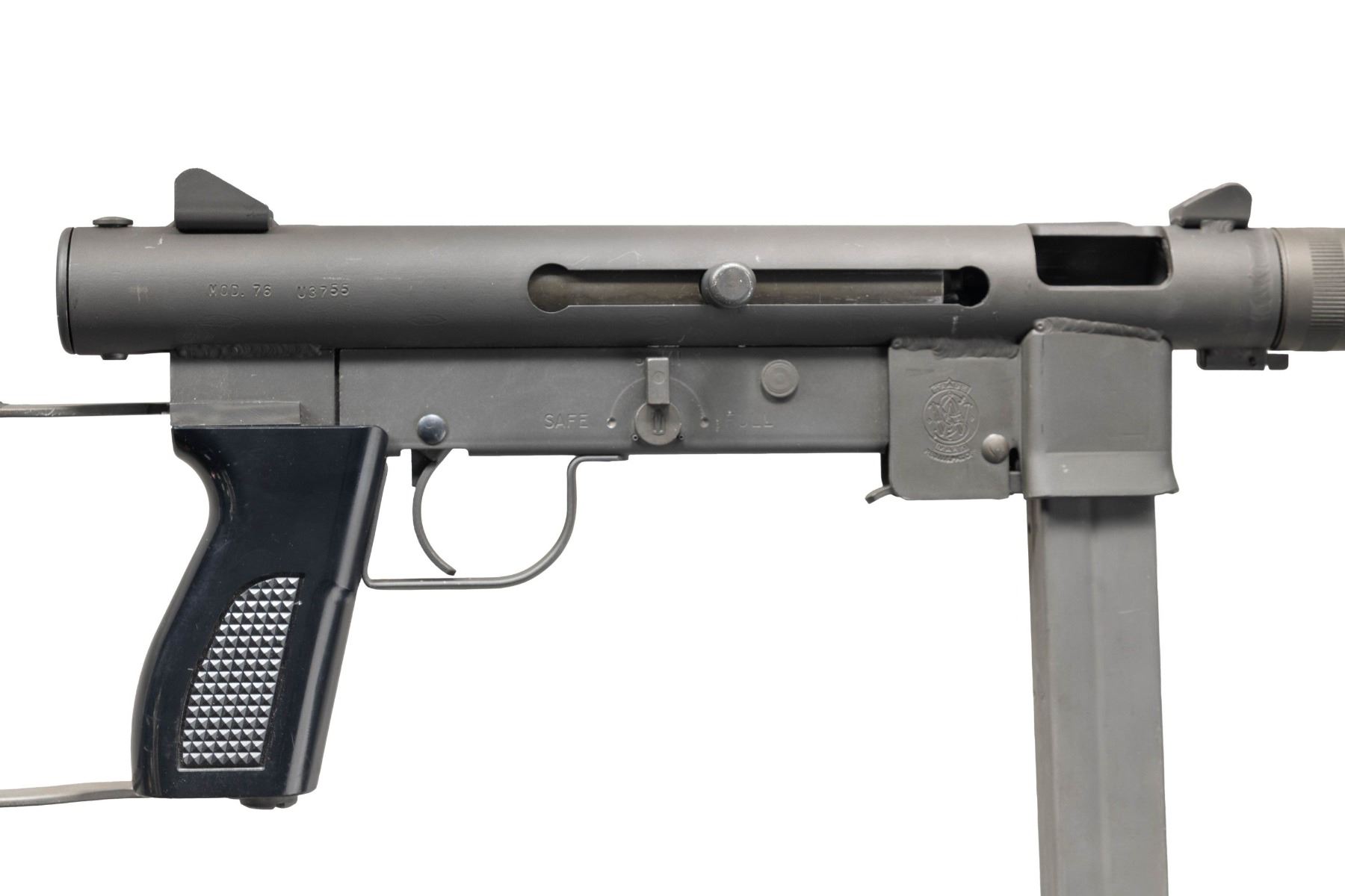 Cal. 9mm. S# U3755. Bbl. 8". The Smith 76, as its commonly referred to, as a factory S&W open bolt SMG. It has a left side folding loop style stock. The tubular receiver is similar in aesthetics to the more commonly seen British Sten, although w/ the S&W the mag protrudes from the bottom in a more traditional design. Dark black factory parkerized finish on exposed metal surfaces. The black plastic pistol grip is integral w/ the folding stock. The receiver incorporates two sling attachment points at approx. the 11 o'clock position. Protected post fixed front sight, fixed protected peep rear sight. Ambidextrous safety/selector. The bbl. nut is very similar in design to that of the combat proven Uzi SMG & utilizes an integral 6" slotted shroud to protect user from contacting a hot bbl. Left side marking on tubular receiver "SMITH & WESSON". Left side rearward of mag. well "Made in USA / Marcas Registradas / Smith & Wesson / Springfield, MASS." Safety/selector markings "Safe Semi Full". Right side marking tubular receiver above pistol grip "MOD76" w/ serial number. Safety selector markings repeated on right. Right side rear of mag. well is SW Trademark. MAGS: 4 steel 36 rd. CONDITION: parkerizing on exposed metal surfaces is uniform & complete w/ wear shown where safety selector rides over receiver & areas of mechanical intervention, as well as some very gentle thinning typically associated w/ rack storage. Folding stock locks correctly in open & closed positions & rubber coating is complete & free of major defect. Bright bore w/ strong rifling. Fire control mechanism appears to function correctly when cycled by hand. NATIONAL FIREARMS ACT MG REQUIRING BATF TRANSFER BEFORE TAKING POSSESSION. FULLY TRANSFERABLE. (03-1931/JZ). CURIO CLASS III. $12,000-18,000.