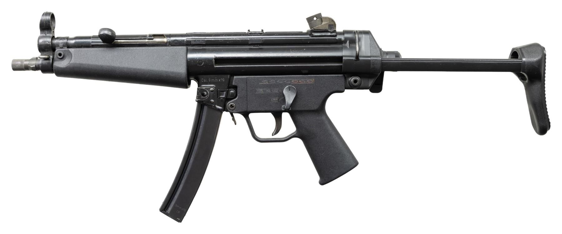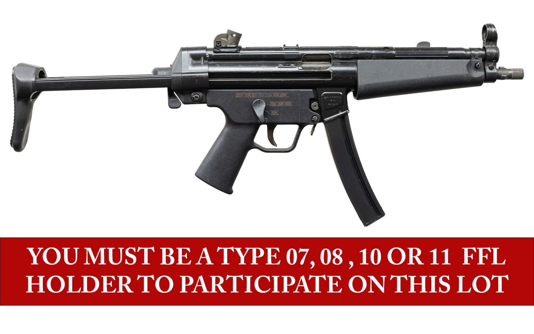 ***BIDDERS INTERESTED IN THIS LOT MUST CURRENTLY HOLD A TYPE 07, 08, 10, OR 11 FFL.*** Cal 9x19mm. S# 62-352479. Bbl 9" threaded with knurled thread protector. Top rail is marked "HK MP5-N Serial number and Eagle NAC Antler Proof". Right mag well is marked "Made in W-Germany/HK Inc/Sterling VA". Paddle and pushbutton mag release. Full, burst and safe ambidextrous selector. Telescopic stock. MAGS: 1-30 rd. CONDITION: metal finish has numerous scratches and some flaking finish. Shiny bore with light wear to rifling and scattered pitting. POST 1986 DEALER SAMPLE MACHINE GUN WITH NO LAW (DEMO) LETTER REQUIRED TO TRANSFER. RESTRICTED REGISTRATION POSSESSION LIMITED TO CONTINUED COMPLIANCE WITH PROVISIONS OF PUBLIC LAW 99-308. IF YOU ARE AN 07, 08, 10, or 11 FFL/SOT YOU MAY TAKE TRANSFER OF THIS FIREARM UPON APPROVAL OF TRANSFER. PROVENANCE: Military Museum Collection of Shooters Outpost, Hooksett NH. THIS ITEM WILL BE AVAILABLE FOR PREVIEW BY APPOINTMENT AT THE SHOOTERS OUTPOST MUSEUM IN HOOKSETT, NH. TO SET UP AN APPOINTMENT, PLEASE CALL 207-453-2114. (50-1926/ZAL). MODERN CLASS III. $6,000-8,000.