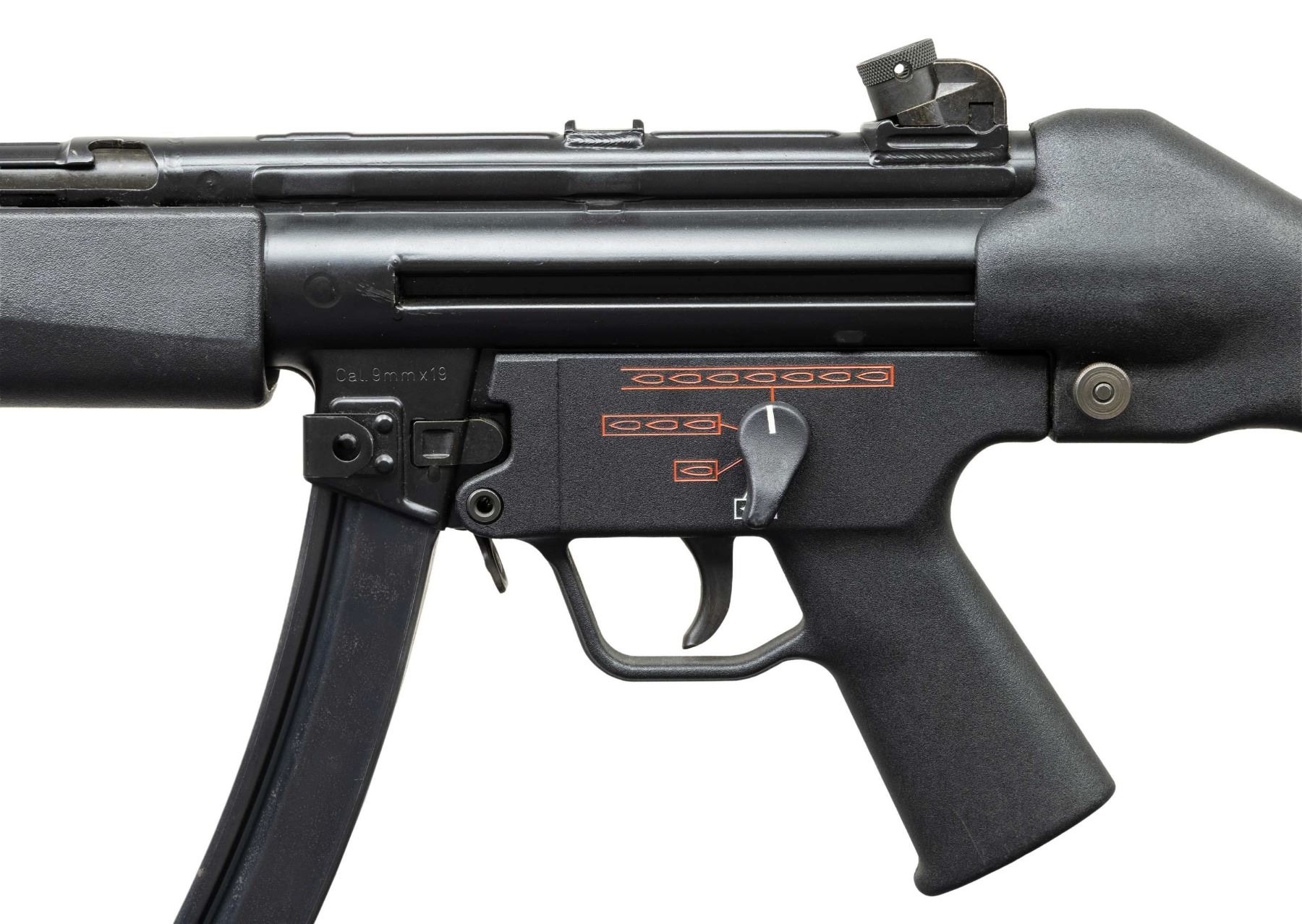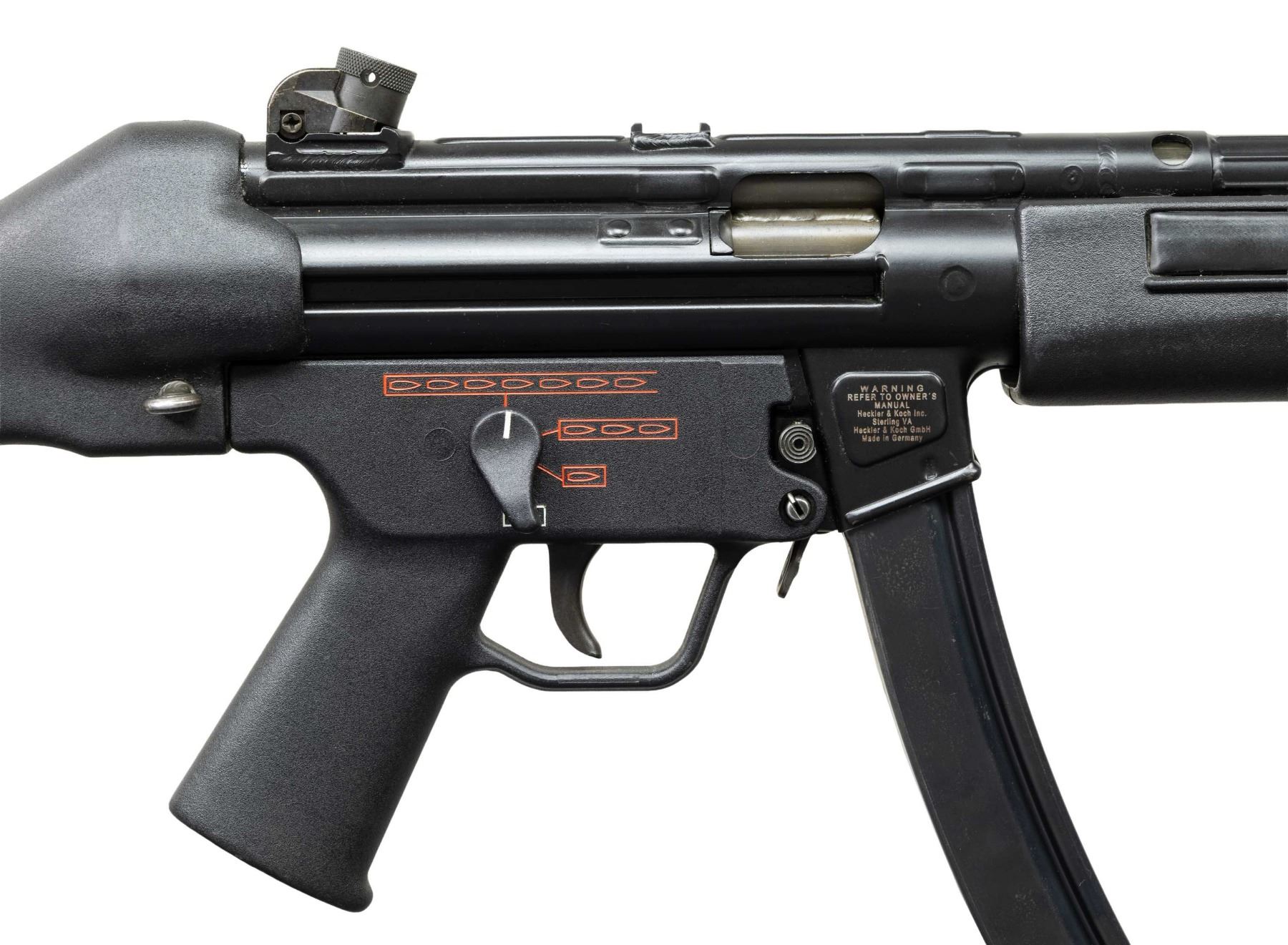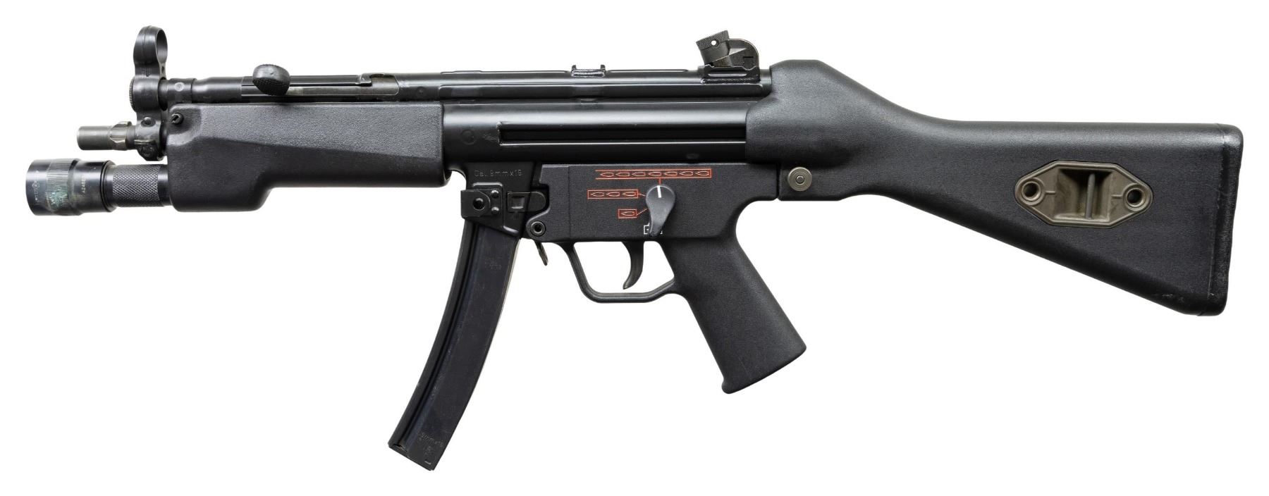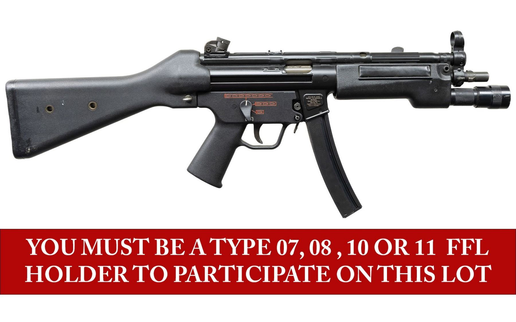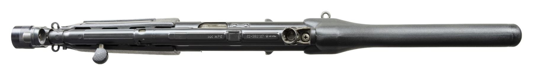 ***BIDDERS INTERESTED IN THIS LOT MUST CURRENTLY HOLD A TYPE 07, 08, 10, OR 11 FFL.*** Cal 9x19mm. S# 62-380187. Bbl 9". Top rail marked "HK, MP5, Serial number, Eagle N AB Antler Proof". Drum rear sight. Flashlight handguard. Full, burst, semi and safe ambidextrous selector. MAGS: 1-30 rd. CONDITION: overall very fine with only a couple of minor scuffs and light scratches. Flashlight does a have a couple of dings and marks. Shiny bore with some wear to the rifling. POST 1986 DEALER SAMPLE MACHINE GUN WITH NO LAW (DEMO) LETTER REQUIRED TO TRANSFER. RESTRICTED REGISTRATION POSSESSION LIMITED TO CONTINUED COMPLIANCE WITH PROVISIONS OF PUBLIC LAW 99-308. IF YOU ARE AN 07, 08, 10, or 11 FFL/SOT YOU MAY TAKE TRANSFER OF THIS FIREARM UPON APPROVAL OF TRANSFER. PROVENANCE: Military Museum Collection of Shooters Outpost, Hooksett NH. THIS ITEM WILL BE AVAILABLE FOR PREVIEW BY APPOINTMENT AT THE SHOOTERS OUTPOST MUSEUM IN HOOKSETT, NH. TO SET UP AN APPOINTMENT, PLEASE CALL 207-453-2114. (50-1929/ZAL). MODERN CLASS III. $6,000-8,000.