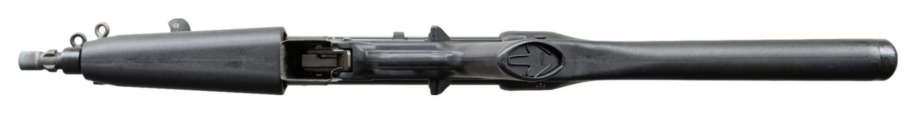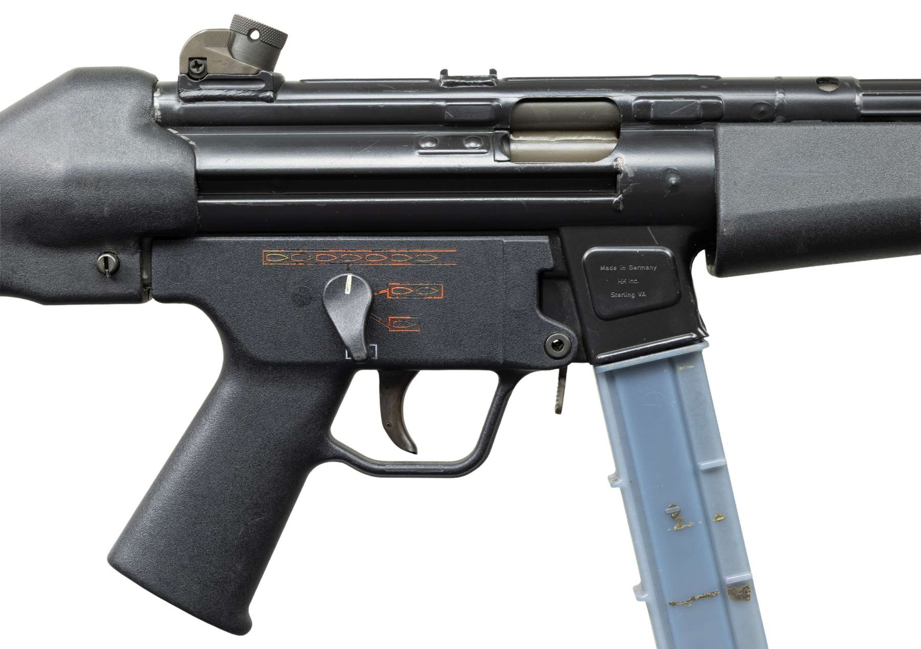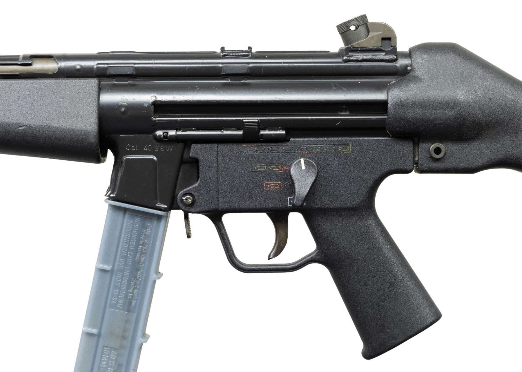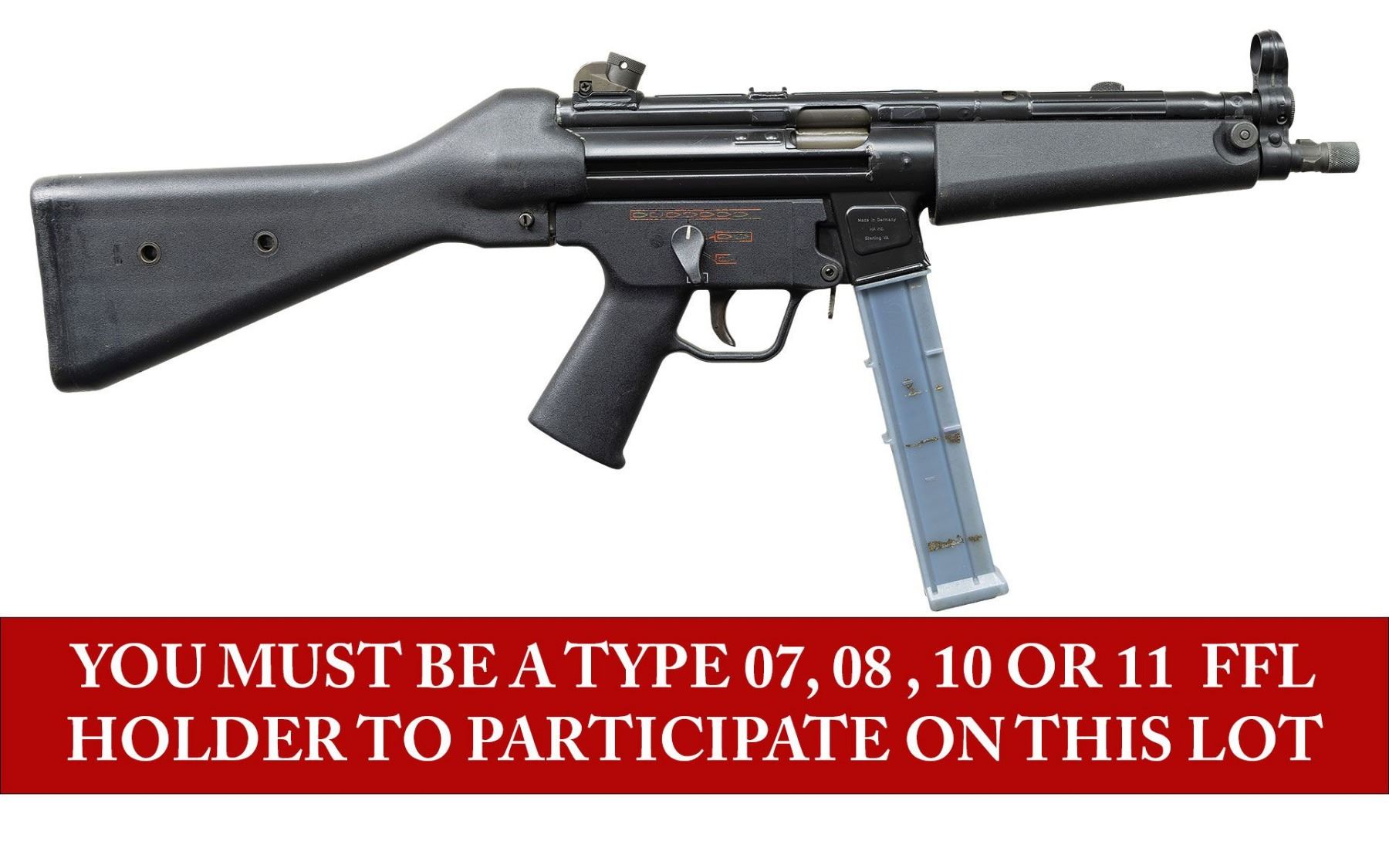 ***BIDDERS INTERESTED IN THIS LOT MUST CURRENTLY HOLD A TYPE 07, 08, 10, OR 11 FFL.*** Cal. 40. S&W. S# 69-148. Bbl 9" threaded with knurled protected cover. Right mag well is marked "Made in Germany/HK Inc./Sterling VA". Top rib is marked "HK MP5/40 69-148 Eagle NKG Antler Proof". Paddle mag release. CONDITION: overall nice example with some scattered light scratches, handling marks & high edge wear. Bbl has a bulge at the mid-point. Bore is shiny with lightly worn rifling. POST 1986 DEALER SAMPLE MACHINE GUN WITH NO LAW (DEMO) LETTER REQUIRED TO TRANSFER. RESTRICTED REGISTRATION POSSESSION LIMITED TO CONTINUED COMPLIANCE WITH PROVISIONS OF PUBLIC LAW 99-308. IF YOU ARE AN 07, 08, 10, or 11 FFL/SOT YOU MAY TAKE TRANSFER OF THIS FIREARM UPON APPROVAL OF TRANSFER. PROVENANCE: Military Museum Collection of Shooters Outpost, Hooksett NH. THIS ITEM WILL BE AVAILABLE FOR PREVIEW BY APPOINTMENT AT THE SHOOTERS OUTPOST MUSEUM IN HOOKSETT, NH. TO SET UP AN APPOINTMENT, PLEASE CALL 207-453-2114. (50-1921/ZAL). MODERN CLASS III. $4,000-7,000.