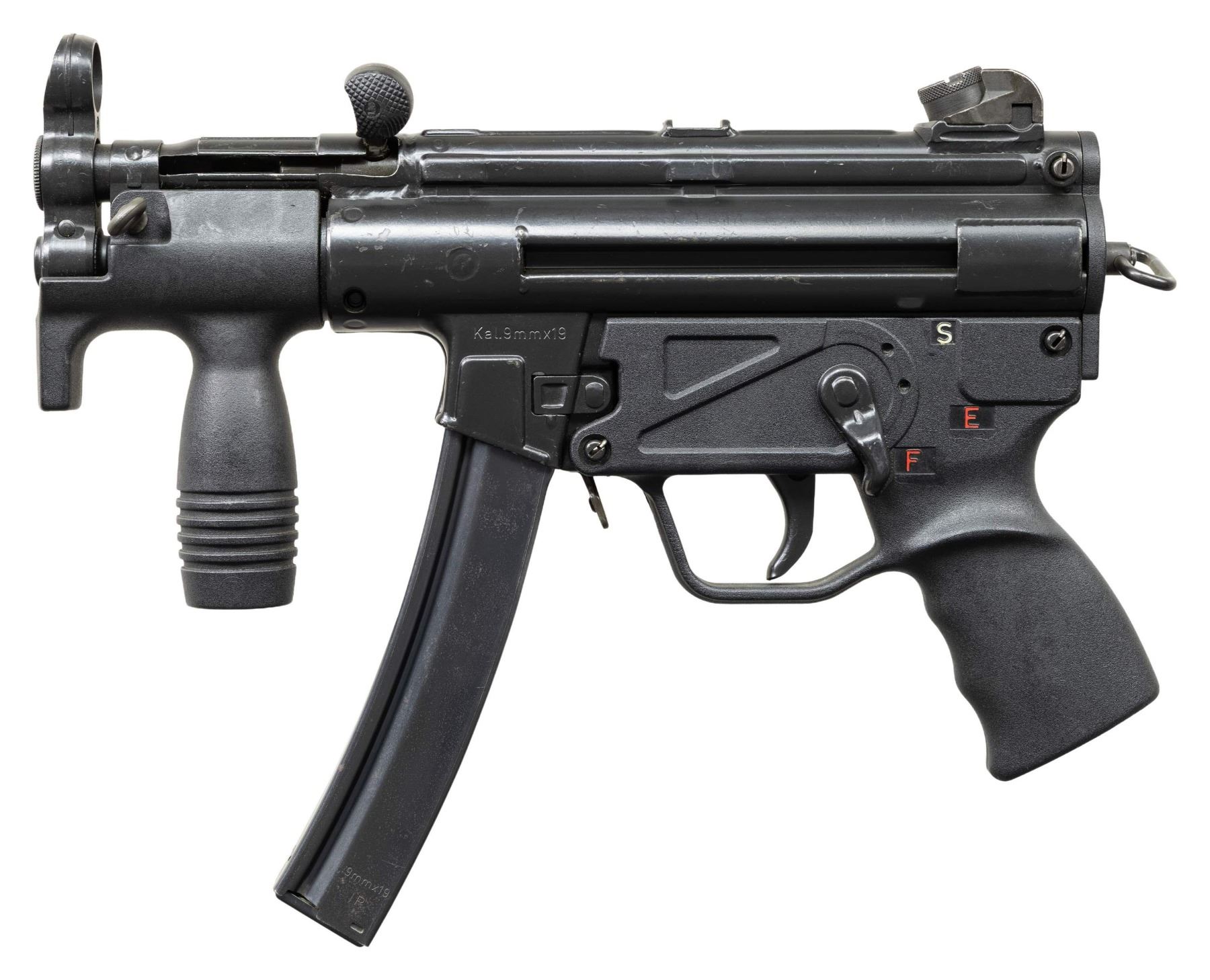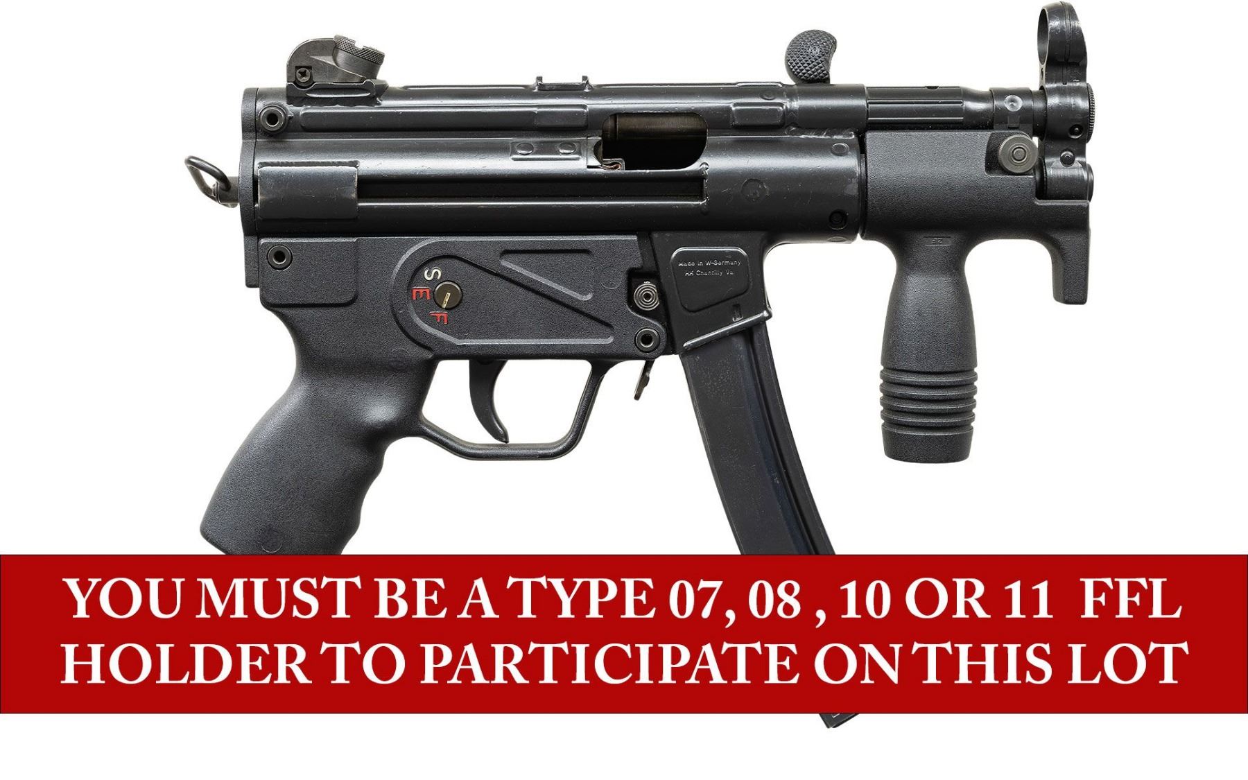 ***BIDDERS INTERESTED IN THIS LOT MUST CURRENTLY HOLD A TYPE 07, 08, 10, OR 11 FFL.*** Cal 9x19mm. S# 10979. Bbl 4.5". Top rail is marked "HK MP5K, Serial Number, Eagle NIG Antler Proof". Right mag well is marked "Made in W-Germany/HK Chantilly VA". Paddle and button magazine release. S, E and F selector. "2F" marked vertical foregrip. MAGS: 1-30 rd. CONDITION: overall very good with some mild handling marks and scratches with a few spots of flaking finish. Very nice bright shiny bore with some rifling. POST 1986 DEALER SAMPLE MACHINE GUN WITH NO LAW (DEMO) LETTER REQUIRED TO TRANSFER. RESTRICTED REGISTRATION POSSESSION LIMITED TO CONTINUED COMPLIANCE WITH PROVISIONS OF PUBLIC LAW 99-308. IF YOU ARE AN 07, 08, 10, or 11 FFL/SOT YOU MAY TAKE TRANSFER OF THIS FIREARM UPON APPROVAL OF TRANSFER. PROVENANCE: Military Museum Collection of Shooters Outpost, Hooksett NH. THIS ITEM WILL BE AVAILABLE FOR PREVIEW BY APPOINTMENT AT THE SHOOTERS OUTPOST MUSEUM IN HOOKSETT, NH. TO SET UP AN APPOINTMENT, PLEASE CALL 207-453-2114. (50-1925/ZAL). MODERN CLASS III. $4,000-7,000.