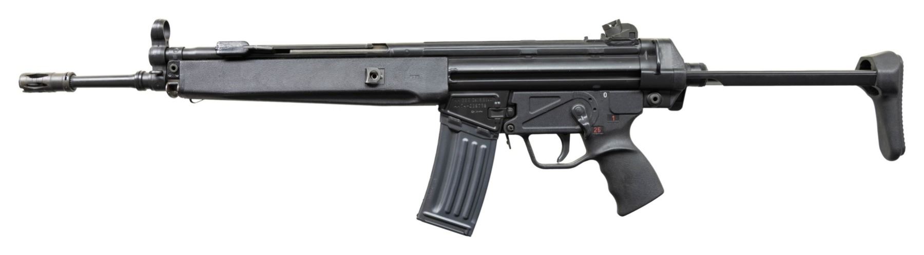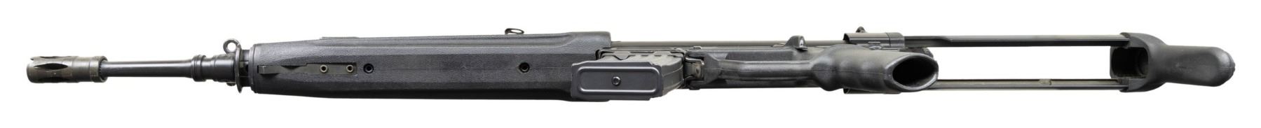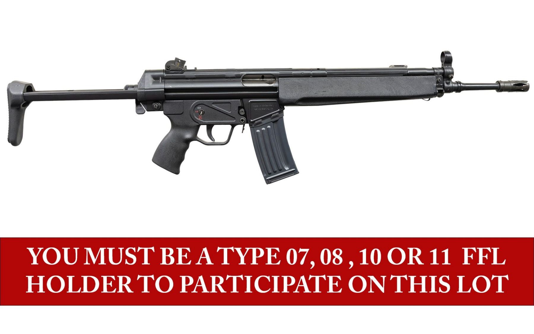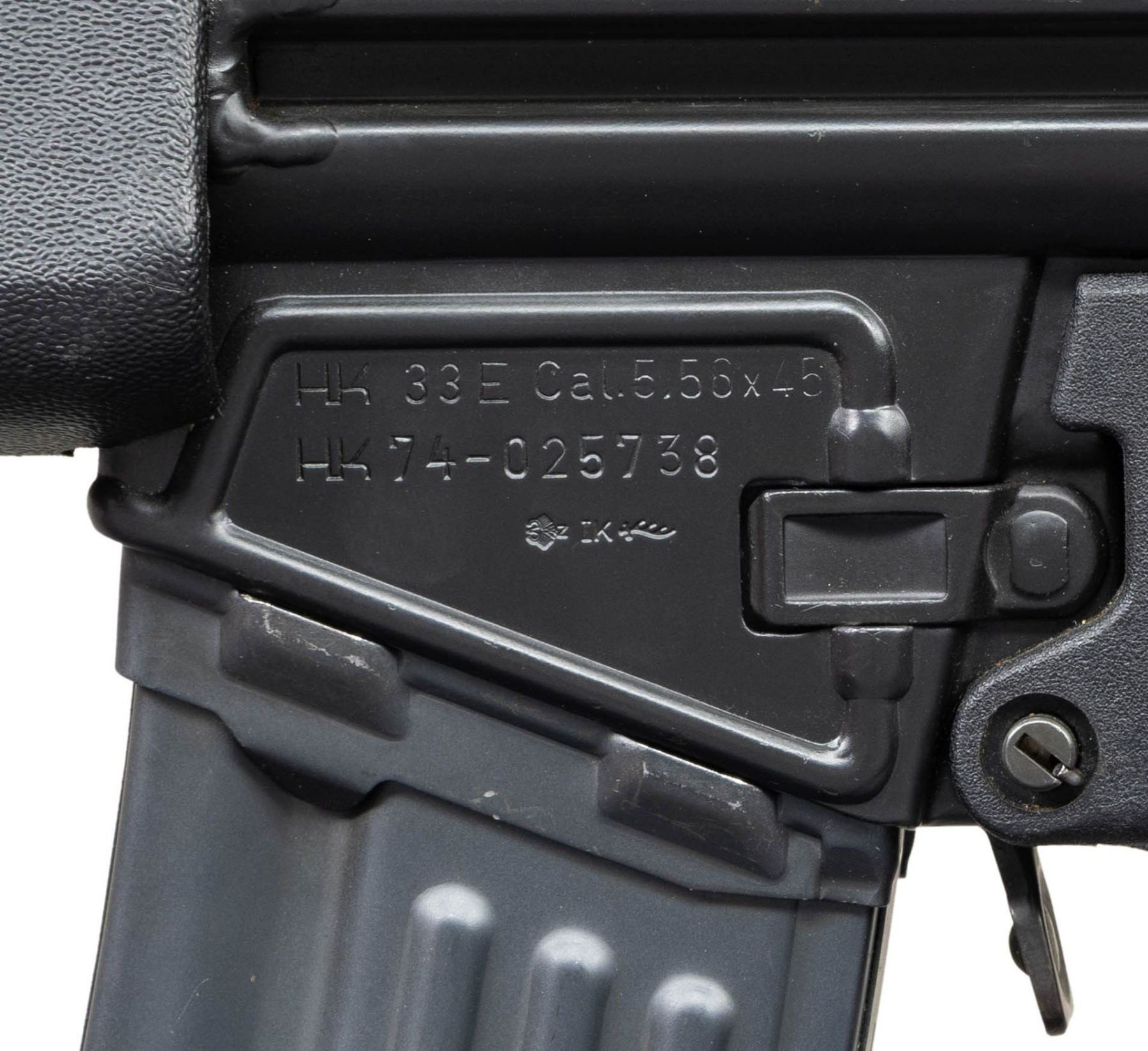 ***BIDDERS INTERESTED IN THIS LOT MUST CURRENTLY HOLD A TYPE 07, 08, 10, OR 11 FFL.*** Cal 5.56x45. S# 74-025738. Bbl 16" / pinned flash suppressor. Drum rear sight, telescopic butt stock. Left mag well is marked "HK33E CAL.5.56x45/HK74-025738/Eagle-NIK Antler Proof". Right side of mag well is marked "Made in W-Germany/HK Inc. Sterling VA". UNATTACHED ACCESSORIES: 1-25 rd factory mag. CONDITION: overall near excellent with only a couple of minor handling marks. Bright shiny bore with nice rifling. POST 1986 DEALER SAMPLE MACHINE GUN WITH NO LAW (DEMO) LETTER REQUIRED TO TRANSFER. RESTRICTED REGISTRATION POSSESSION LIMITED TO CONTINUED COMPLIANCE WITH PROVISIONS OF PUBLIC LAW 99-308. IF YOU ARE AN 07, 08, 10, or 11 FFL/SOT YOU MAY TAKE TRANSFER OF THIS FIREARM UPON APPROVAL OF TRANSFER. PROVENANCE: Military Museum Collection of Shooters Outpost, Hooksett NH. THIS ITEM WILL BE AVAILABLE FOR PREVIEW BY APPOINTMENT AT THE SHOOTERS OUTPOST MUSEUM IN HOOKSETT, NH. TO SET UP AN APPOINTMENT, PLEASE CALL 207-453-2114. (50-1909/ZAL). MODERN CLASS III. $3,000-5,000.