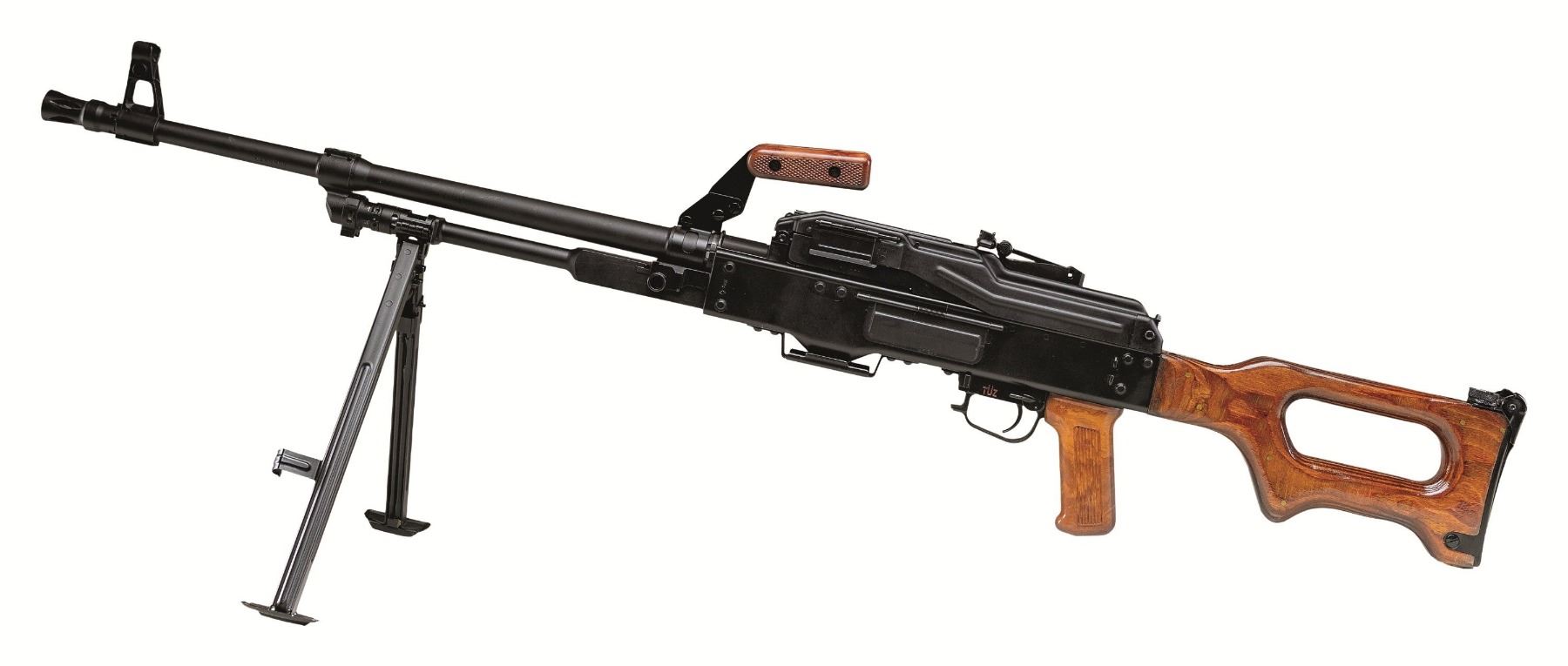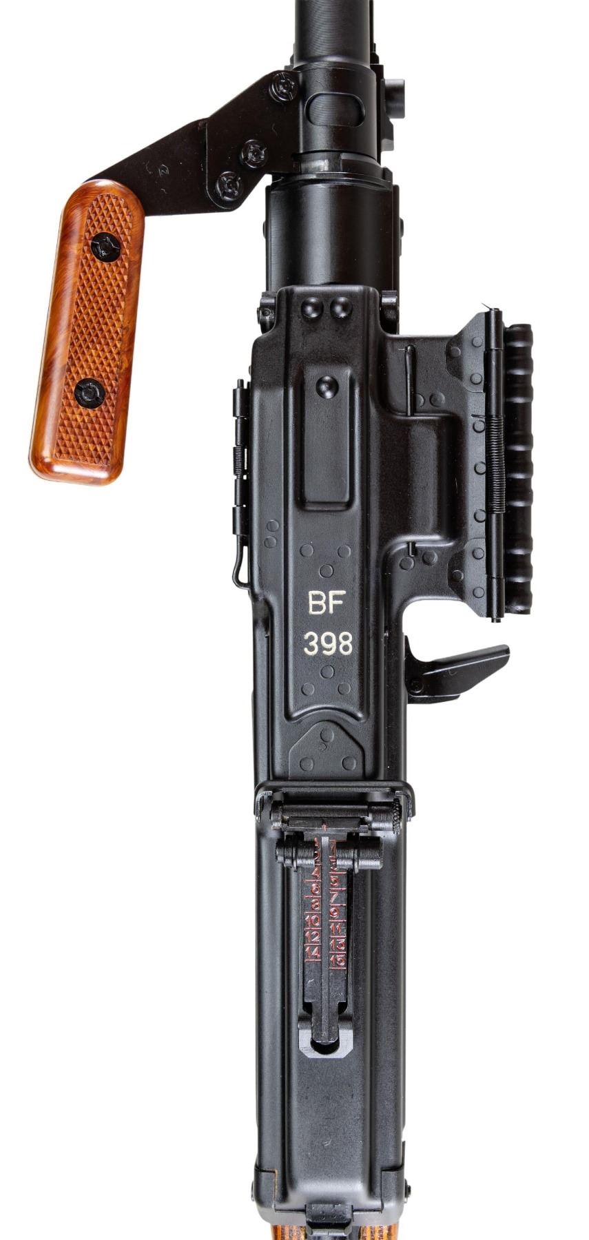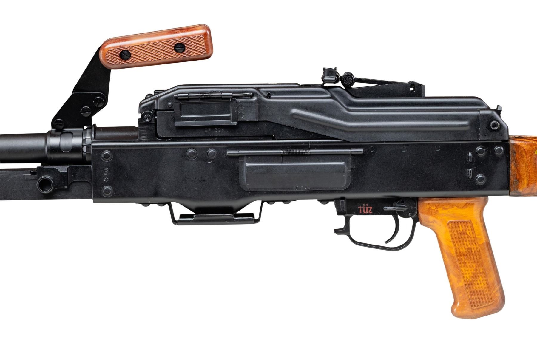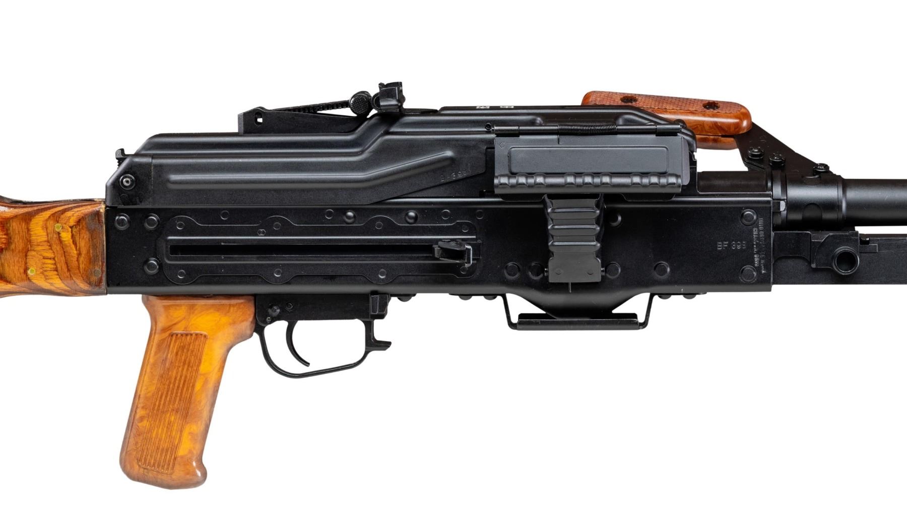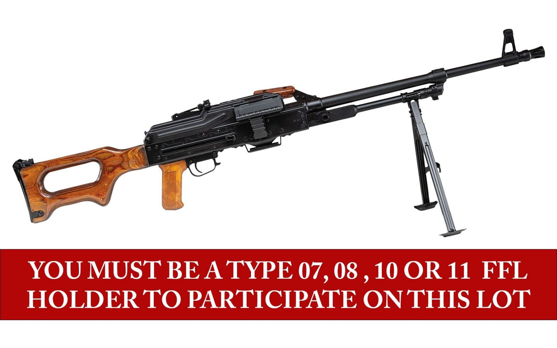 RUSSIAN PKM BELT FED MACHINE GUN. ***BIDDERS INTERESTED IN THIS LOT MUST CURRENTLY HOLD A TYPE 07, 08, 10, OR 11 FFL.*** Cal. 7.62x54R. S# BF398. Bbl. 26" over flash hider. The Russian PKM Light Machine Gun intended for infantry units, also excelling at long distance precision. All external S#'s are matching. Pinned laminate stock with folding buttplate. Composite pistol grip and carry handle. Right side of receiver is marked "Ohio Ordnance Works / Chardon, OH". Bbl marked "30HNVFA", "5173" & "7271". CONDITION: overall very fine with reapplied black hard coat finish with minimal signs of cycling and some minor handling marks in bipod area. Stock finish is very fine with only a couple of minor handling marks. Composite carry handle and pistol grip are very fine. Mint bore with very fine bolt. Mechanically sound when cycled by hand. POST 1986 DEALER SAMPLE MACHINE GUN WITH NO LAW (DEMO) LETTER REQUIRED TO TRANSFER. RESTRICTED REGISTRATION POSSESSION LIMITED TO CONTINUED COMPLIANCE WITH PROVISIONS OF PUBLIC LAW 99-308. IF YOU ARE AN 07, 08, 10, or 11 FFL/SOT YOU MAY TAKE TRANSFER OF THIS FIREARM UPON APPROVAL OF TRANSFER. PROVENANCE: Military Museum Collection of Shooters Outpost, Hooksett NH. THIS ITEM WILL BE AVAILABLE FOR PREVIEW BY APPOINTMENT AT THE SHOOTERS OUTPOST MUSEUM IN HOOKSETT, NH. TO SET UP AN APPOINTMENT, PLEASE CALL 207-453-2114. (50-1833/ZAL). MODERN CLASS III. $14,000-18,000.