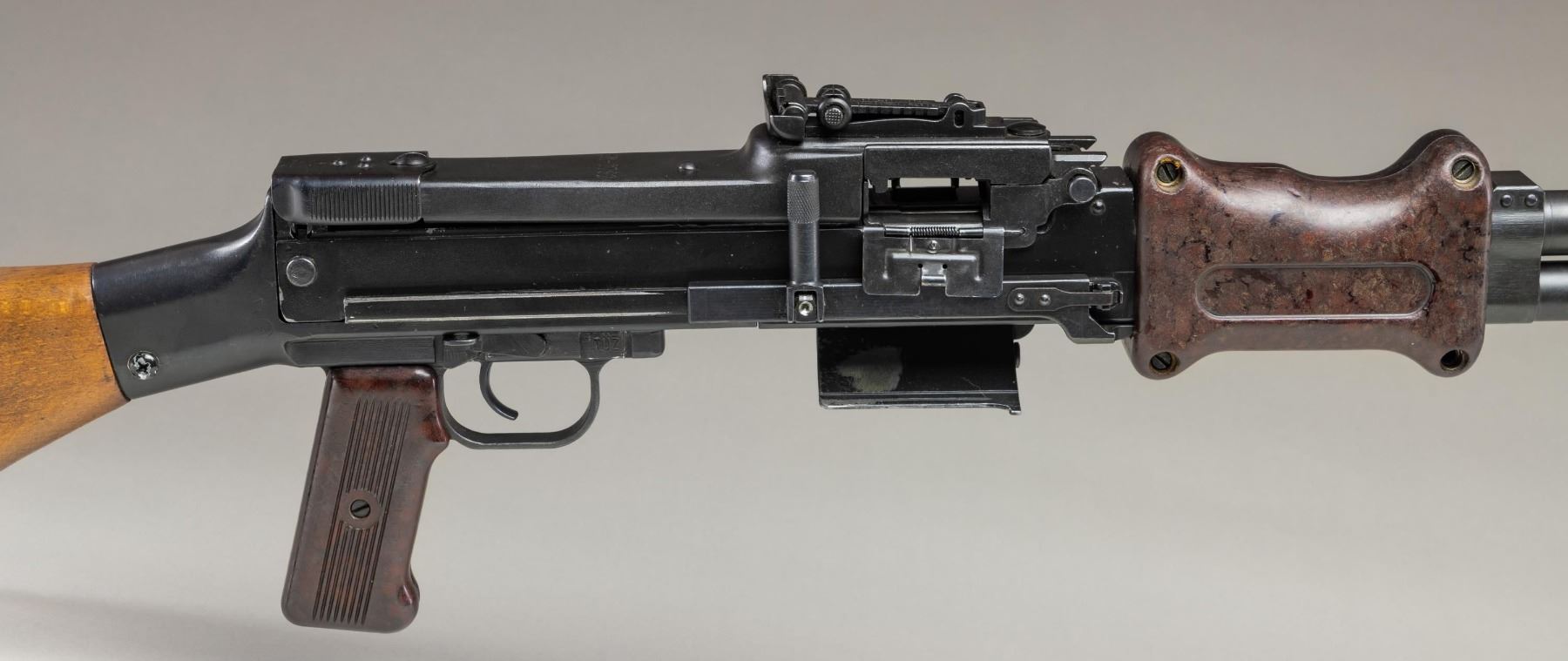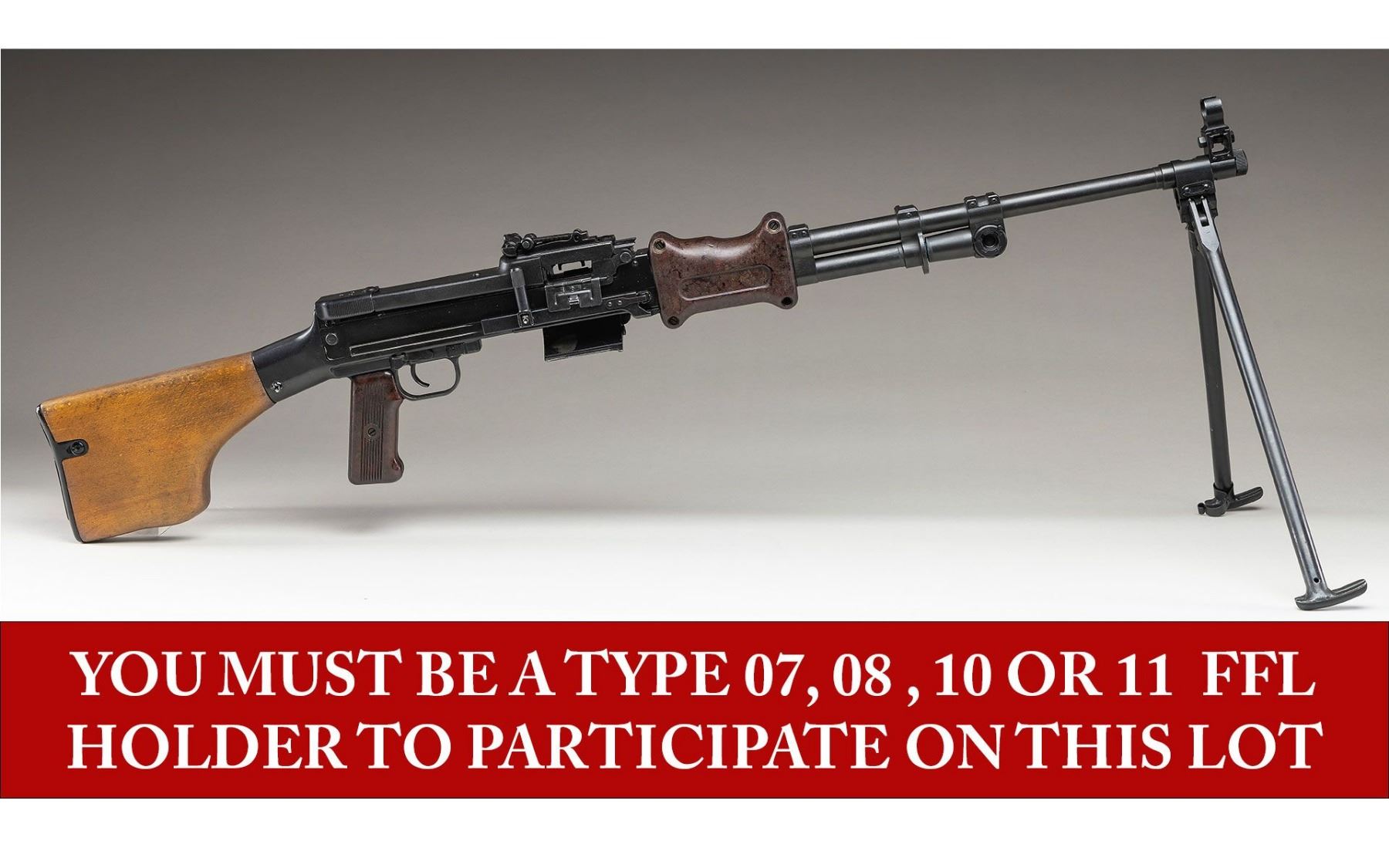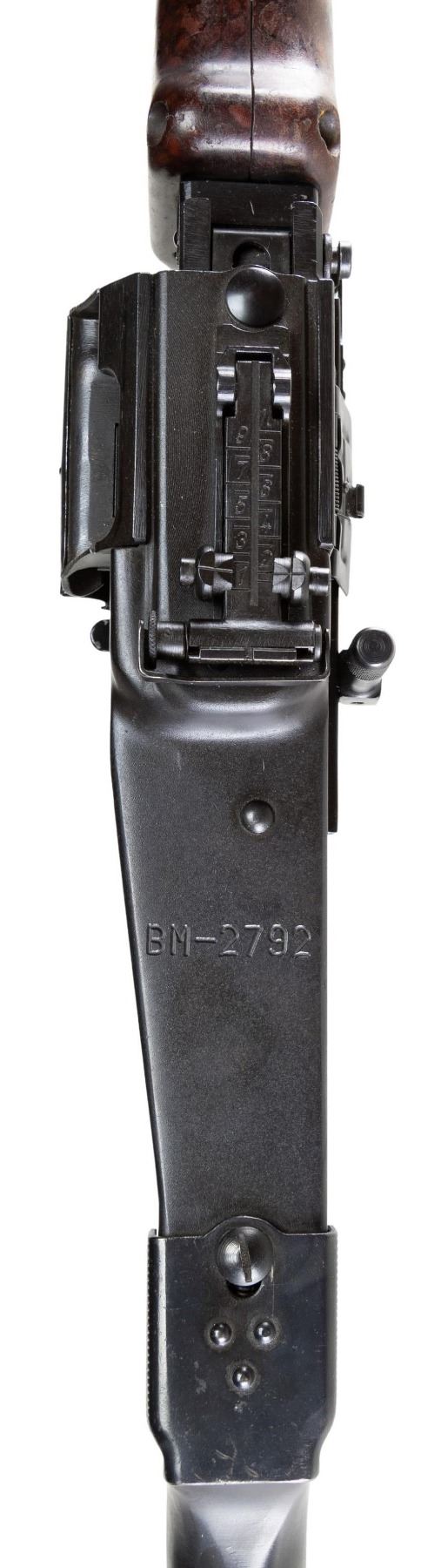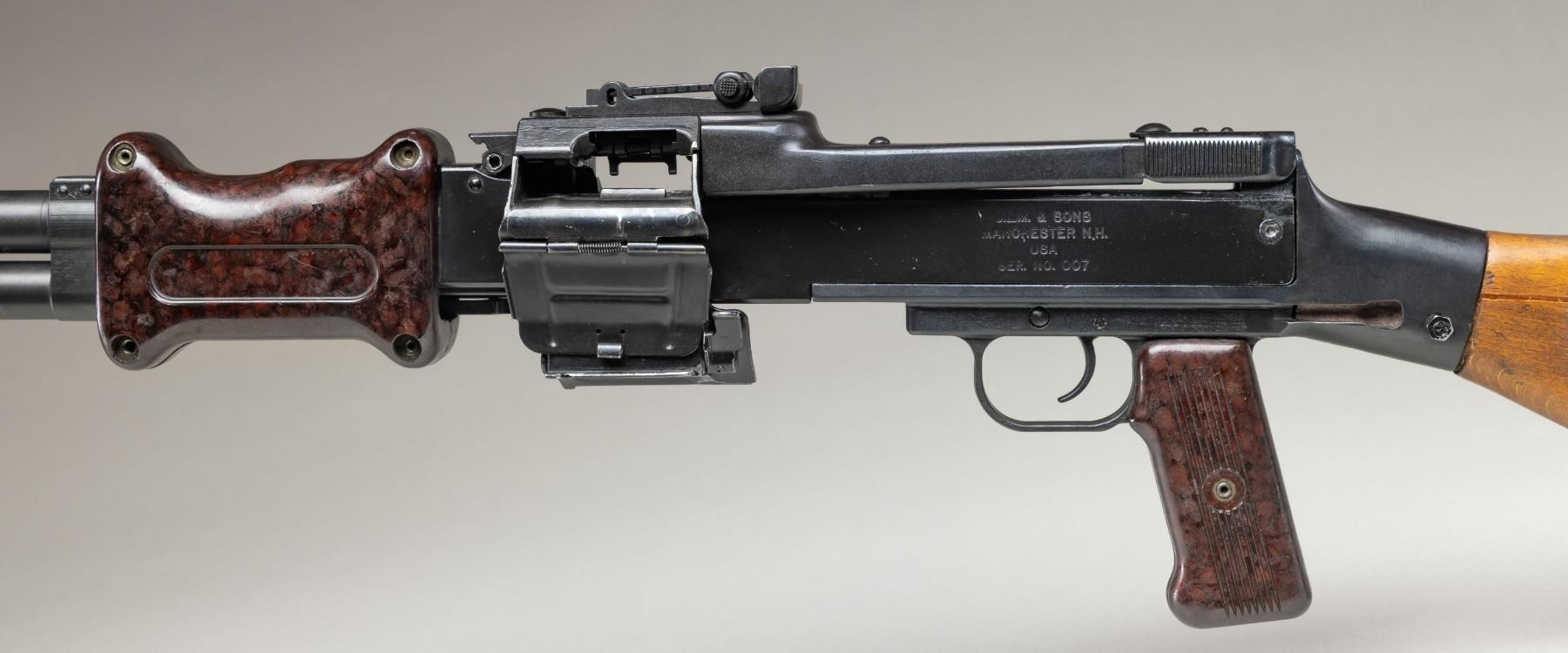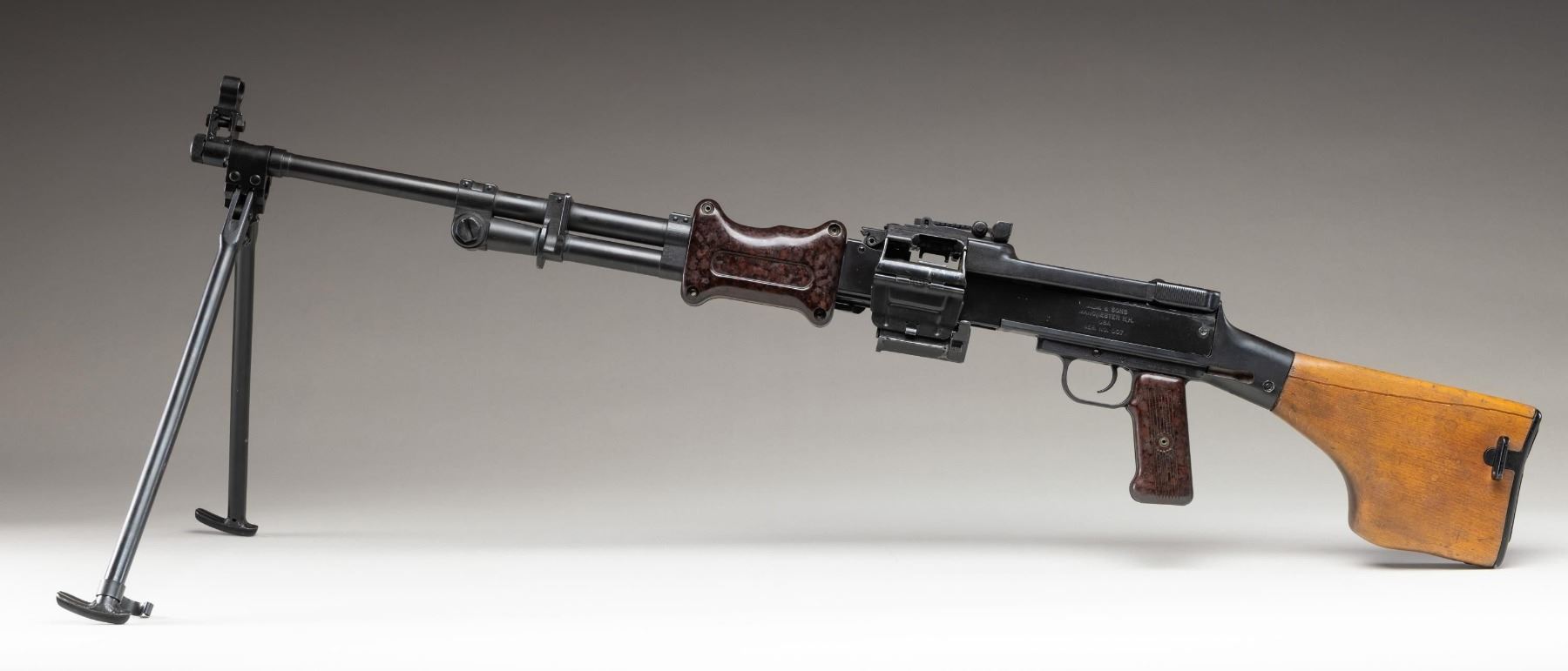 MACHINE GUN. ***BIDDERS INTERESTED IN THIS LOT MUST CURRENTLY HOLD A TYPE 07, 08, 10, OR 11 FFL.*** Cal. 7.62x39. S# 007. Bbl. 20". Rear sight graduated to 1000m. The original S# was BM-2792. All visible numbers on the original parts are matching. Left side of receiver is marked "J.L.M. & SONS / MANCHESTER N.H./ USA / SER. No. 007". Composite pistol grip and 2-pc composite hand guard. Hardwood butt with compartment steel buttplate. CONDITION: overall good with reapplied metal finish showing scattered handling marks and some action cycling wear. Composite components have scattered handling marks. Hardwood butt has a large drying crack on the left side that is partially extending to the right side of the butt. Bright bore with nice sharp rifling. POST 1986 DEALER SAMPLE MACHINE GUN WITH NO LAW (DEMO) LETTER REQUIRED TO TRANSFER. RESTRICTED REGISTRATION POSSESSION LIMITED TO CONTINUED COMPLIANCE WITH PROVISIONS OF PUBLIC LAW 99-308. IF YOU ARE AN 07, 08, 10, or 11 FFL/SOT YOU MAY TAKE TRANSFER OF THIS FIREARM UPON APPROVAL OF TRANSFER. PROVENANCE: Military Museum Collection of Shooters Outpost, Hooksett NH. THIS ITEM WILL BE AVAILABLE FOR PREVIEW BY APPOINTMENT AT THE SHOOTERS OUTPOST MUSEUM IN HOOKSETT, NH. TO SET UP AN APPOINTMENT, PLEASE CALL 207-453-2114. (50-1853/ZAL). MODERN CLASS III. $3,500-5,500.