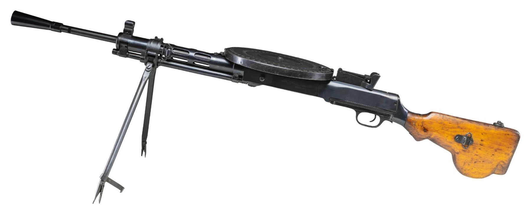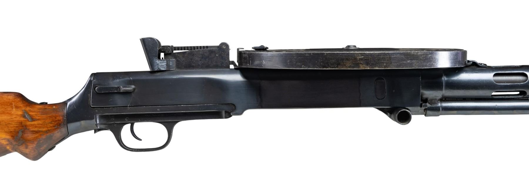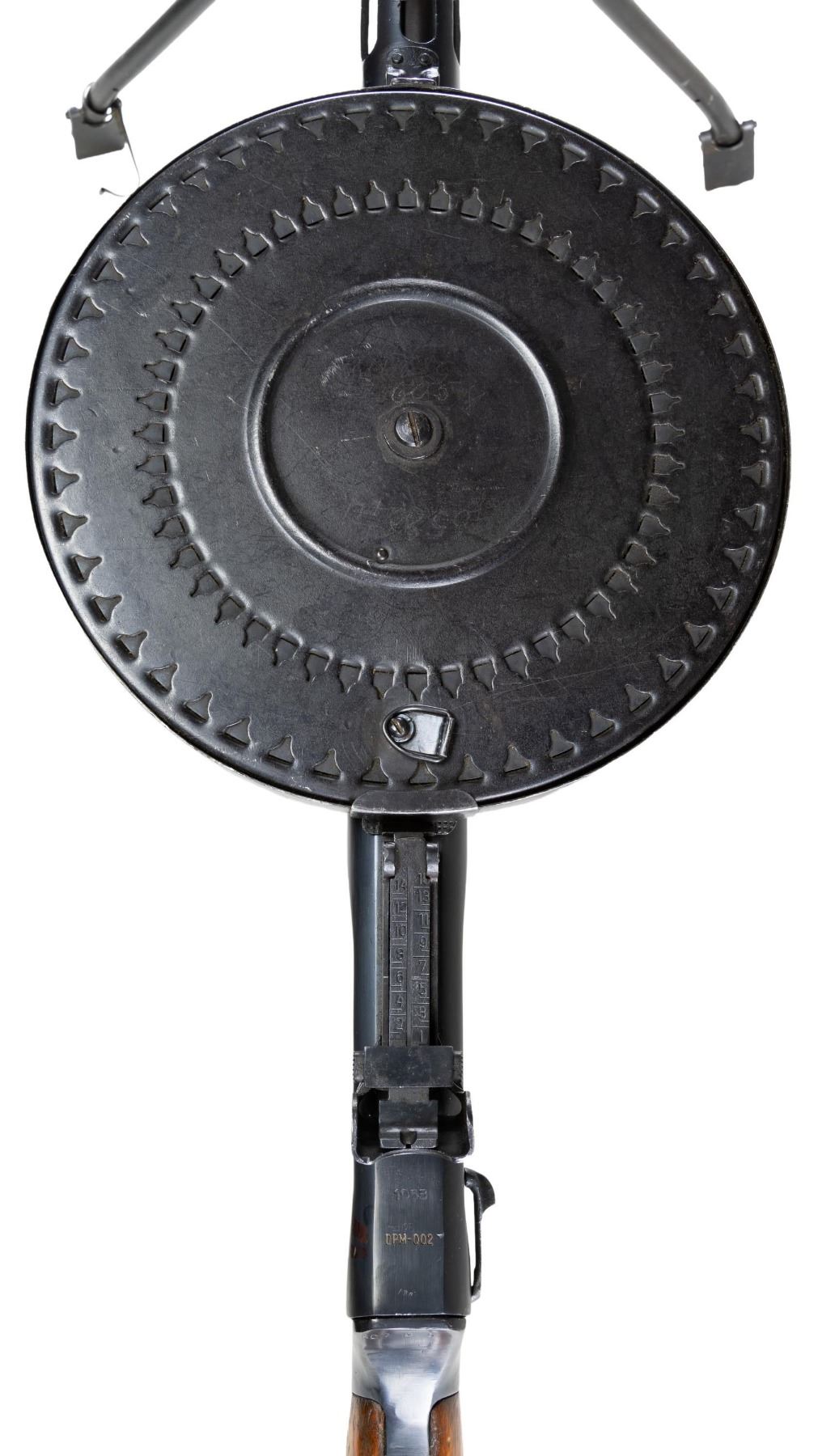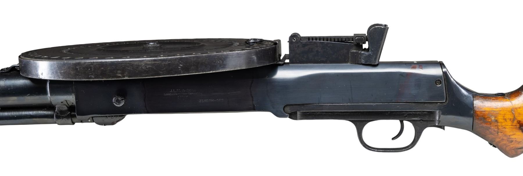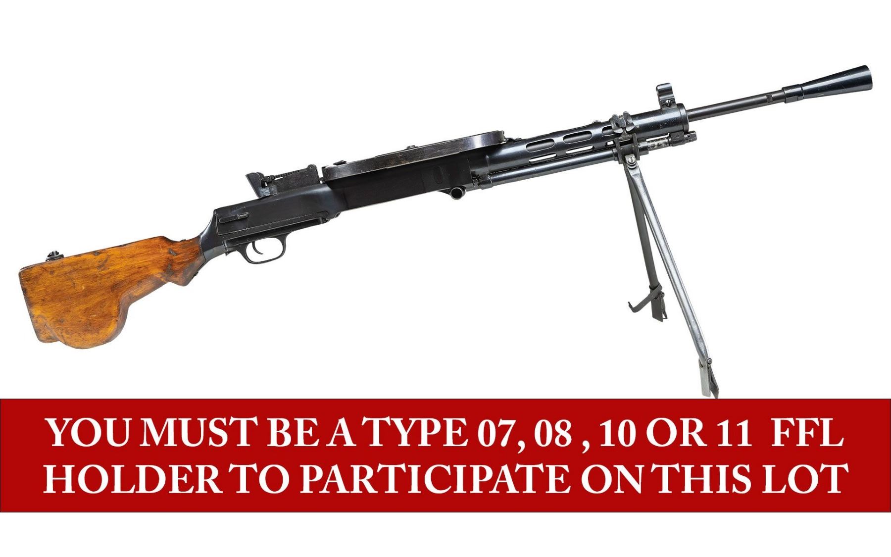 GUN. ***BIDDERS INTERESTED IN THIS LOT MUST CURRENTLY HOLD A TYPE 07, 08, 10, OR 11 FFL.*** Cal. 7.62x54R. S#JLMDPM -002. Bbl 28" over flash hider. Fixed front sight. Rear sight graduated to 1500 meters. Rewelded receiver is marked " J.L.M & Sons/Londonderry New Hampshire/ USA" on left side. Top of receiver is dated 1953. Folding bipod. Walnut stock with sling swivel. MAGS: 1- 47 round drum mag. CONDITION: overall good reapplied metal finish with scattered dings and handling marks as well as light scratches. Top has been sanded with scattered gouges and scratches. Bore is lightly frosted with spots of pitting and sharp rifling. POST 1986 DEALER SAMPLE MACHINE GUN WITH NO LAW (DEMO) LETTER REQUIRED TO TRANSFER. RESTRICTED REGISTRATION POSSESSION LIMITED TO CONTINUED COMPLIANCE WITH PROVISIONS OF PUBLIC LAW 99-308. IF YOU ARE AN 07, 08, 10, or 11 FFL/SOT YOU MAY TAKE TRANSFER OF THIS FIREARM UPON APPROVAL OF TRANSFER. PROVENANCE: Military Museum Collection of Shooters Outpost, Hooksett NH. THIS ITEM WILL BE AVAILABLE FOR PREVIEW BY APPOINTMENT AT THE SHOOTERS OUTPOST MUSEUM IN HOOKSETT, NH. TO SET UP AN APPOINTMENT, PLEASE CALL 207-453-2114. (50-1849/ZAL). 900-1,200.