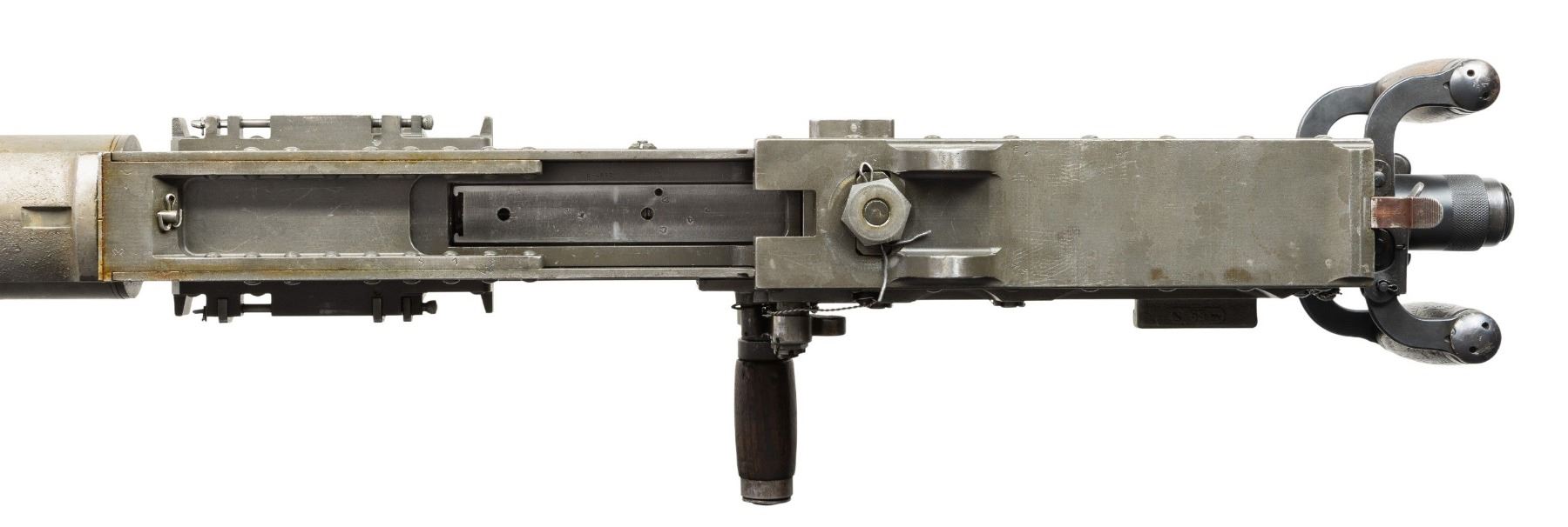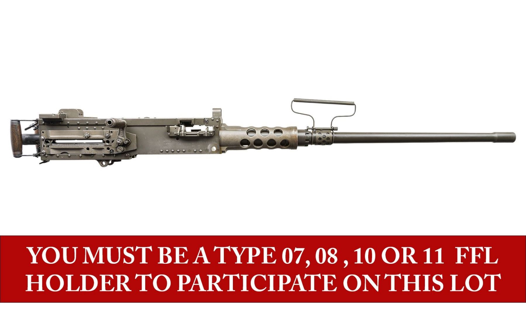 AUTO BELT FED MACHINE GUN. ***BIDDERS INTERESTED IN THIS LOT MUST CURRENTLY HOLD A TYPE 07, 08, 10, OR 11 FFL.*** Cal. 50 M2. S# 1855833. Bbl 40". Right side plate is marked "Browning Machine Gun Cal. 50 M2 / Manufactured by / AC Spark Plug Division - General Motors / Flint, Michigan U.S.A. / Patent Numbers". The right plate also carries "RIA", "EB", "ABQ" & "P" proofs. Matching number top plate with RIA. CONDITION: overall very fine with arsenal quality reparkerized finish. Very nice bright bore with nice rifling. POST 1986 DEALER SAMPLE MACHINE GUN WITH NO LAW (DEMO) LETTER REQUIRED TO TRANSFER. RESTRICTED REGISTRATION POSSESSION LIMITED TO CONTINUED COMPLIANCE WITH PROVISIONS OF PUBLIC LAW 99-308. IF YOU ARE AN 07, 08, 10, or 11 FFL/SOT YOU MAY TAKE TRANSFER OF THIS FIREARM UPON APPROVAL OF TRANSFER. PROVENANCE: Military Museum Collection of Shooters Outpost, Hooksett NH. THIS ITEM WILL BE AVAILABLE FOR PREVIEW BY APPOINTMENT AT THE SHOOTERS OUTPOST MUSEUM IN HOOKSETT, NH. TO SET UP AN APPOINTMENT, PLEASE CALL 207-453-2114. (50-1937/ZAL). MODERN CLASS III. $22,000-26,000.