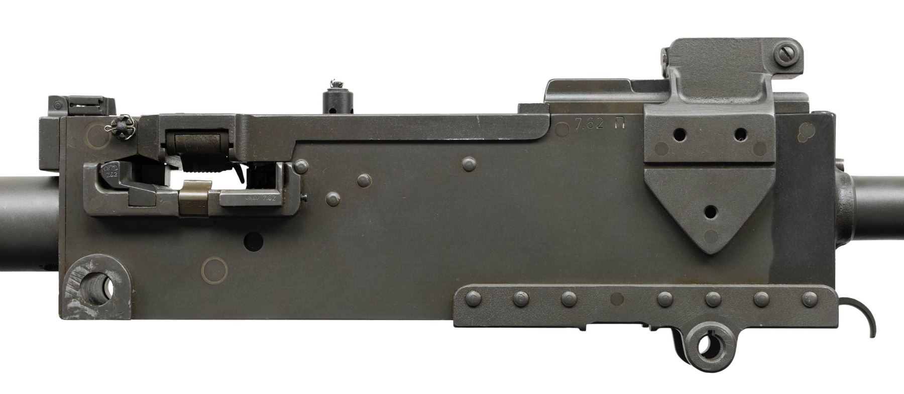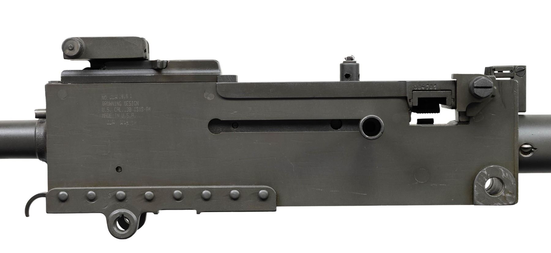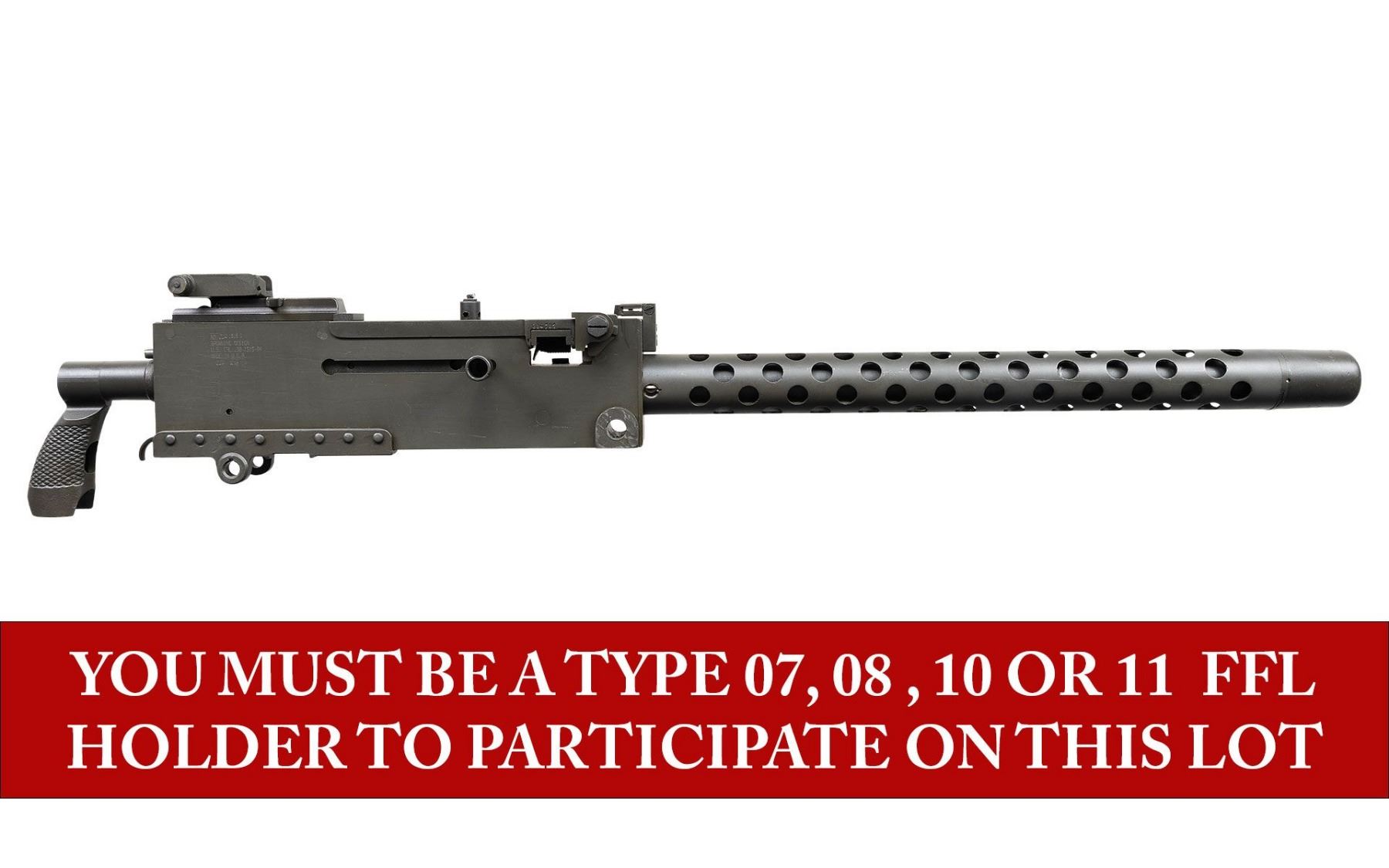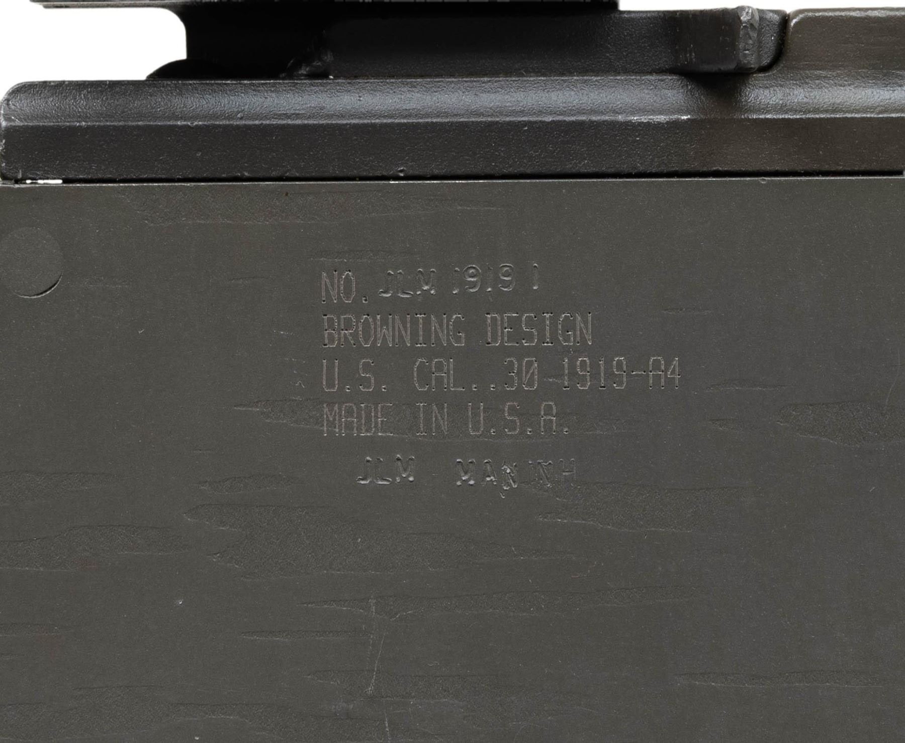 AUTO MACHINE GUN. ***BIDDERS INTERESTED IN THIS LOT MUST CURRENTLY HOLD A TYPE 07, 08, 10, OR 11 FFL.*** Cal 7.62x51. S# JLM19191. Bbl 24". The 1919 is one of the most iconic ground & vehicle mounted machine guns in U.S. Military history w/ such a long range of service, from the early 1920s through Vietnam. Right side plate is marked "No. JLM1919/Browning design/U.S. Cal. 30 1919 A4/Made in U.S.A/JLM Man NH". Left plate marked "7.62n with a P ordnance bomb proof" on top edge. Rear sight is marked "7.62" and graduated to 1800 yards. Flip up front sight. Top cover marked "384781". CONDITION: consignor states unfired after manufacture with very nice reparkerized metal finish. Showing only a few minor handling marks. Very nice bright shiny bore with sharp rifling. POST 1986 DEALER SAMPLE MACHINE GUN WITH NO LAW (DEMO) LETTER REQUIRED TO TRANSFER. RESTRICTED REGISTRATION POSSESSION LIMITED TO CONTINUED COMPLIANCE WITH PROVISIONS OF PUBLIC LAW 99-308. IF YOU ARE AN 07, 08, 10, or 11 FFL/SOT YOU MAY TAKE TRANSFER OF THIS FIREARM UPON APPROVAL OF TRANSFER. PROVENANCE: Military Museum Collection of Shooters Outpost, Hooksett NH. THIS ITEM WILL BE AVAILABLE FOR PREVIEW BY APPOINTMENT AT THE SHOOTERS OUTPOST MUSEUM IN HOOKSETT, NH. TO SET UP AN APPOINTMENT, PLEASE CALL 207-453-2114. (50-1891/ZAL). MODERN CLASS III. $3,000-5,000.