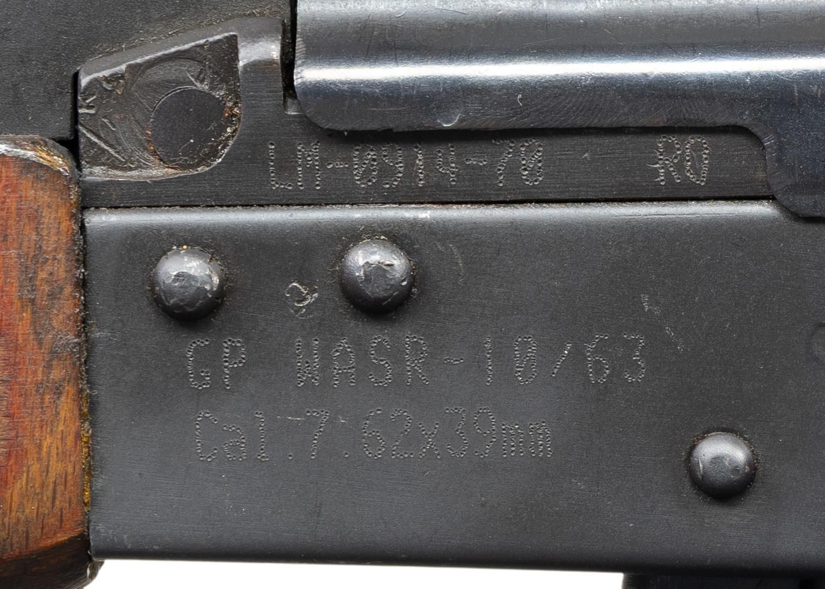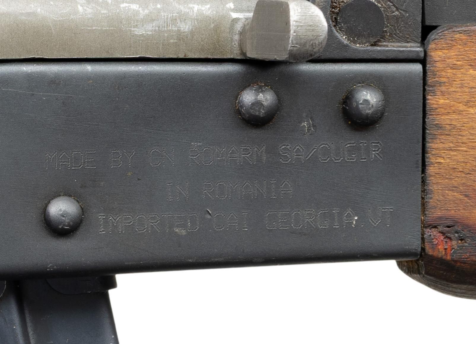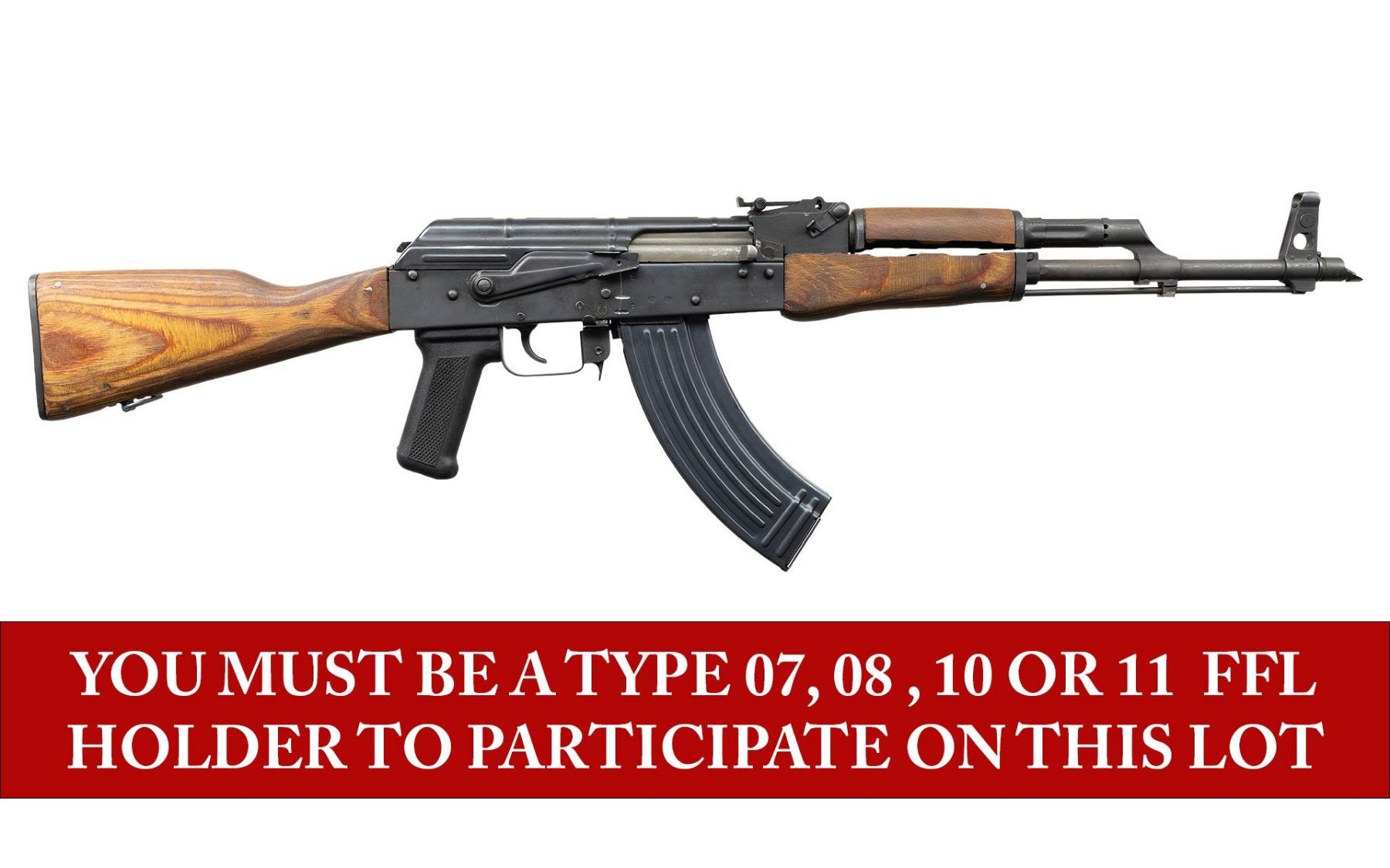 63 FULL AUTO MACHINE GUN. ***BIDDERS INTERESTED IN THIS LOT MUST CURRENTLY HOLD A TYPE 07, 08, 10, OR 11 FFL.*** Cal 7.62x39. S# LM-0914-70. Bbl 17". Rear sight graduated to 1000 meters. Left side of receiver is marked "GPWASR-10/63/CAL.7.62-39mm". Right side of receiver is marked "Made by CM ROARM SA/CUGIR/in Romania/Imported CAI Georgia, VP". Receiver belly is marked "JLM & Sons/Manchester/NH". Sight rail on the left side of receiver. Laminated forearm, hand guard and butt. Checkered hard plastic pistol grip. CONDITION: overall fair to good with arsenal type refinished metal surfaces showing some light scratches and handling marks and moderate wear. Stock has numerous handling marks and light scratches. Bright shiny bore with sharp rifling. POST 1986 DEALER SAMPLE MACHINE GUN WITH NO LAW (DEMO) LETTER REQUIRED TO TRANSFER. RESTRICTED REGISTRATION POSSESSION LIMITED TO CONTINUED COMPLIANCE WITH PROVISIONS OF PUBLIC LAW 99-308. IF YOU ARE AN 07, 08, 10, or 11 FFL/SOT YOU MAY TAKE TRANSFER OF THIS FIREARM UPON APPROVAL OF TRANSFER. PROVENANCE: Military Museum Collection of Shooters Outpost, Hooksett NH. THIS ITEM WILL BE AVAILABLE FOR PREVIEW BY APPOINTMENT AT THE SHOOTERS OUTPOST MUSEUM IN HOOKSETT, NH. TO SET UP AN APPOINTMENT, PLEASE CALL 207-453-2114. (50-1864/ZAL). MODERN CLASS III. $1,000-1,500.