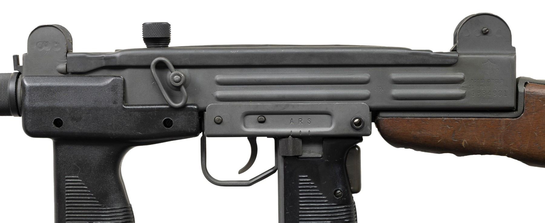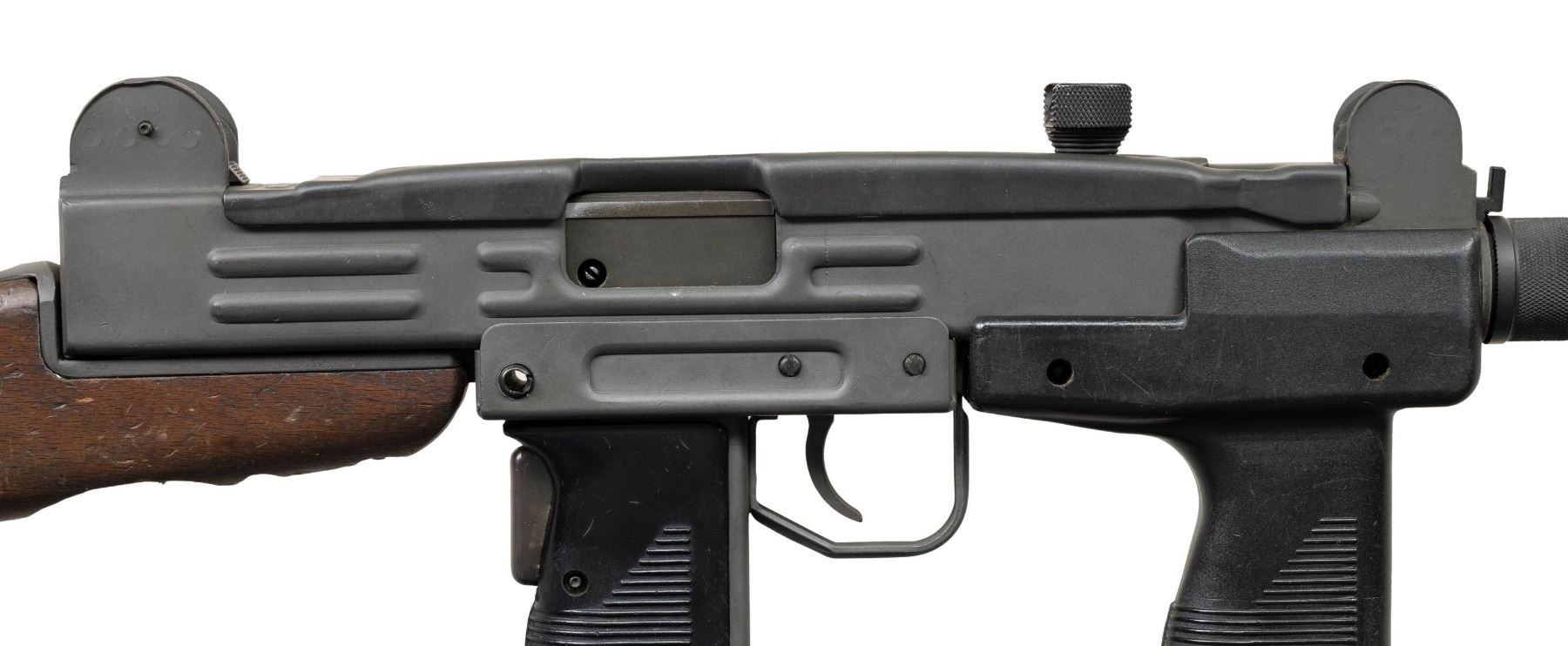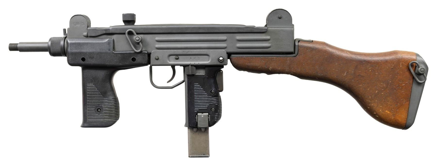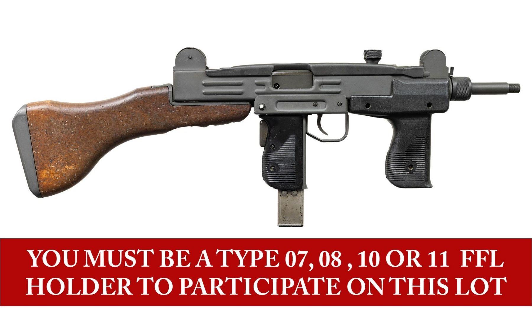 ***BIDDERS INTERESTED IN THIS LOT MUST CURRENTLY HOLD A TYPE 07, 08, 10, OR 11 FFL.*** Cal. 9mm Para. S# 9884801. Bbl 10" threaded. Left side of the receiver is marked with Israeli marking and serial number. Bottom of the receiver is marked "9mm UZI/ISRAEL" and a partially visible company marking. Detachable walnut buttstock. Hard plastic serrated vertical fore grip. MAGS: 1-25 rd. CONDITION: overall very good plus reparkerized metal finish with a few scattered minor handling marks. Stock shows numerous light shallow dings. Grips have light scratches and handling marks. Very good bright bore with some light rifling wear. Mechanically sound when cycled by hand. POST 1986 DEALER SAMPLE MACHINE GUN WITH NO LAW (DEMO) LETTER REQUIRED TO TRANSFER. RESTRICTED REGISTRATION POSSESSION LIMITED TO CONTINUED COMPLIANCE WITH PROVISIONS OF PUBLIC LAW 99-308. IF YOU ARE AN 07, 08, 10, or 11 FFL/SOT YOU MAY TAKE TRANSFER OF THIS FIREARM UPON APPROVAL OF TRANSFER. PROVENANCE: Military Museum Collection of Shooters Outpost, Hooksett NH. THIS ITEM WILL BE AVAILABLE FOR PREVIEW BY APPOINTMENT AT THE SHOOTERS OUTPOST MUSEUM IN HOOKSETT, NH. TO SET UP AN APPOINTMENT, PLEASE CALL 207-453-2114. (50-1917/ZAL). MODERN CLASS III. $1,800-2,500.
