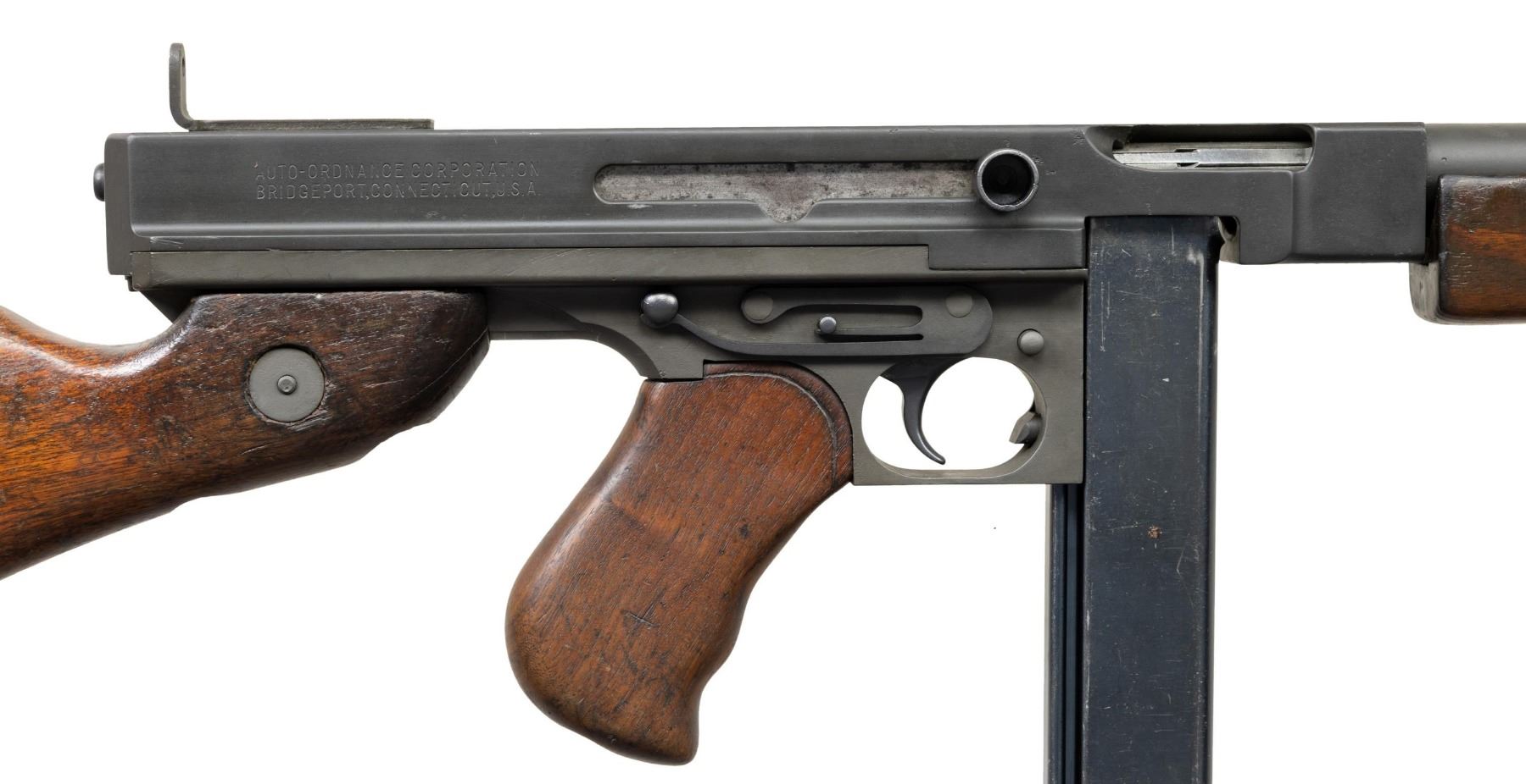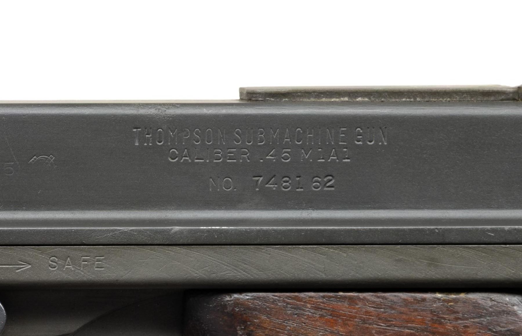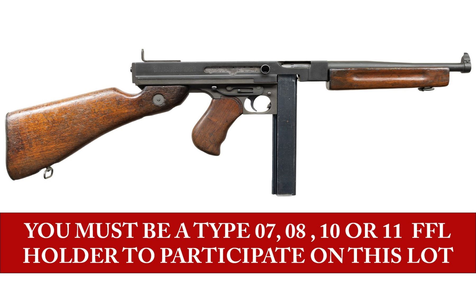 SUBMACHINE GUN. ***BIDDERS INTERESTED IN THIS LOT MUST CURRENTLY HOLD A TYPE 07, 08, 10, OR 11 FFL.*** Cal 45 ACP. S# 748162. Bbl 10.5" with punch dot E proof. F proof front sight. Fixed Lyman rear sight. Left side of receiver is marked "Thompson submachine gun/Caliber.45 M1A1/No. 748162". Top of receiver marked with Thompson trademark and "US/Property" behind rear sight. Right side of receiver is marked "Auto-Ordnance Corporation/Bridgeport Connecticut, U.S.A.". Bottom of the receiver is marked "IA-CO.SAC CA". Finger groove walnut forearm with swing swivel and marked "M". Trigger guard number "601030". Walnut pistol grip. Walnut buttstock with swing swivel and smooth steel compartmentalized buttplate with handwritten "miss m. cyti" on left side of butt. S marked bolt. MAGS: 1-30 rd. CONDITION: overall very good reparkerized metal finish with some areas of pitting on receiver, barrel, cocking knob and trigger grouping. Sanded and refinished forearm with added varnish. Lightly frosted bore with moderately worn rifling. POST 1986 DEALER SAMPLE MACHINE GUN WITH NO LAW (DEMO) LETTER REQUIRED TO TRANSFER. RESTRICTED REGISTRATION POSSESSION LIMITED TO CONTINUED COMPLIANCE WITH PROVISIONS OF PUBLIC LAW 99-308. IF YOU ARE AN 07, 08, 10, or 11 FFL/SOT YOU MAY TAKE TRANSFER OF THIS FIREARM UPON APPROVAL OF TRANSFER. PROVENANCE: Military Museum Collection of Shooters Outpost, Hooksett NH. THIS ITEM WILL BE AVAILABLE FOR PREVIEW BY APPOINTMENT AT THE SHOOTERS OUTPOST MUSEUM IN HOOKSETT, NH. TO SET UP AN APPOINTMENT, PLEASE CALL 207-453-2114. (50-1913/ZAL). MODERN CLASS III. $2,500-3,500.