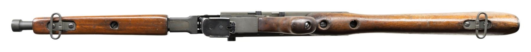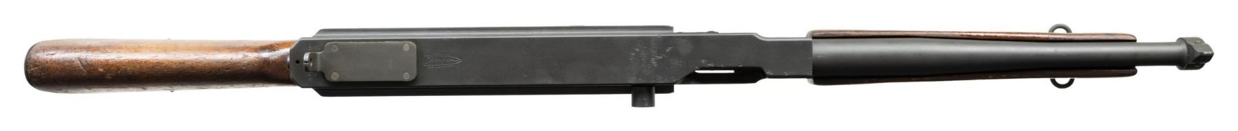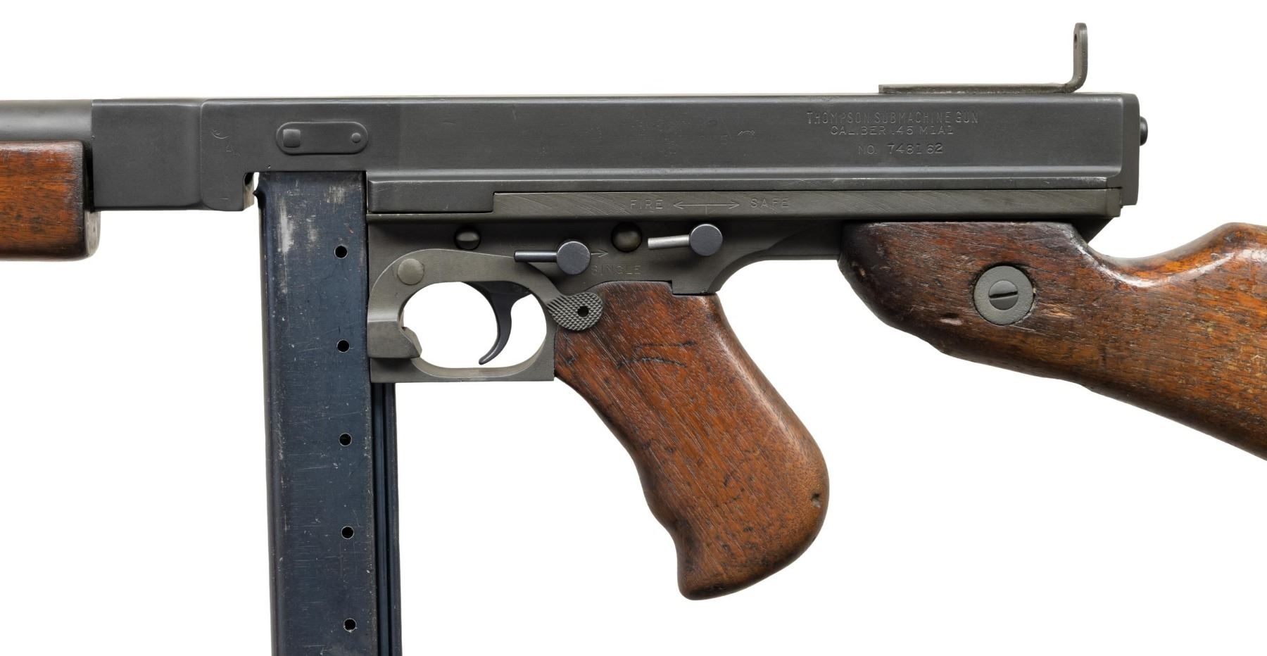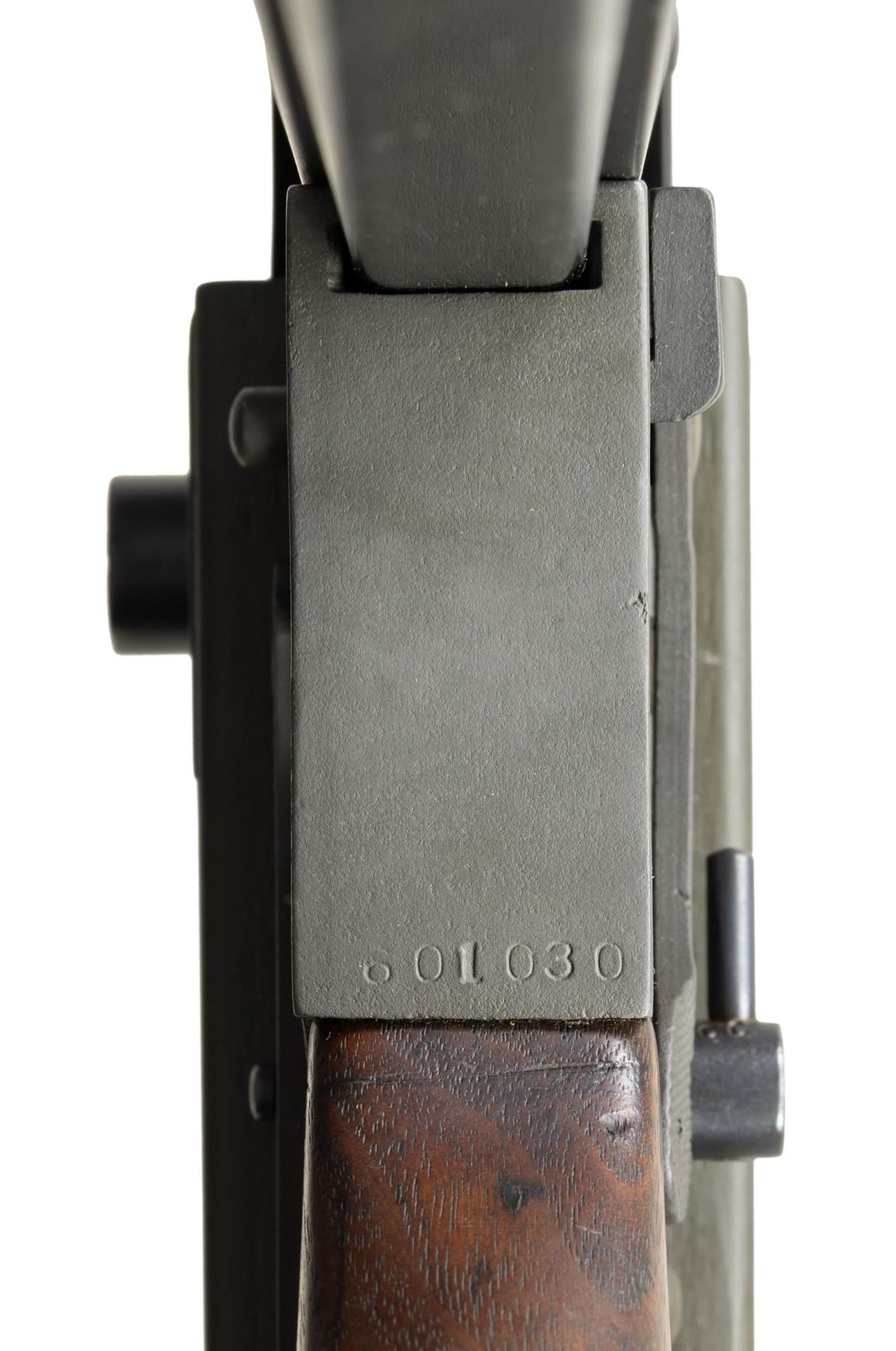 SUBMACHINE GUN. ***BIDDERS INTERESTED IN THIS LOT MUST CURRENTLY HOLD A TYPE 07, 08, 10, OR 11 FFL.*** Cal 45 ACP. S# 748162. Bbl 10.5" with punch dot E proof. F proof front sight. Fixed Lyman rear sight. Left side of receiver is marked "Thompson submachine gun/Caliber.45 M1A1/No. 748162". Top of receiver marked with Thompson trademark and "US/Property" behind rear sight. Right side of receiver is marked "Auto-Ordnance Corporation/Bridgeport Connecticut, U.S.A.". Bottom of the receiver is marked "IA-CO.SAC CA". Finger groove walnut forearm with swing swivel and marked "M". Trigger guard number "601030". Walnut pistol grip. Walnut buttstock with swing swivel and smooth steel compartmentalized buttplate with handwritten "miss m. cyti" on left side of butt. S marked bolt. MAGS: 1-30 rd. CONDITION: overall very good reparkerized metal finish with some areas of pitting on receiver, barrel, cocking knob and trigger grouping. Sanded and refinished forearm with added varnish. Lightly frosted bore with moderately worn rifling. POST 1986 DEALER SAMPLE MACHINE GUN WITH NO LAW (DEMO) LETTER REQUIRED TO TRANSFER. RESTRICTED REGISTRATION POSSESSION LIMITED TO CONTINUED COMPLIANCE WITH PROVISIONS OF PUBLIC LAW 99-308. IF YOU ARE AN 07, 08, 10, or 11 FFL/SOT YOU MAY TAKE TRANSFER OF THIS FIREARM UPON APPROVAL OF TRANSFER. PROVENANCE: Military Museum Collection of Shooters Outpost, Hooksett NH. THIS ITEM WILL BE AVAILABLE FOR PREVIEW BY APPOINTMENT AT THE SHOOTERS OUTPOST MUSEUM IN HOOKSETT, NH. TO SET UP AN APPOINTMENT, PLEASE CALL 207-453-2114. (50-1913/ZAL). MODERN CLASS III. $2,500-3,500.